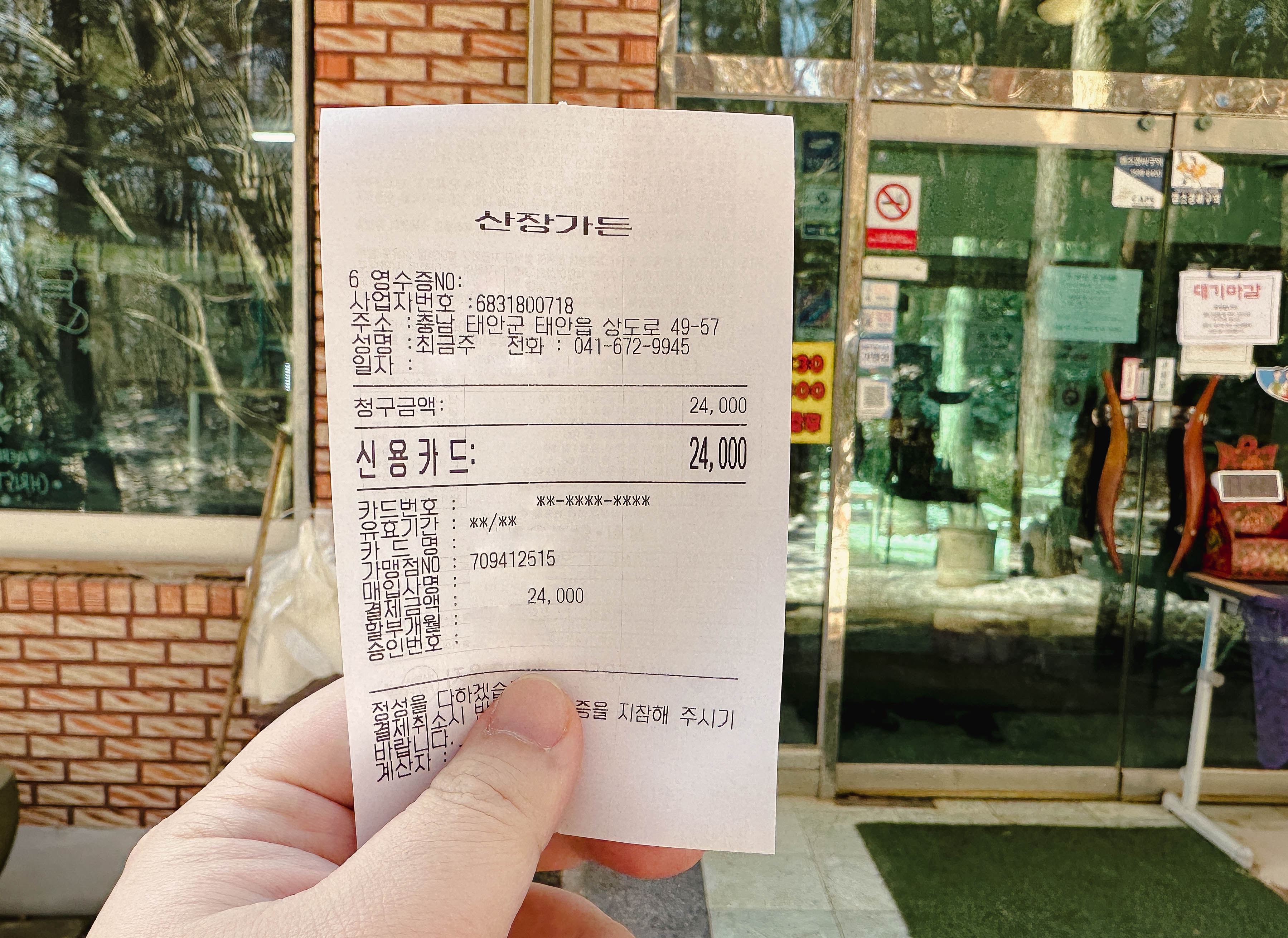 태안 숨은 가성비 한정식 맛집 산장가든의 2인 식사비용은 각각 12,000원으로 합계 24,000원이 나왔습니다. 간이 전체적으로 심심한 것을 빼면 메뉴랑 가격 모두 나쁘지 않았던 가게입니다. 저는 특히 두부강정이랑, 해물파전, 갓장아찌가 마음에 들었습니다. 관심 있으신 분은 한 번 이용해보셔도 좋을 것 같습니다.