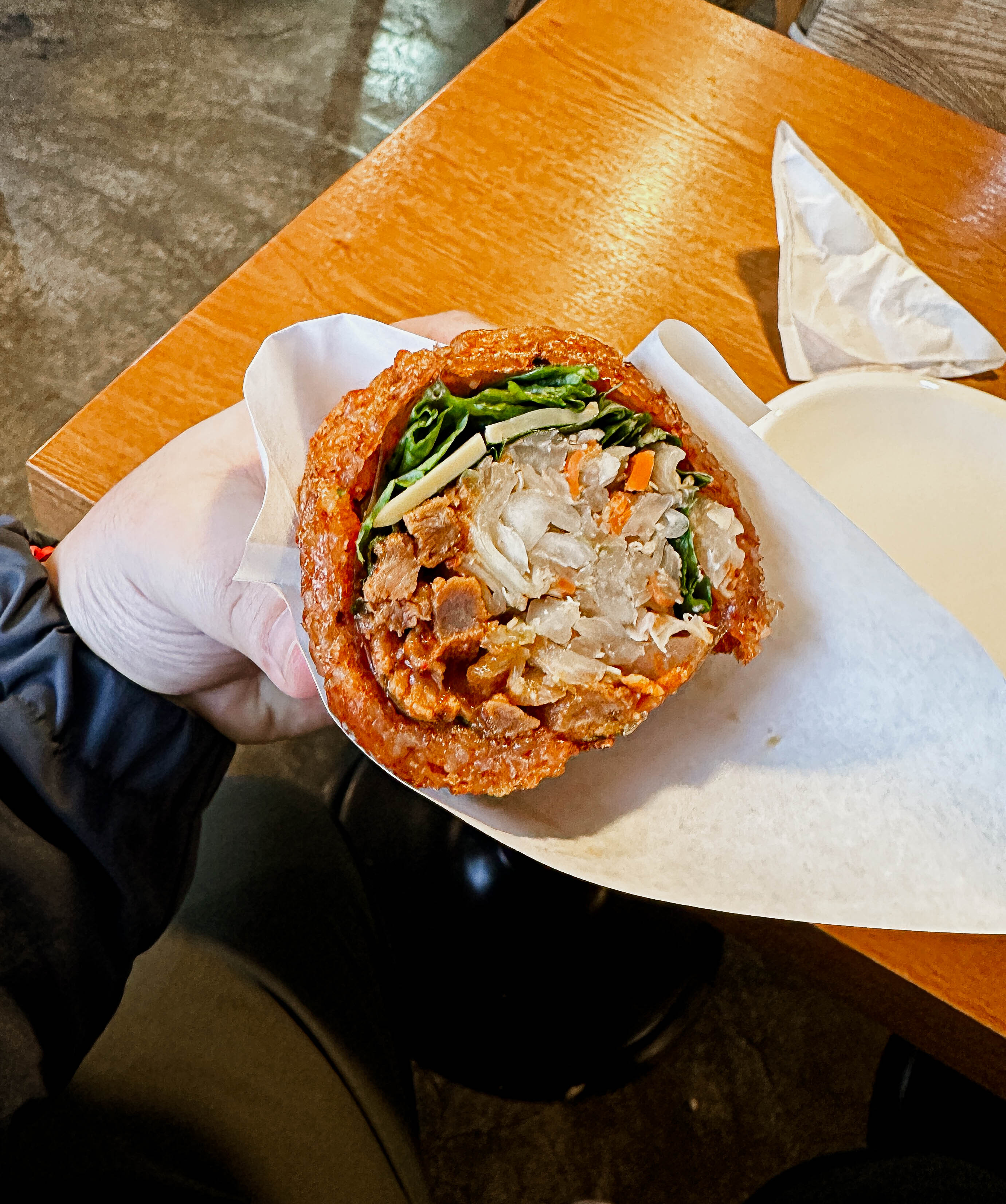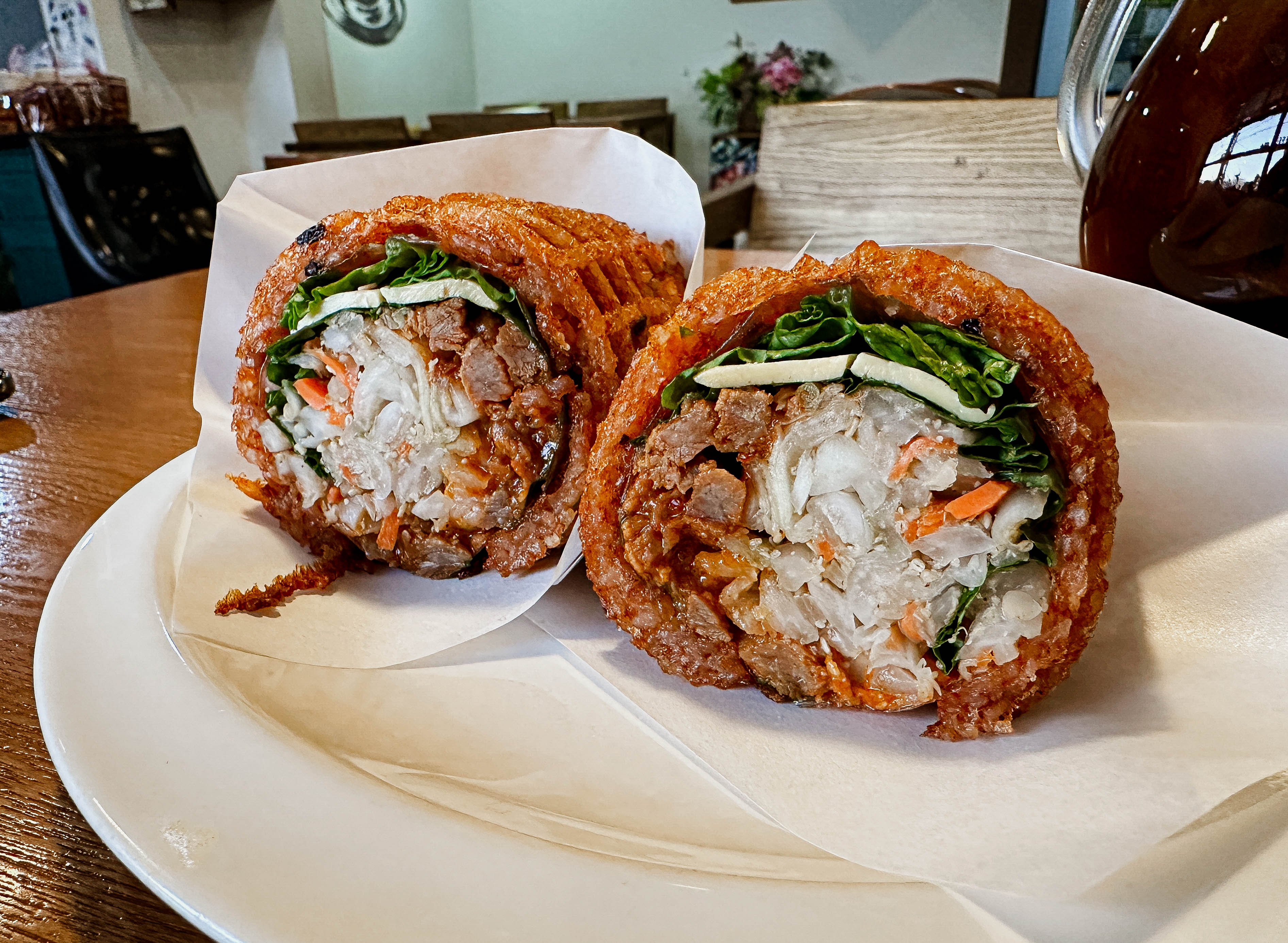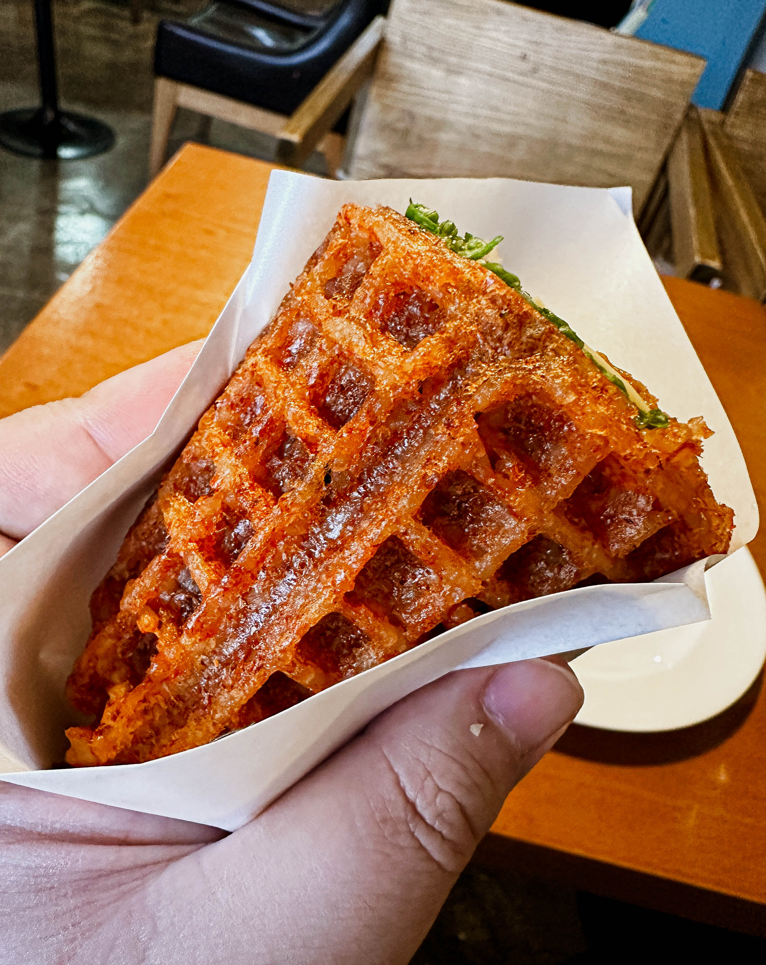 곧이어 메뉴가 나왔습니다. 비빔밥와플은 와플팬에 구워낸 매콤한 양념밥에 배추, 당근, 양상추, 고기를 넣은 케밥 형태의 메뉴였습니다. 두 개의 조각으로 나오는데, 한 조각당 양이 꽤 많아서 둘이서 나눠 먹어도 괜찮을 것 같더라고요.