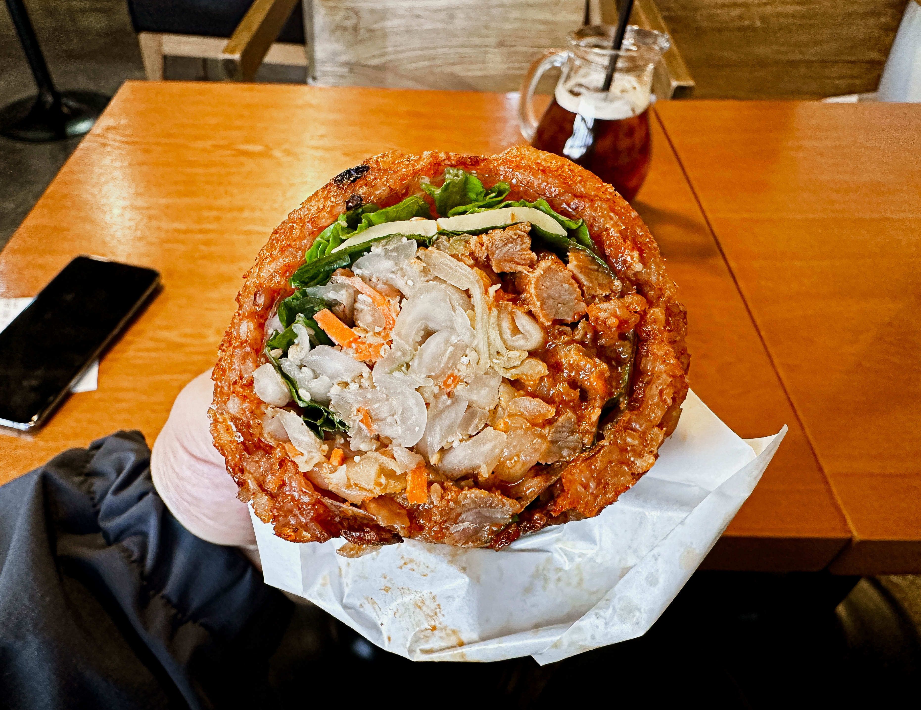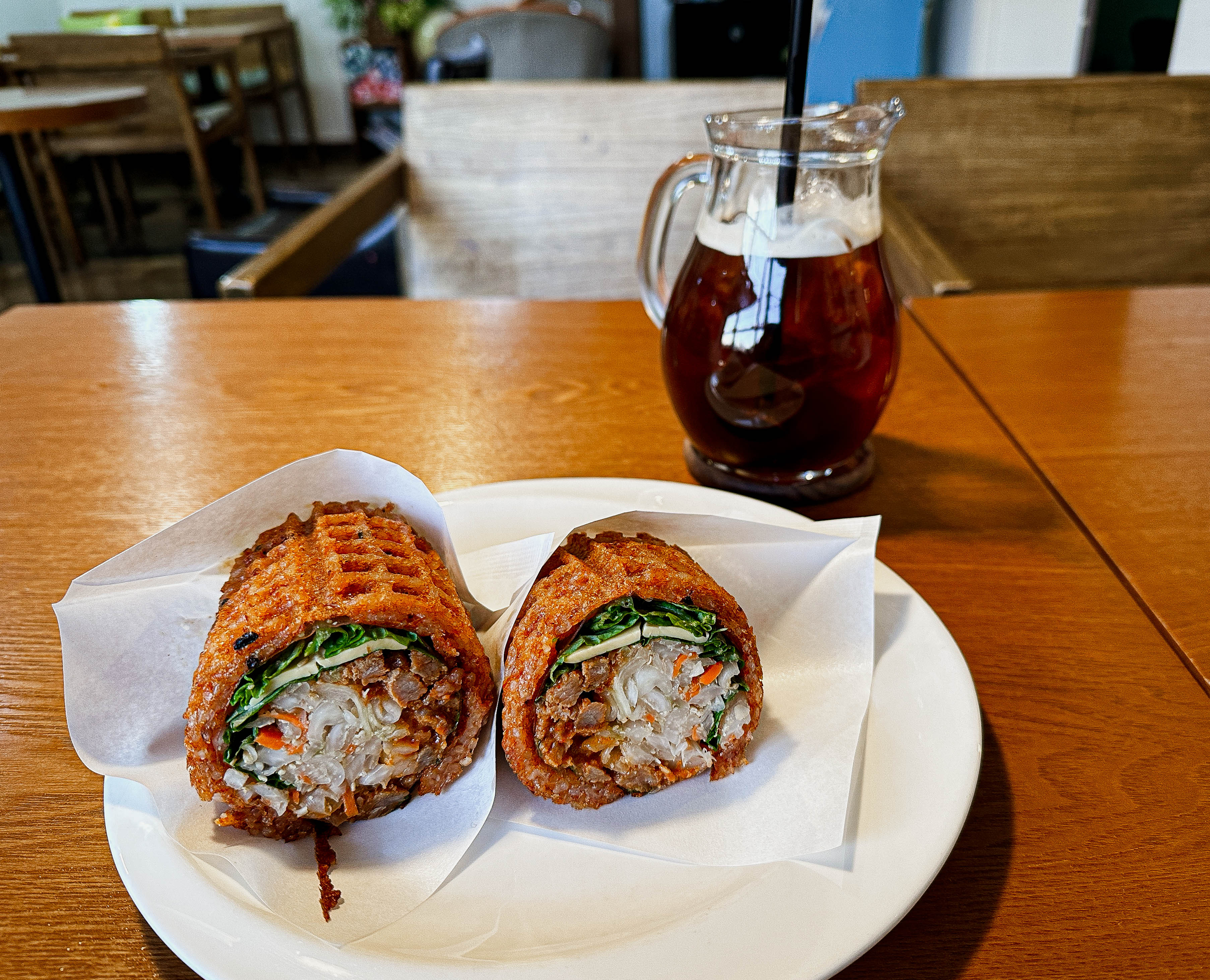 곧이어 메뉴가 나왔습니다. 비빔밥와플은 와플팬에 구워낸 매콤한 양념밥에 배추, 당근, 양상추, 고기를 넣은 케밥 형태의 메뉴였습니다. 두 개의 조각으로 나오는데, 한 조각당 양이 꽤 많아서 둘이서 나눠 먹어도 괜찮을 것 같더라고요.