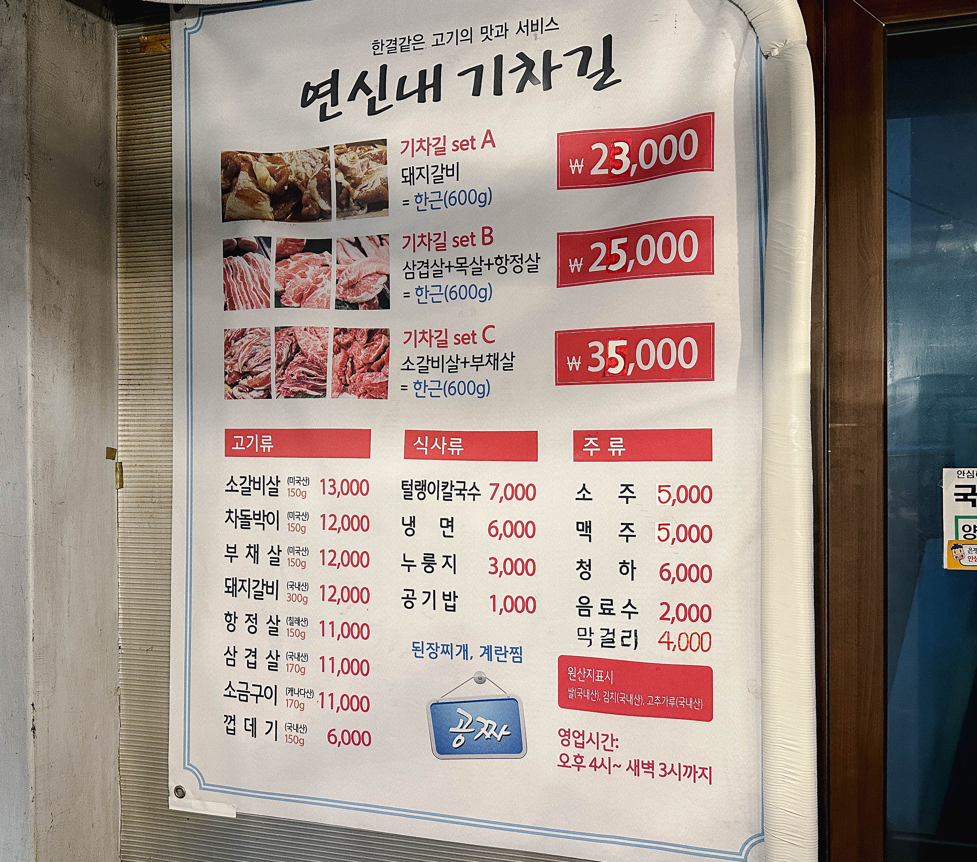 소갈빗살 전문점 연신내기차길은 서울 은평구 갈현동 404-25, 1층 에 위치해 있었습니다. 영업시간은 16:00~03:00 까지였으며, 주차공간이 협소한 편이라 대부분 가게 옆에 주차하거나 차량 1~ 2대가 들어갈 정도의 주차장에 주차를 해야 했습니다. 메뉴는 기차길세트, 소갈비살, 차돌박이, 부채살, 돼지갈비, 항정살, 삼겹살, 소금구이, 껍데기, 털랭이칼국수, 냉면, 누룽지 등이 있었습니다. 메뉴를 주문하면 된장찌개와 계란찜을 서비스로 주고 있었습니다.