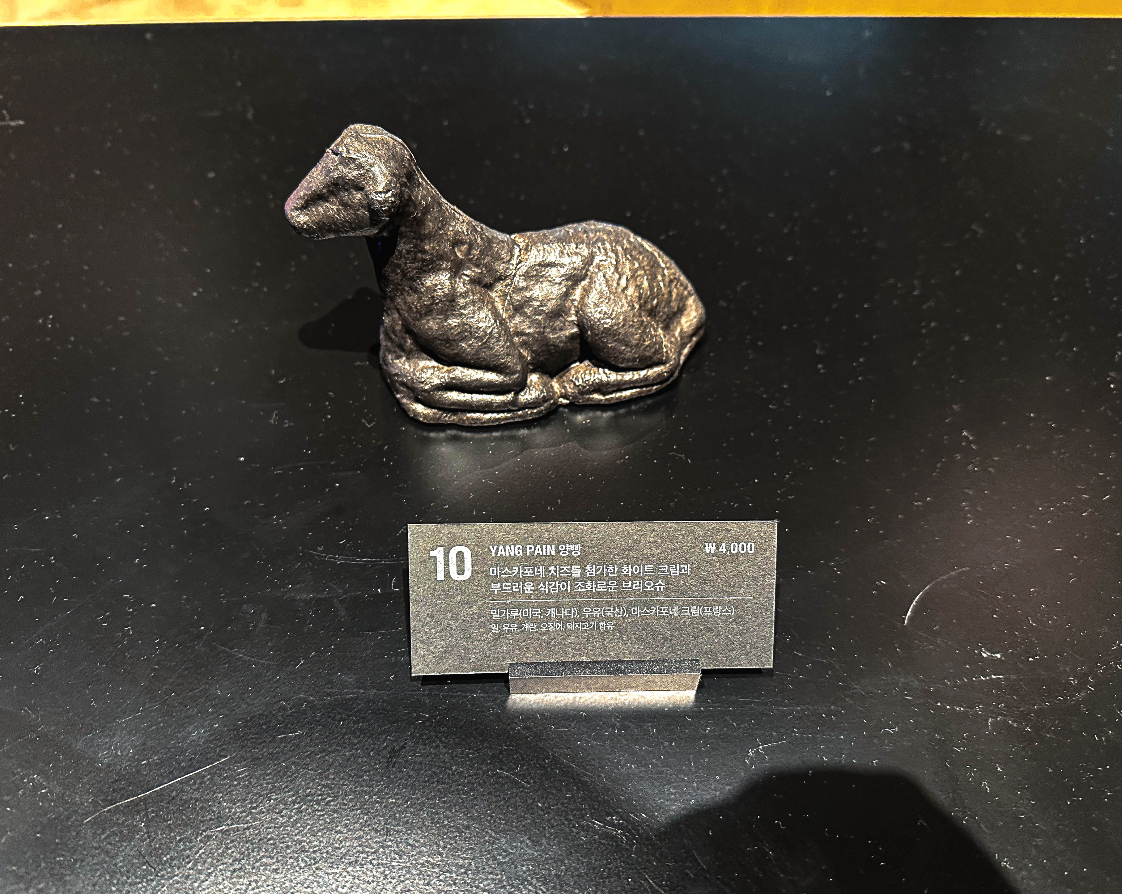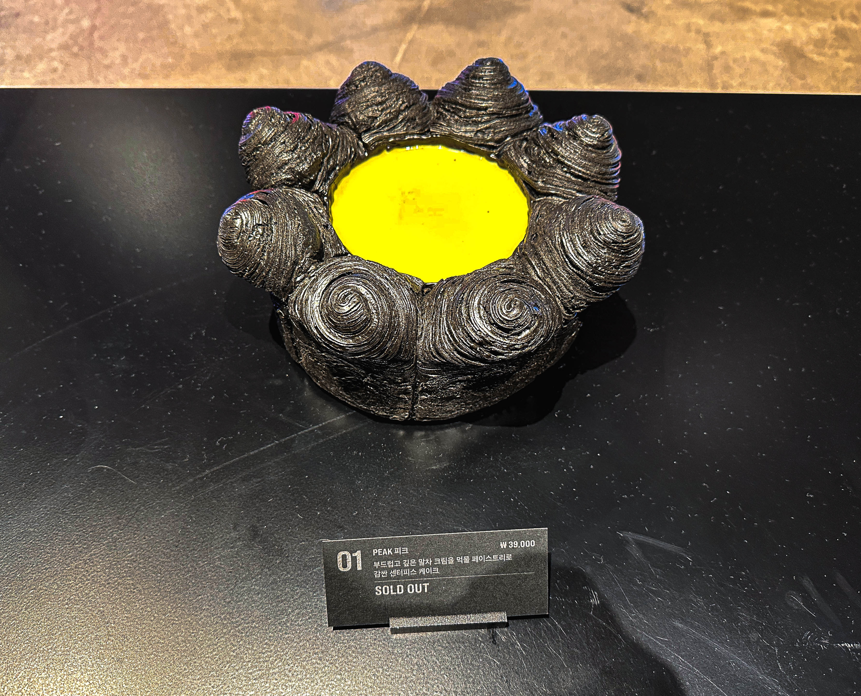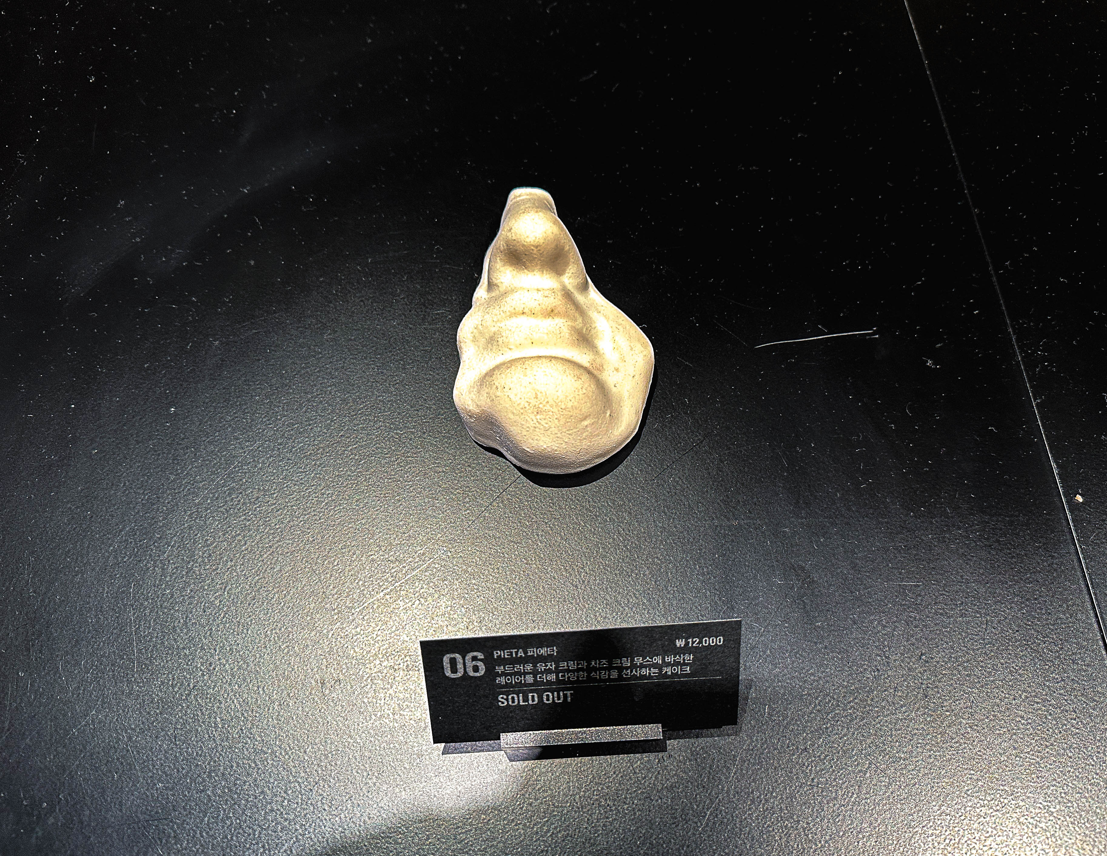 지하에 내려가면 디저트들이 마치 미술관의 전시품을 감상하는 듯하게 전시되어 있었습니다. 디저트 카페답게 주로 단 맛이 나는 빵을 판매하고 있었고, 케이크는 약 4만 원으로 크기에 비해 가격이 좀 비싼 느낌이 있었습니다. 그 밖에도 피에타, 양빵, 그라운드 등 모양도 특이하고 새로웠습니다.