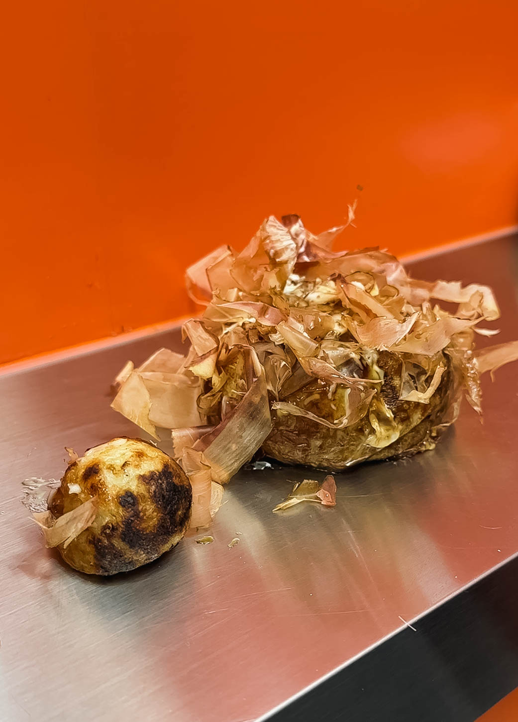 바쿠단야끼의 타코야끼는 오징어, 바지락, 메추리알, 텐가스, 소시지, 버섯, 옥수수콘, 떡, 홍생강, 양배추가 들어갔다고 합니다. 우리가 흔히 먹어본 타코야끼는 바삭한 호두과자 크기인데, 바쿠단야끼의 타코야끼는 크기가 커서 그런지 내용물은 오코노미야끼 먹는 느낌이 들었습니다.
