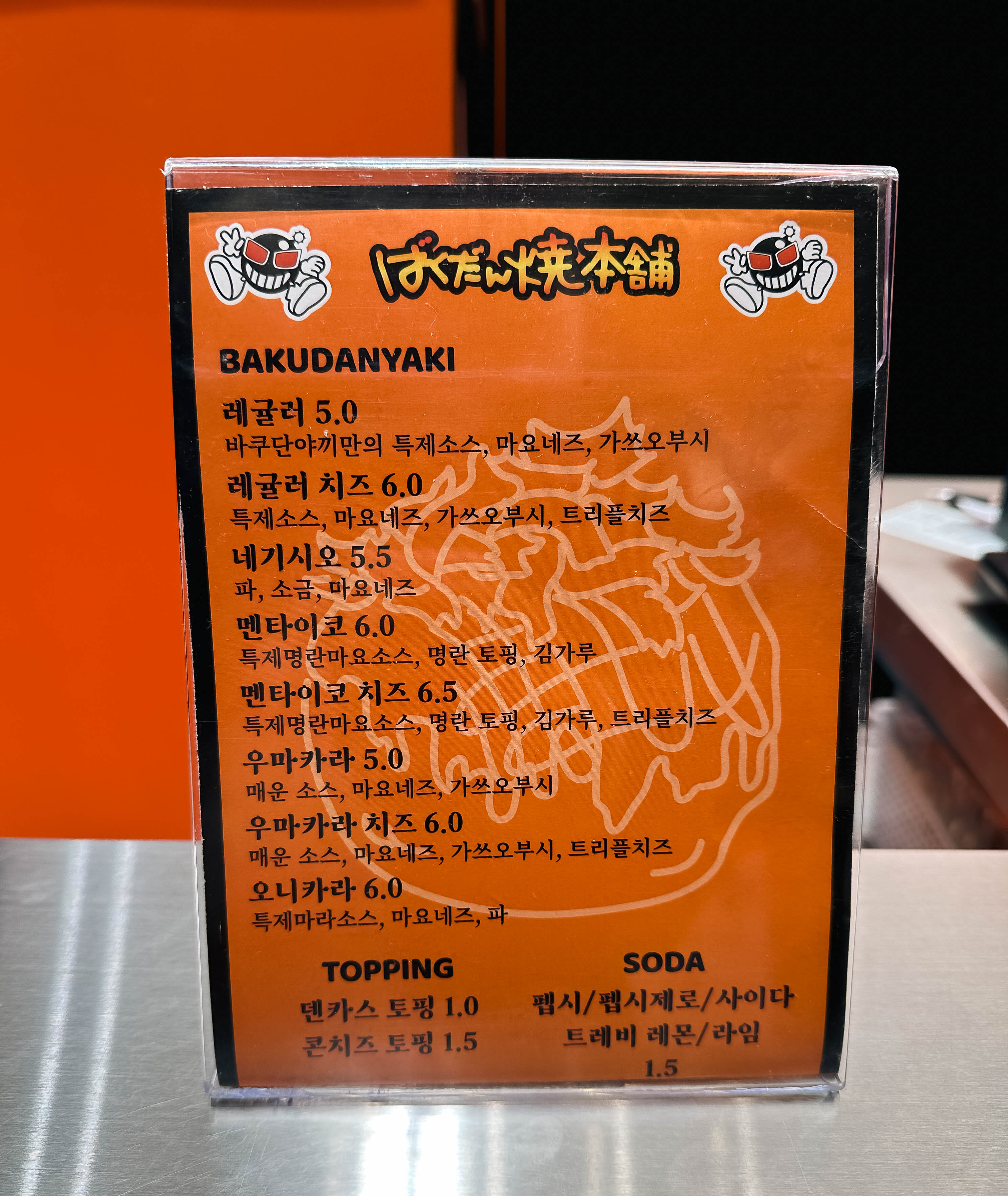 바쿠단야끼의 메뉴는 총 8가지로 레귤러, 레귤러치즈, 네기시오, 멘타이코, 멘타이코치즈, 우마카라, 우마카라치즈, 오니카라 가 있었습니다. 타코야끼 위에 추가할 토핑으로 텐가스와 콘치즈가 있었습니다. 가격은 5,000원~ 6,500원 대였습니다. 예전에 하남 스타필드에서 다녀온 긴타코(링크)와 비슷하게 기본적인 타코야끼는 동일하고 위에 올라가는 소스와 토핑으로 메뉴를 구분하고 있었습니다.