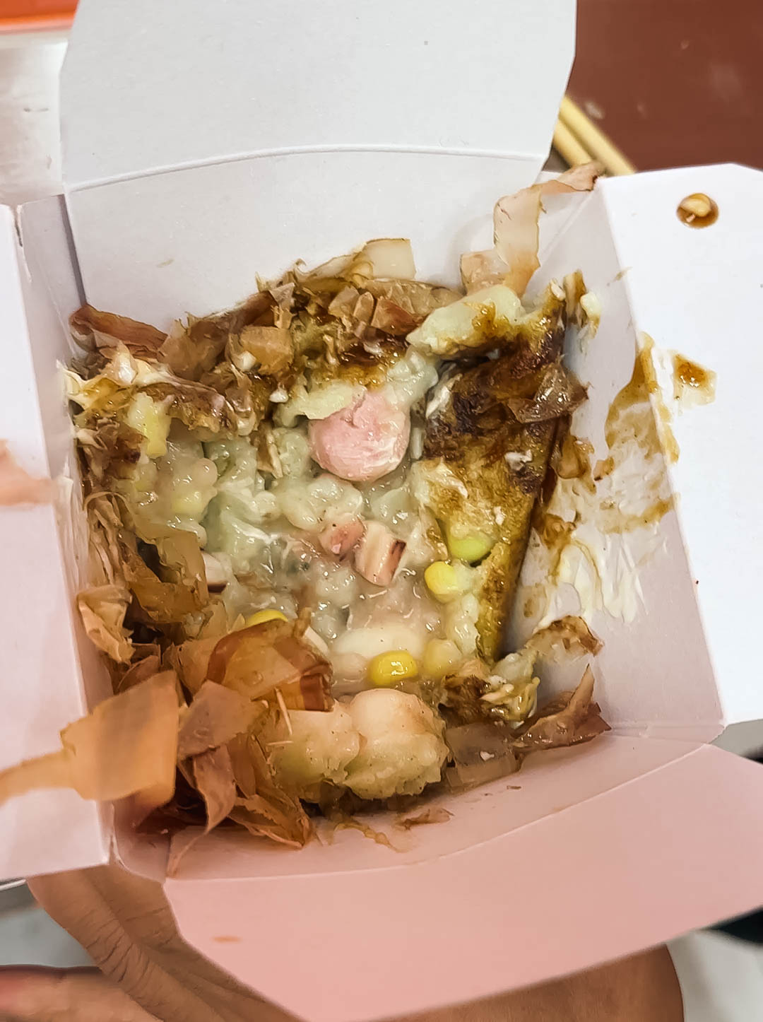 바쿠단야끼의 타코야끼는 오징어, 바지락, 메추리알, 텐가스, 소시지, 버섯, 옥수수콘, 떡, 홍생강, 양배추가 들어갔다고 합니다. 우리가 흔히 먹어본 타코야끼는 바삭한 호두과자 크기인데, 바쿠단야끼의 타코야끼는 크기가 커서 그런지 내용물은 오코노미야끼 먹는 느낌이 들었습니다.