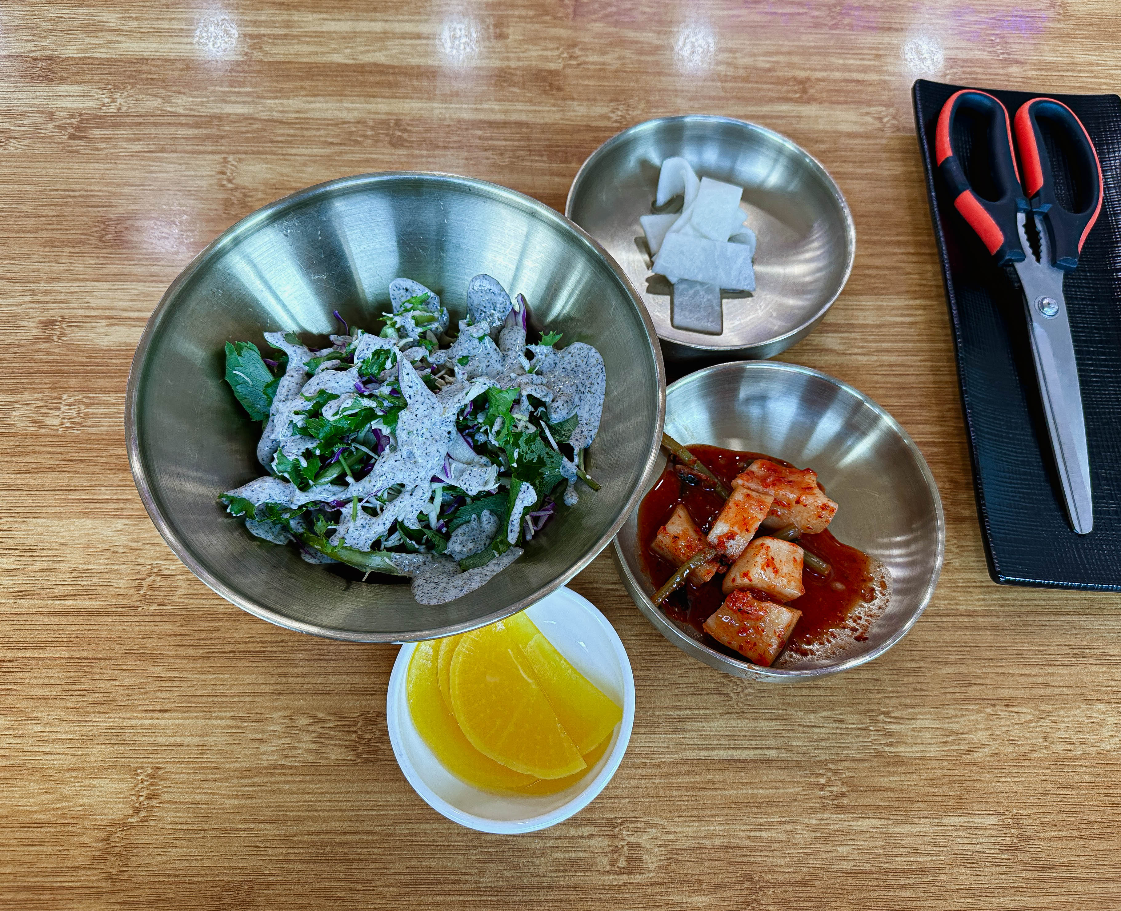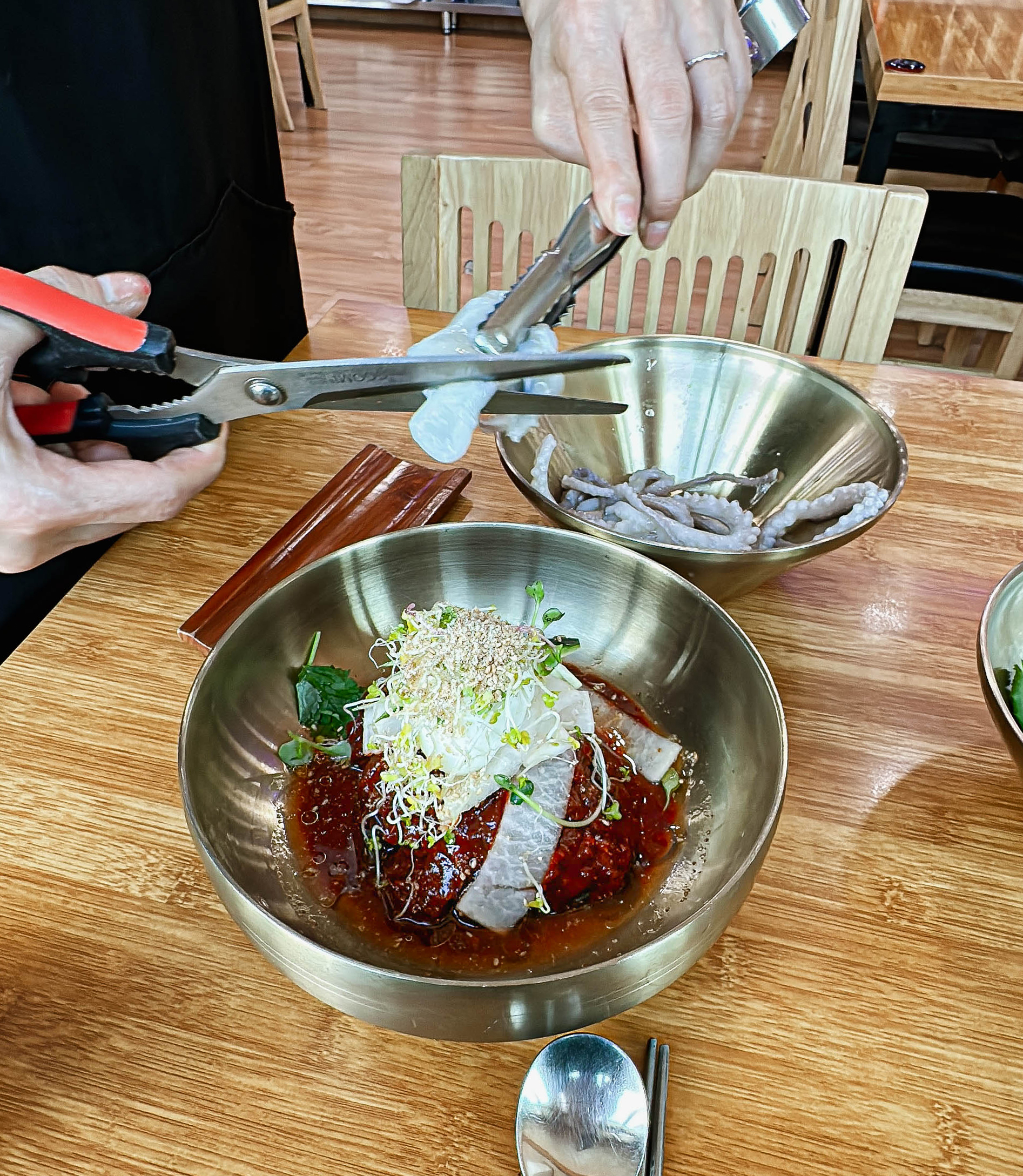 곧이어 반찬과 함께 비빔냉면과 그 위에 얹을 산낙지를 통째로 가지고 오셨습니다. 눈앞에서 가위로 먹기좋게 잘라주시는데, 제 눈 앞에서 산 채로 꿈틀대는 모습이 정말 충격 그 자체였습니다.