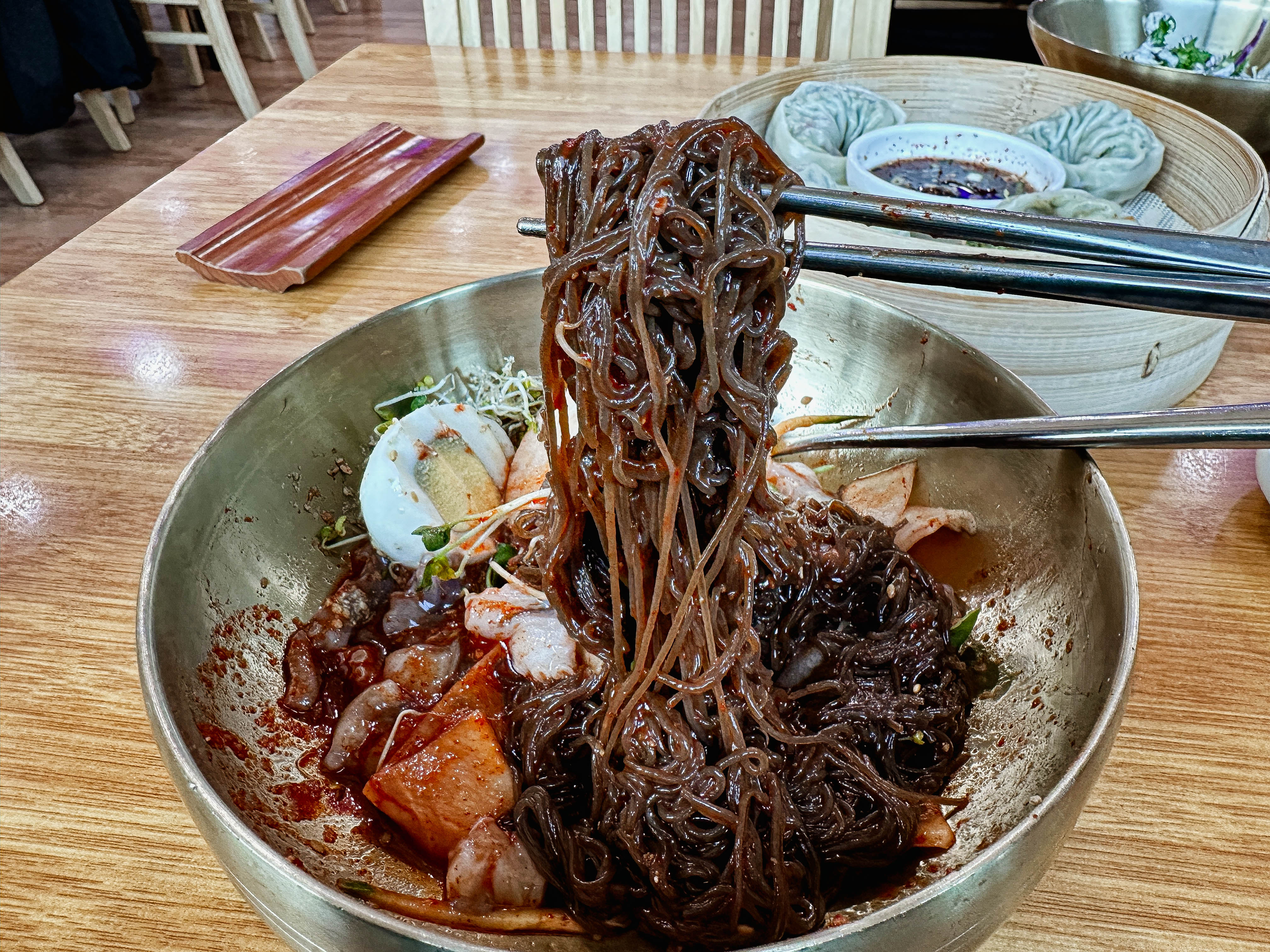 냉면 위에 낙지는 냉면 양념에 스스로 비벼대고 있었고, 저는 일단 빨리 면을 풀어주었습니다. 영상과 사진을 동시에 찍으려다 보니, 면이 많이 뭉쳐있었는데, 최대한 풀어서 낙지와 함께 먹기 시작했습니다. 살아있는 낙지와 냉면의 조합은 생각보다 잘 어울렸습니다. 냉면의 탄력 있는 식감과 산낙지의 쫄깃한 식감이 서로 조화가 잘 이루어졌고, 저는 물냉면 보다는 매콤하게 먹기위해 비빔냉면을 주문했는데, 산낙지 물냉면을 먹어보진 않았지만, 산낙지는 비빔냉면이 더 잘 어울린다고 생각합니다.