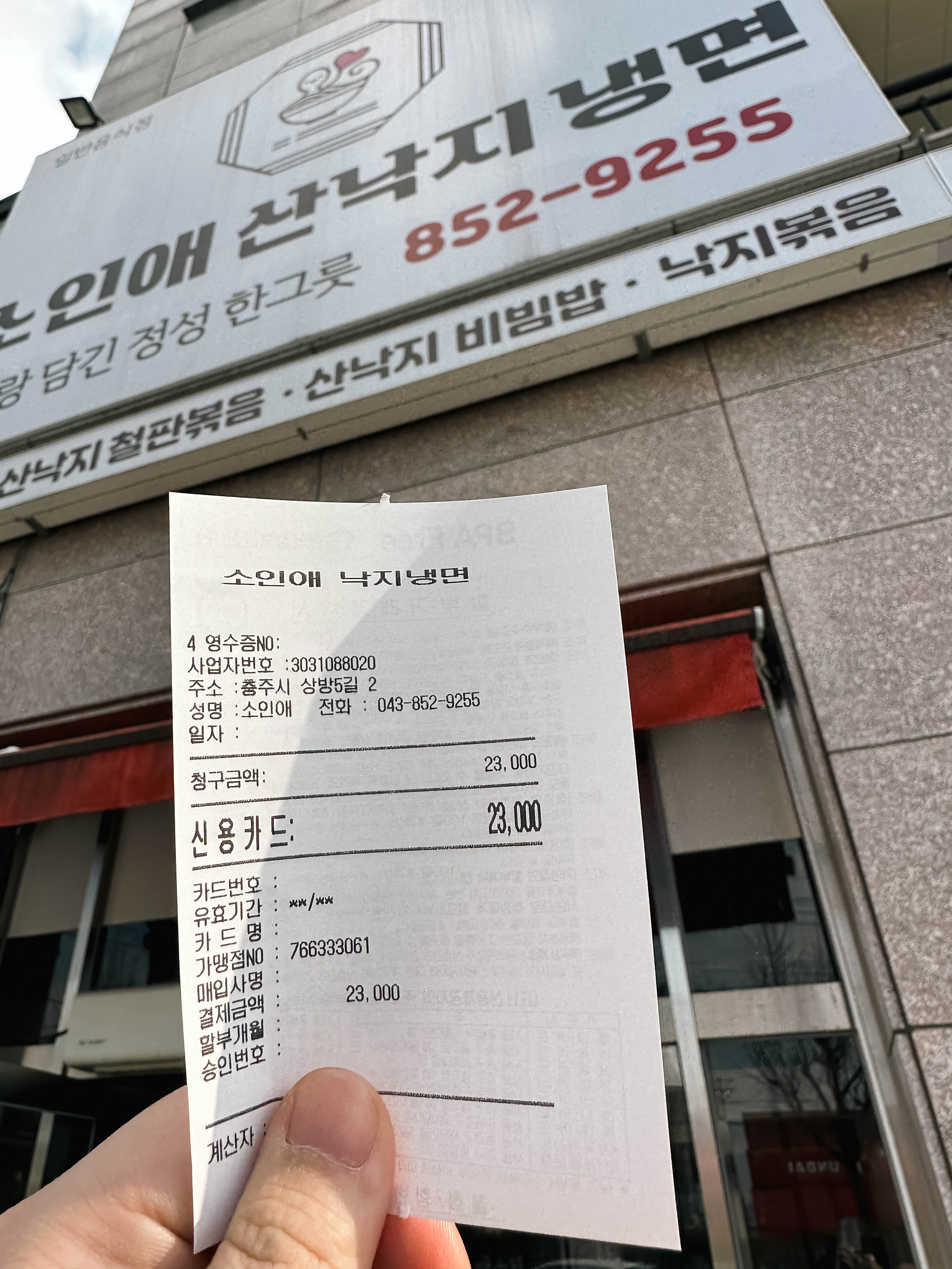충주 소인애산낙지냉면은 충북 충주시 봉방동 406, 1층에 위치한 가게입니다. 영업시간은 화~일 11시~22시 까지였습니다. 이곳은 충주역이랑도 가까워서, 대중교통 이용 시 충주역에서 내려서 도보로 방문할 수 있었습니다. 가게 내부는 깔끔한 편이었고, 제가 방문했을 때는 손님이 적어서 한적한 분위기에서 식사할 수 있었습니다.