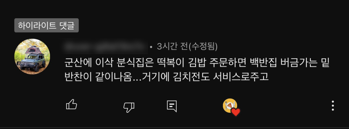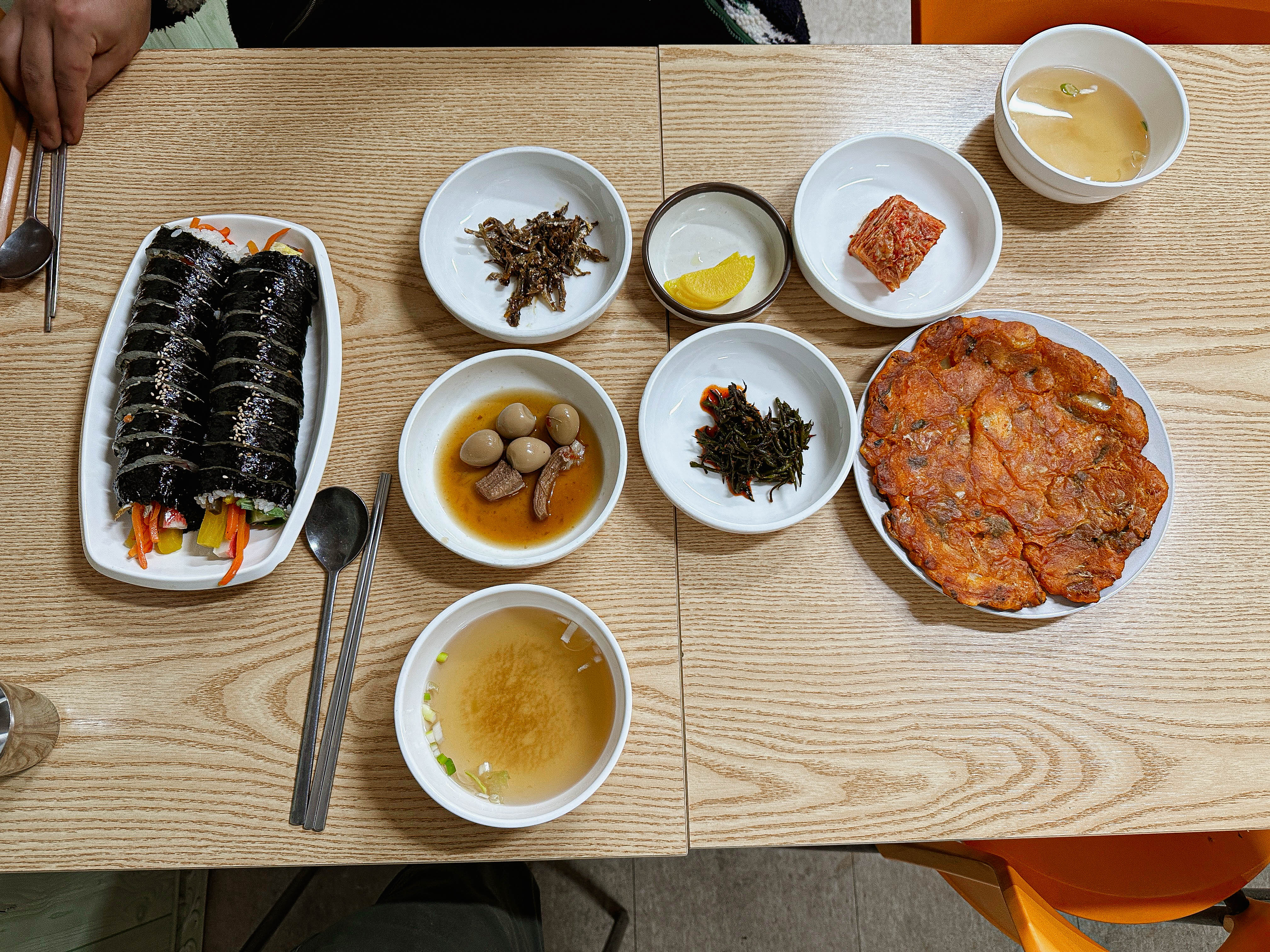 유튜브 댓글 하나로 시작된 군산여행. 김밥을 주문하면 백반집 버금가는 밑반찬을 실제로 주고 계셨습니다. 사장님도 너무 친절하시고 사장님 가족분들이 다들 화목하게 지내시는 것 같더라고요. 인심 좋은 분식집에서 이날은 김밥 두 줄만 먹고 왔지만, 나중에 간다면 꼭 돈쭐을 내줘야겠습니다.