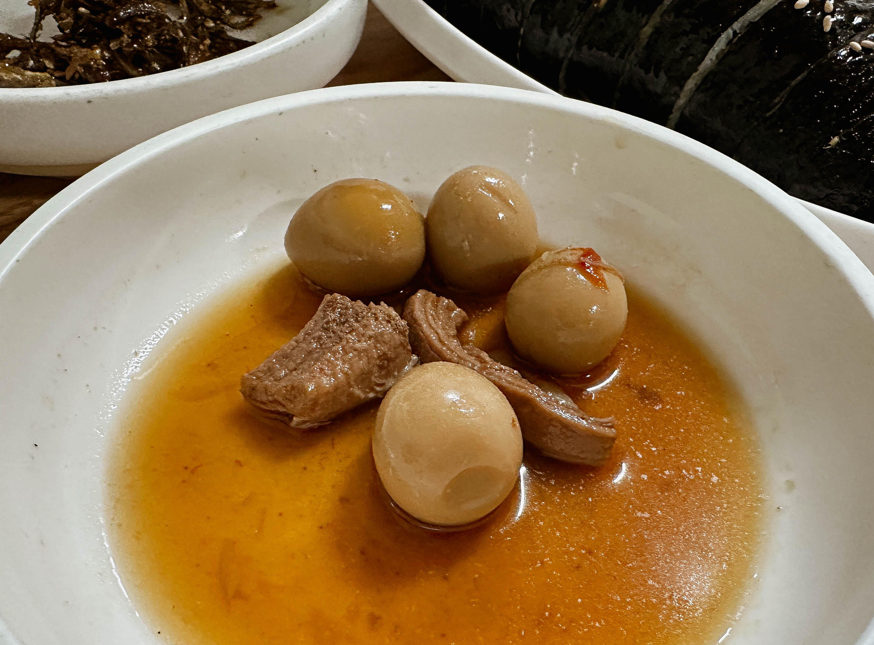 군산 이삭분식은 정말로 김밥이랑 함께 장국, 장조림, 톳무침, 멸치볶음, 단무지, 배추김치, 김치부침개가 나왔습니다. 저는 정말로 반찬을 푸짐하게 주시는지 알아보기 위해 극단적으로 김밥만 주문해 보았는데, 실제로 반찬을 백반을 주문한 것처럼 푸짐하게 주시니 아주머니께 감사하더라고요.