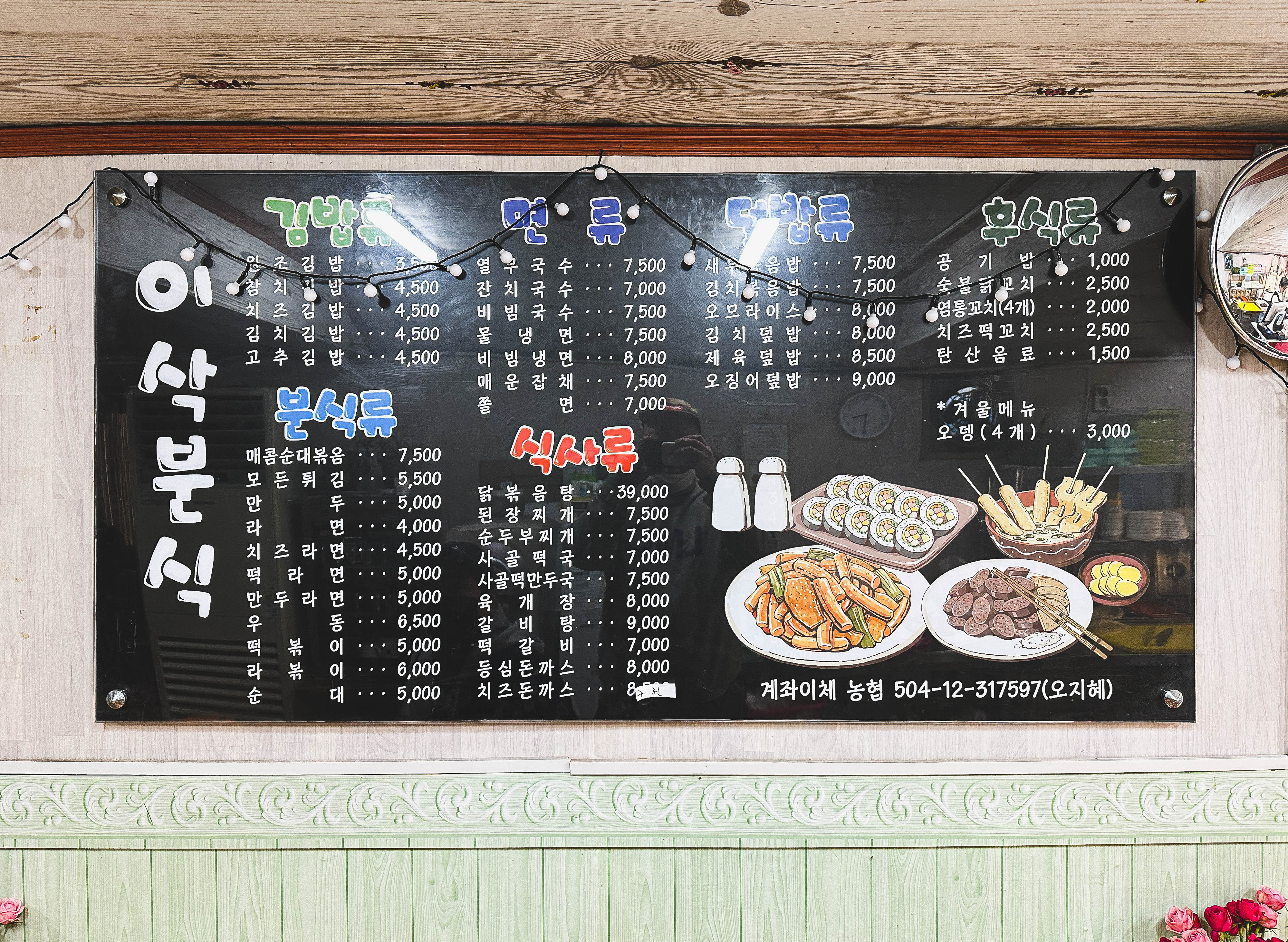 이삭분식은 독특한 것이 김밥을 주문하면 푸짐한 반찬을 주기로 유명한 가게입니다. 저는 제 유튜브 채널 야먹자(링크)에 댓글로 추천을 받아 방문하게 되었는데, 모든 메뉴에 백반집에 버금가는 푸짐한 반찬을 준다고 하더라고요.