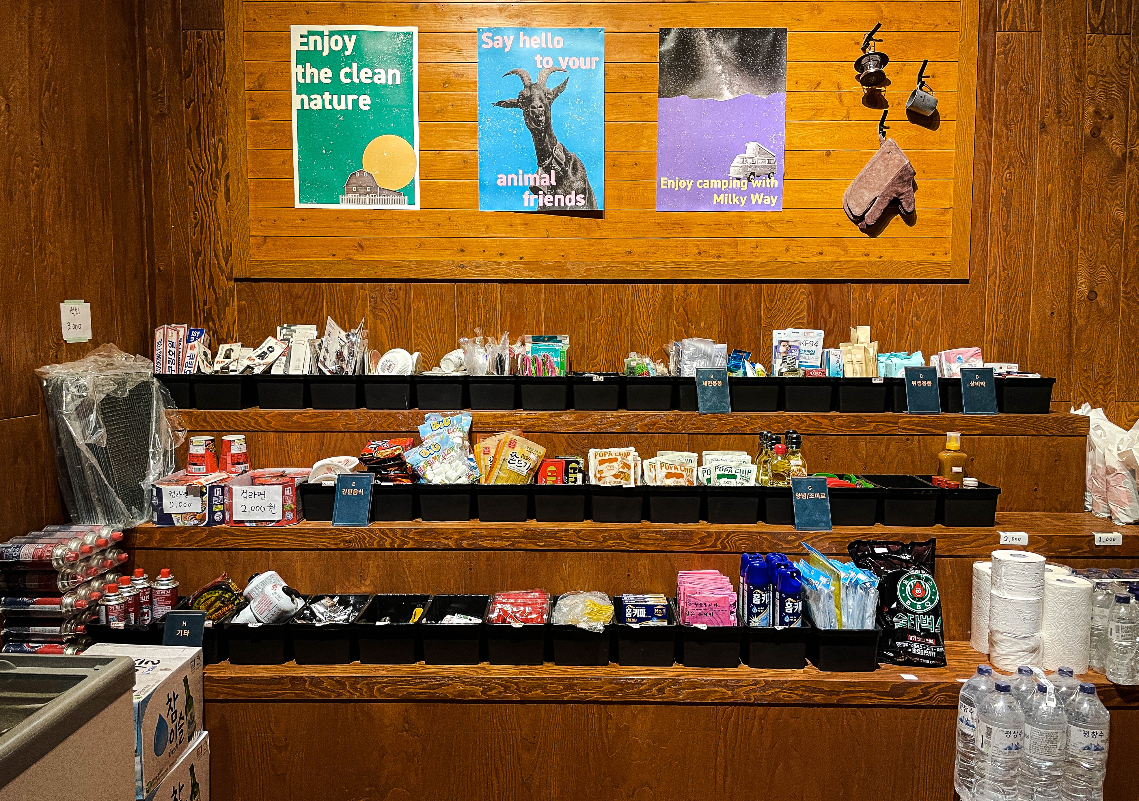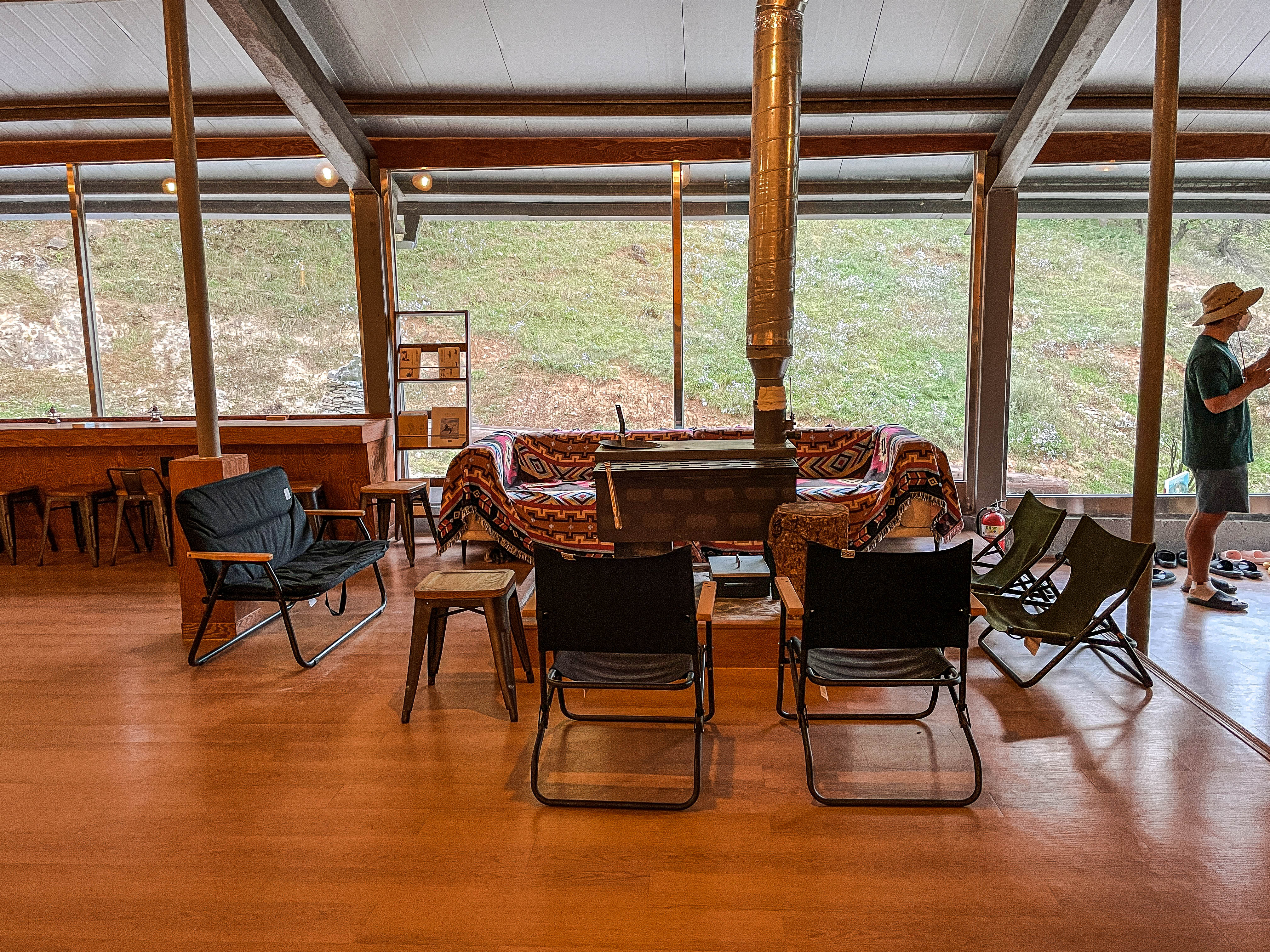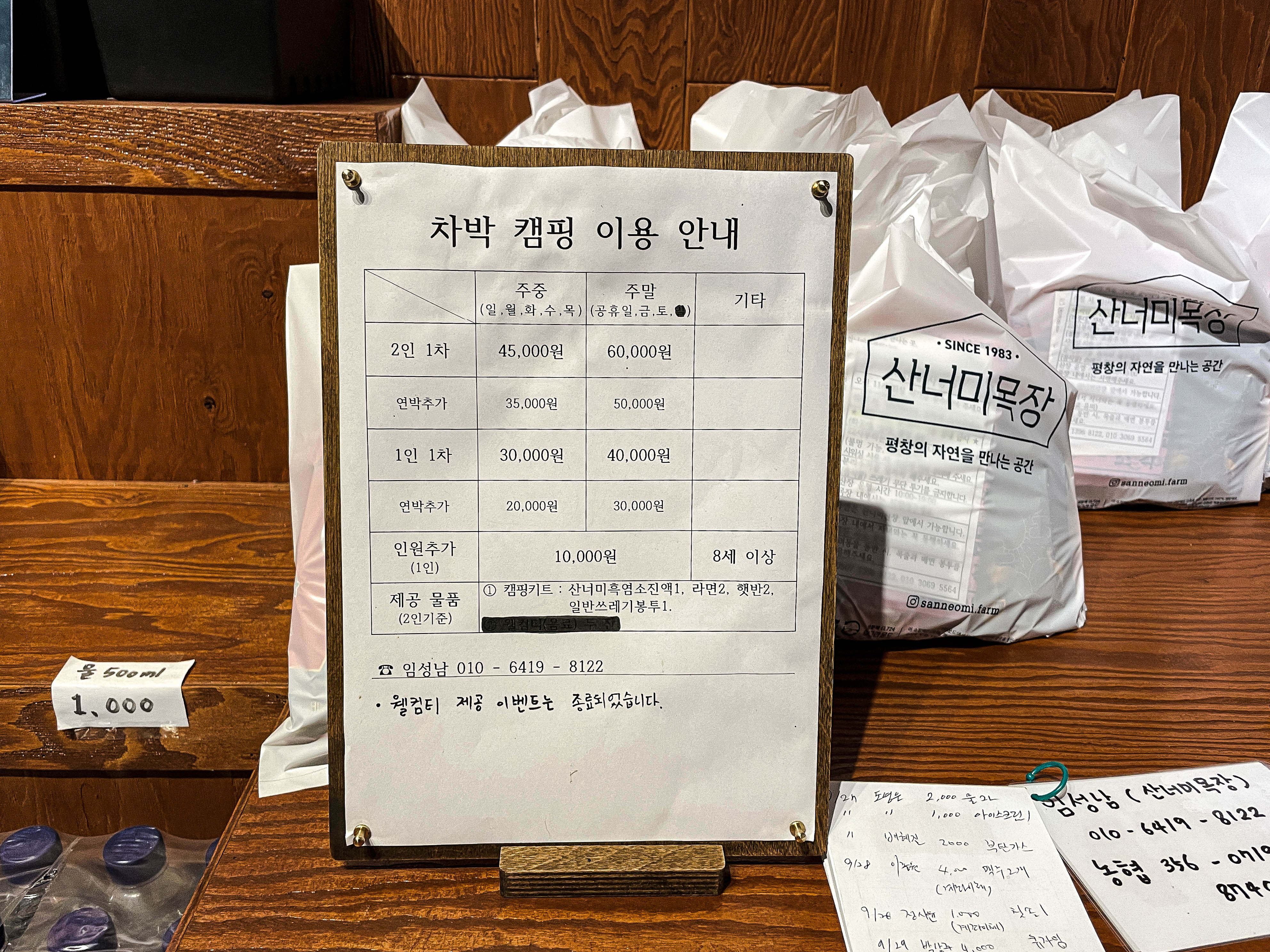 산너미목장(산장)의 모습입니다. 가게 안 모습은 널찍한 컨퍼런스룸이 있었고, 차박 캠핑을 하시는 분들을 위한 이용요금 안내가 있었습니다. 차박 캠핑예약은 네이버 예약(링크)를 통해 받고 있었고, 2022년 기준 30,000~ 60,000원 사이의 요금을 받고 있었습니다. 내부에서 사진을 찍고 육십마지기를 향해 올랐습니다.