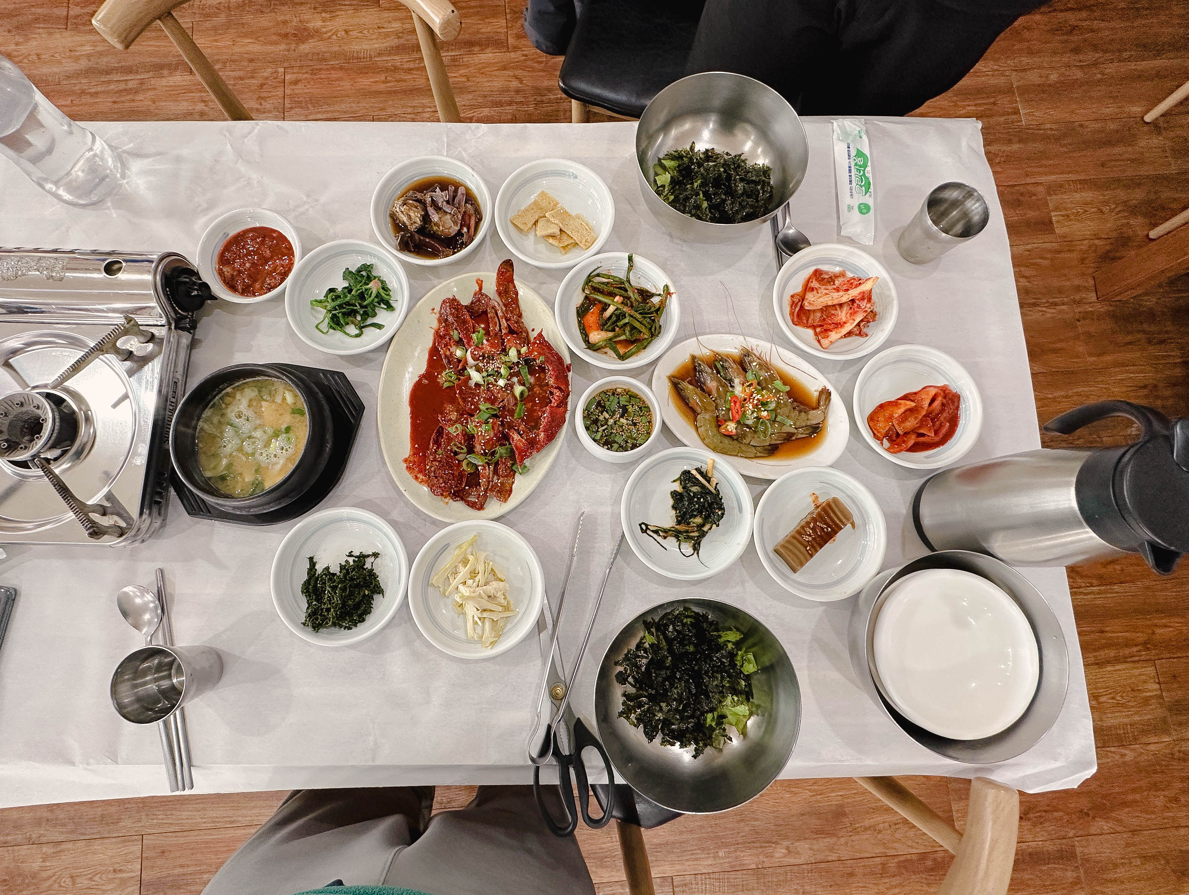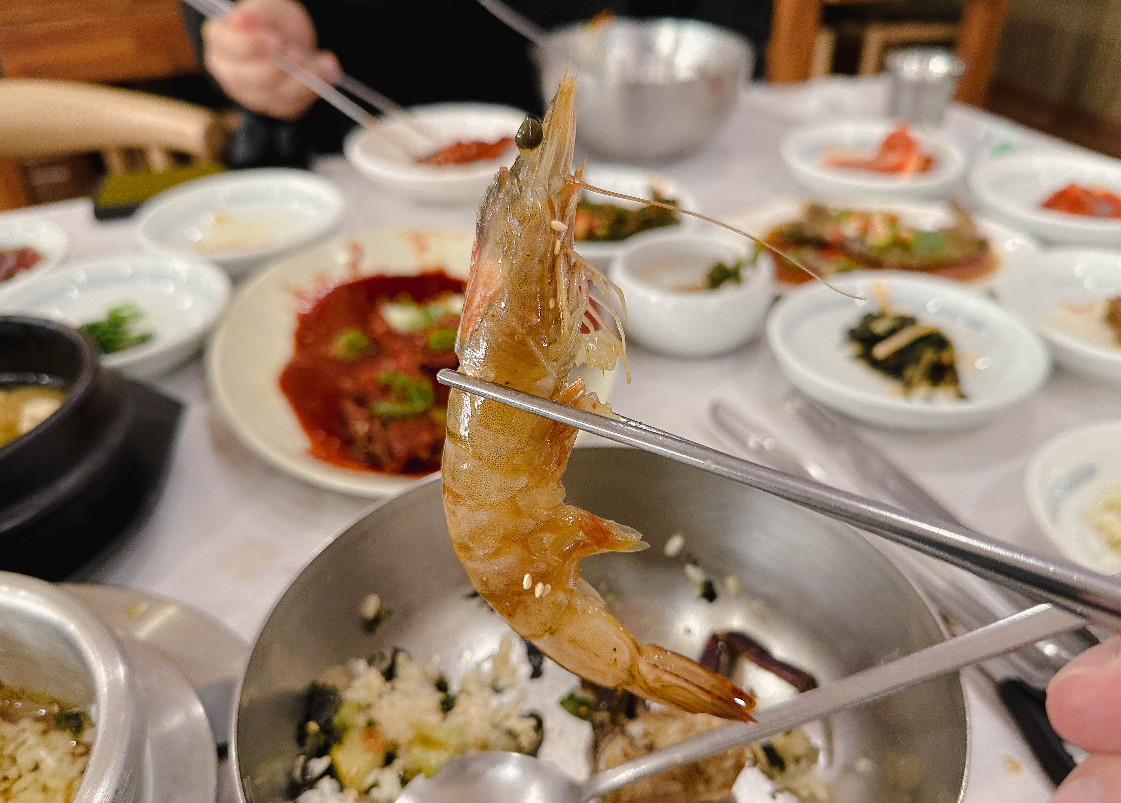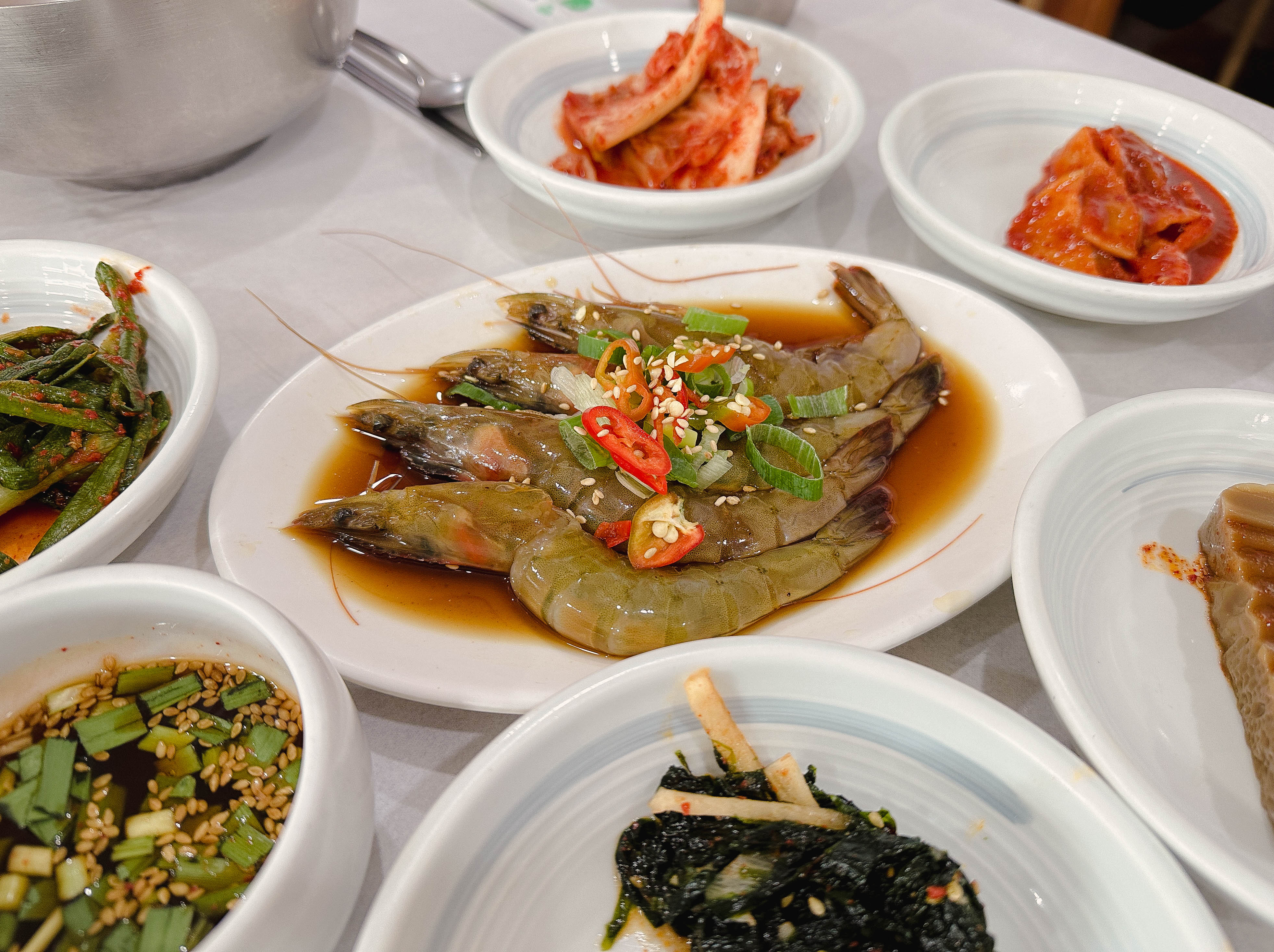 곧이어 주문한 메뉴가 나왔습니다. 테이블 위에 갖가지 반찬과 세트메뉴에 포함되어 있던, 게장과 대하장 등이 나왔습니다. 반찬들이 정갈하게 나오는 편이었고, 맛도 깔끔 담백해서 좋았습니다.