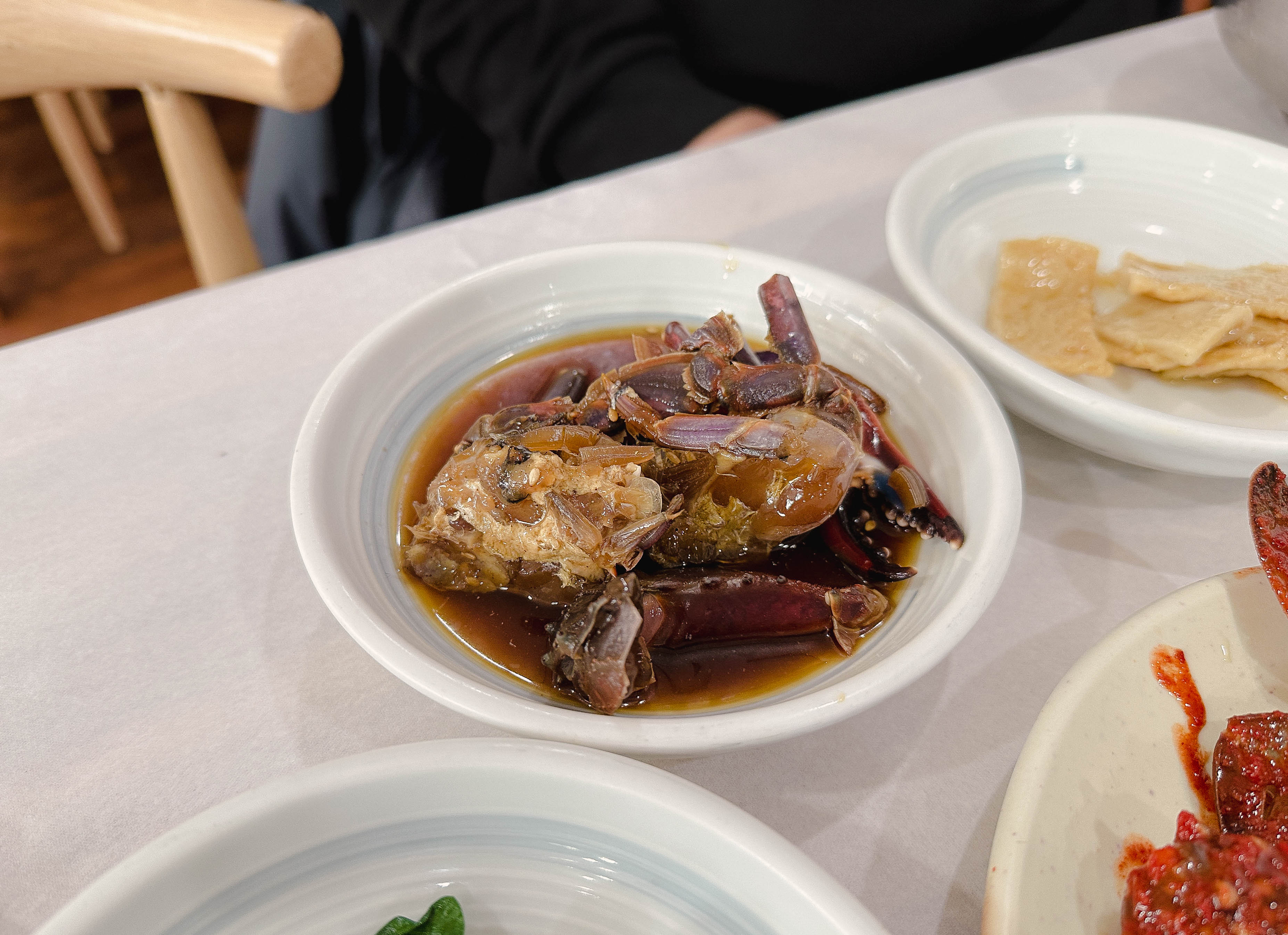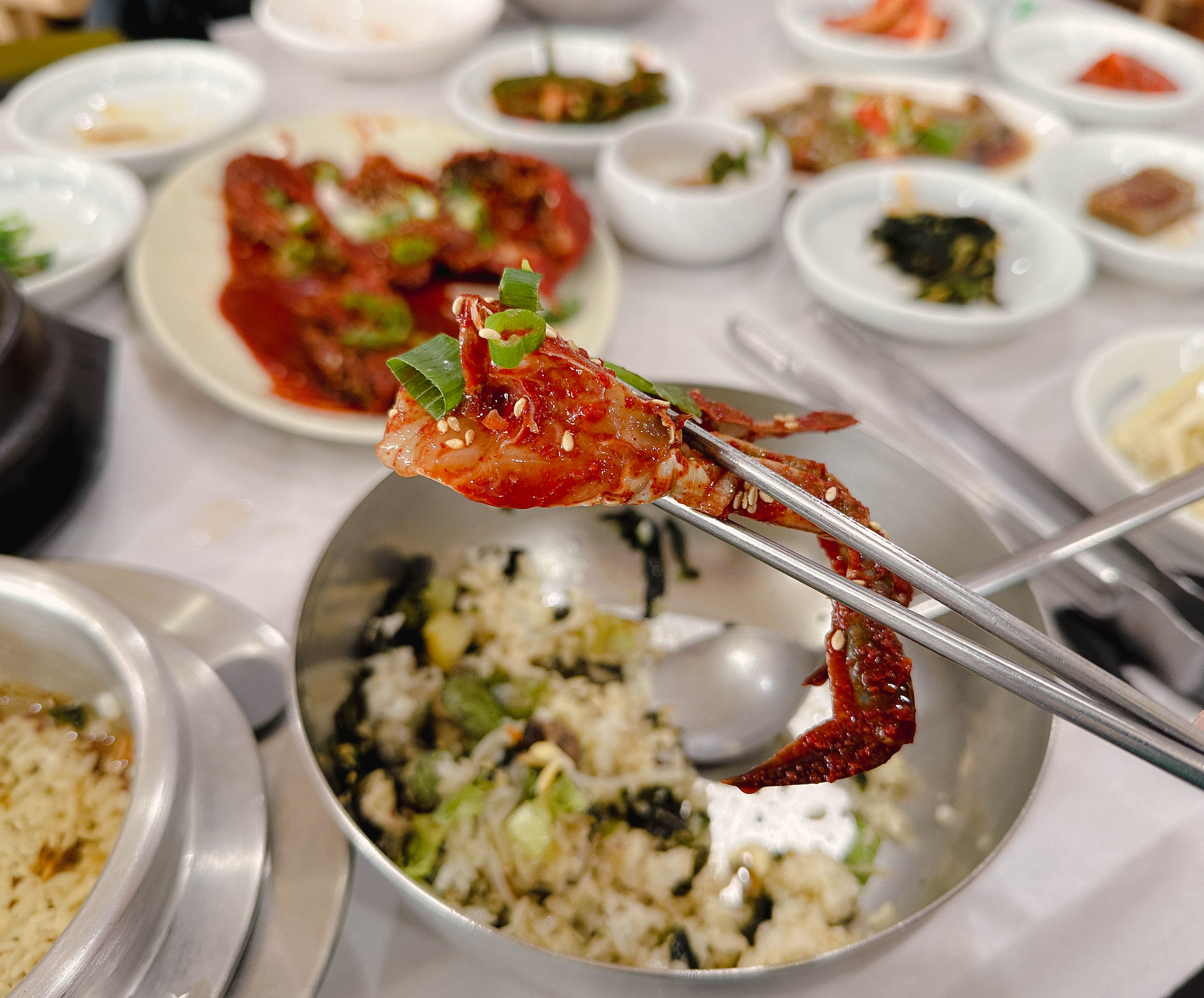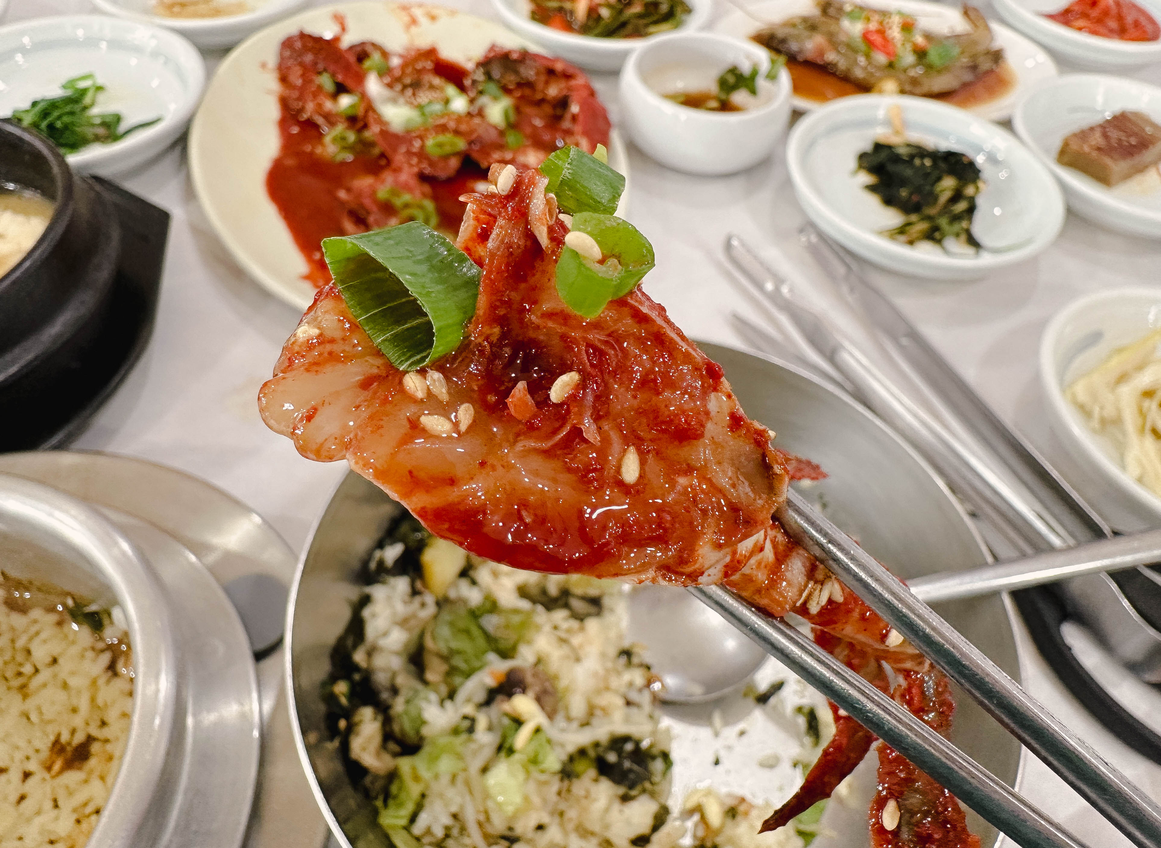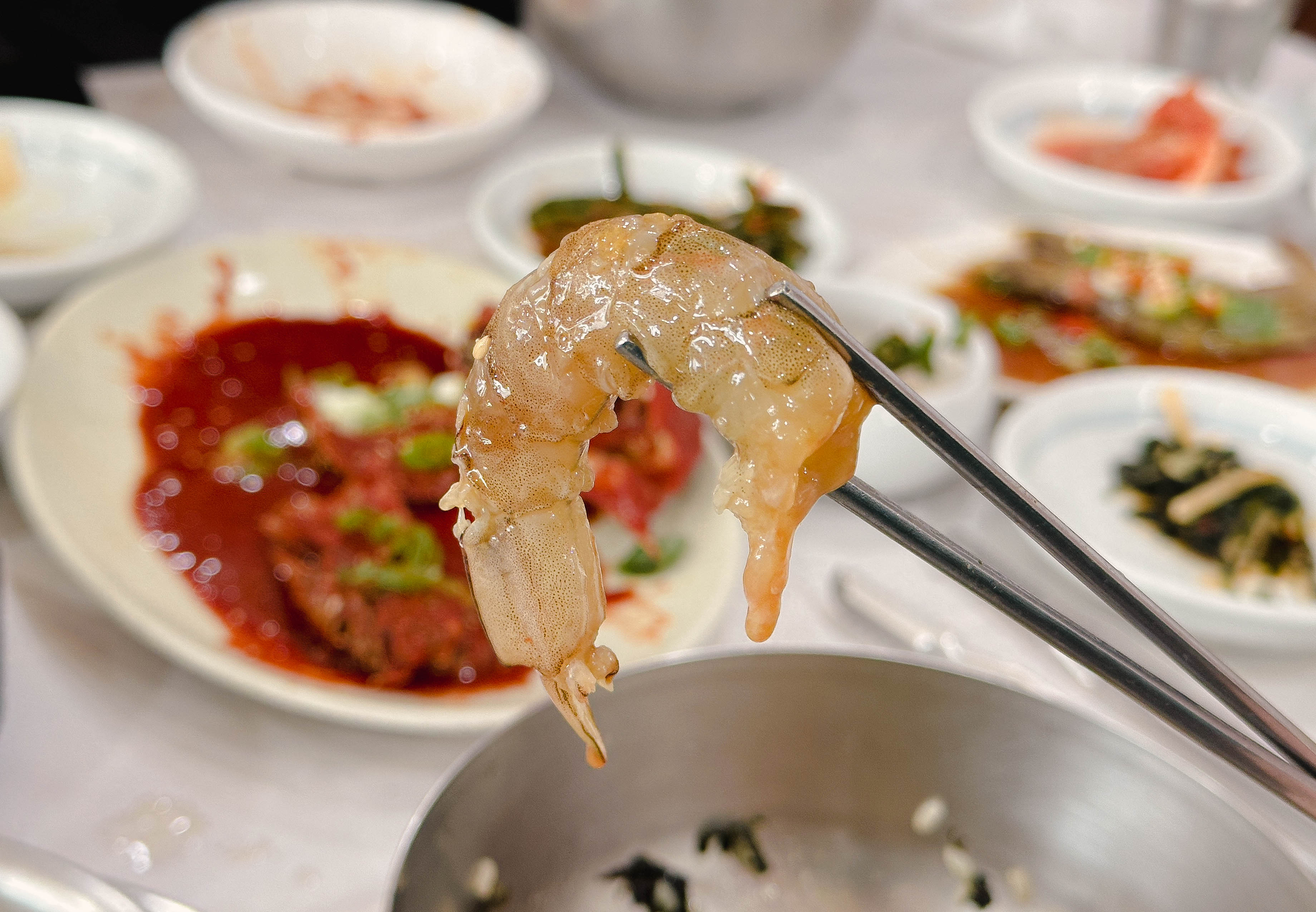곧이어 주문한 메뉴가 나왔습니다. 테이블 위에 갖가지 반찬과 세트메뉴에 포함되어 있던, 게장과 대하장 등이 나왔습니다. 반찬들이 정갈하게 나오는 편이었고, 맛도 깔끔 담백해서 좋았습니다.