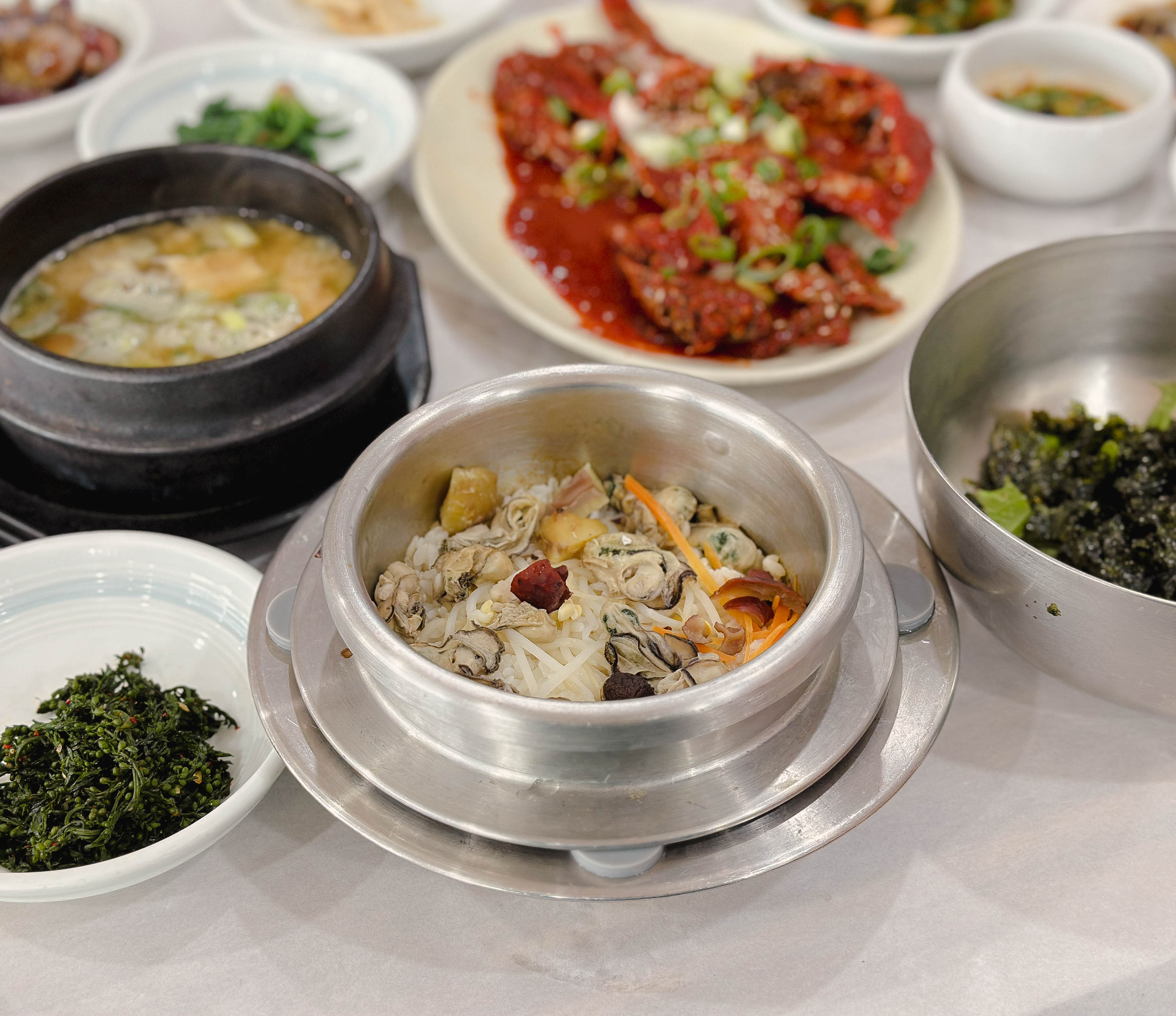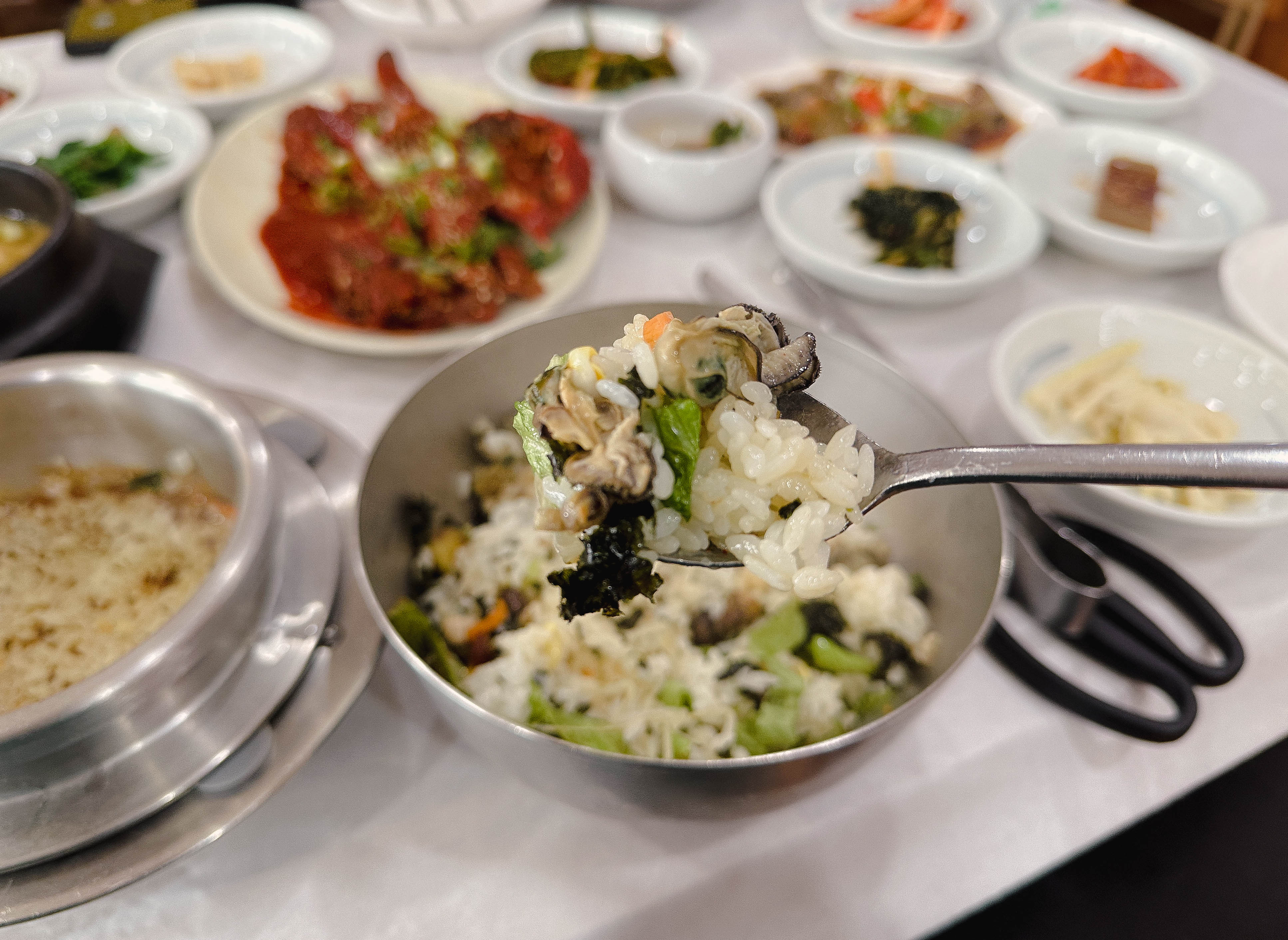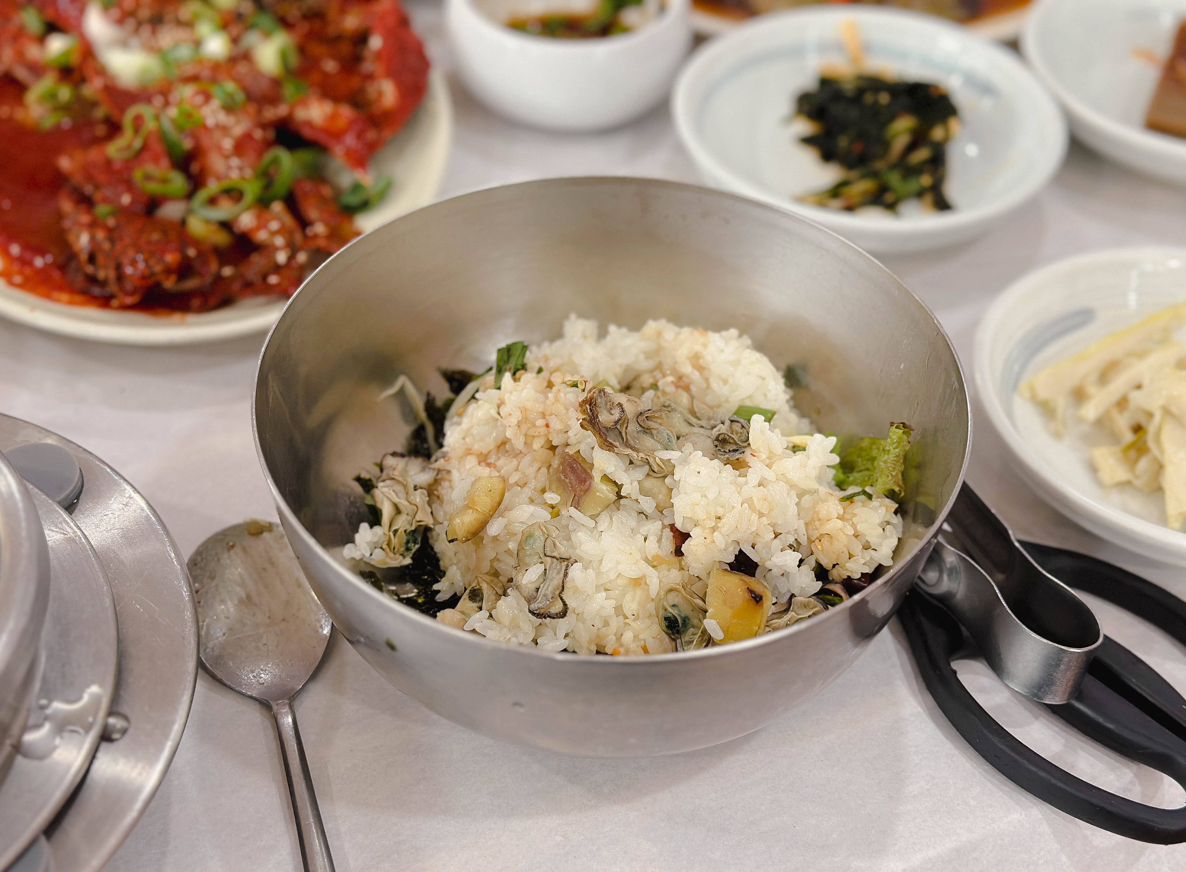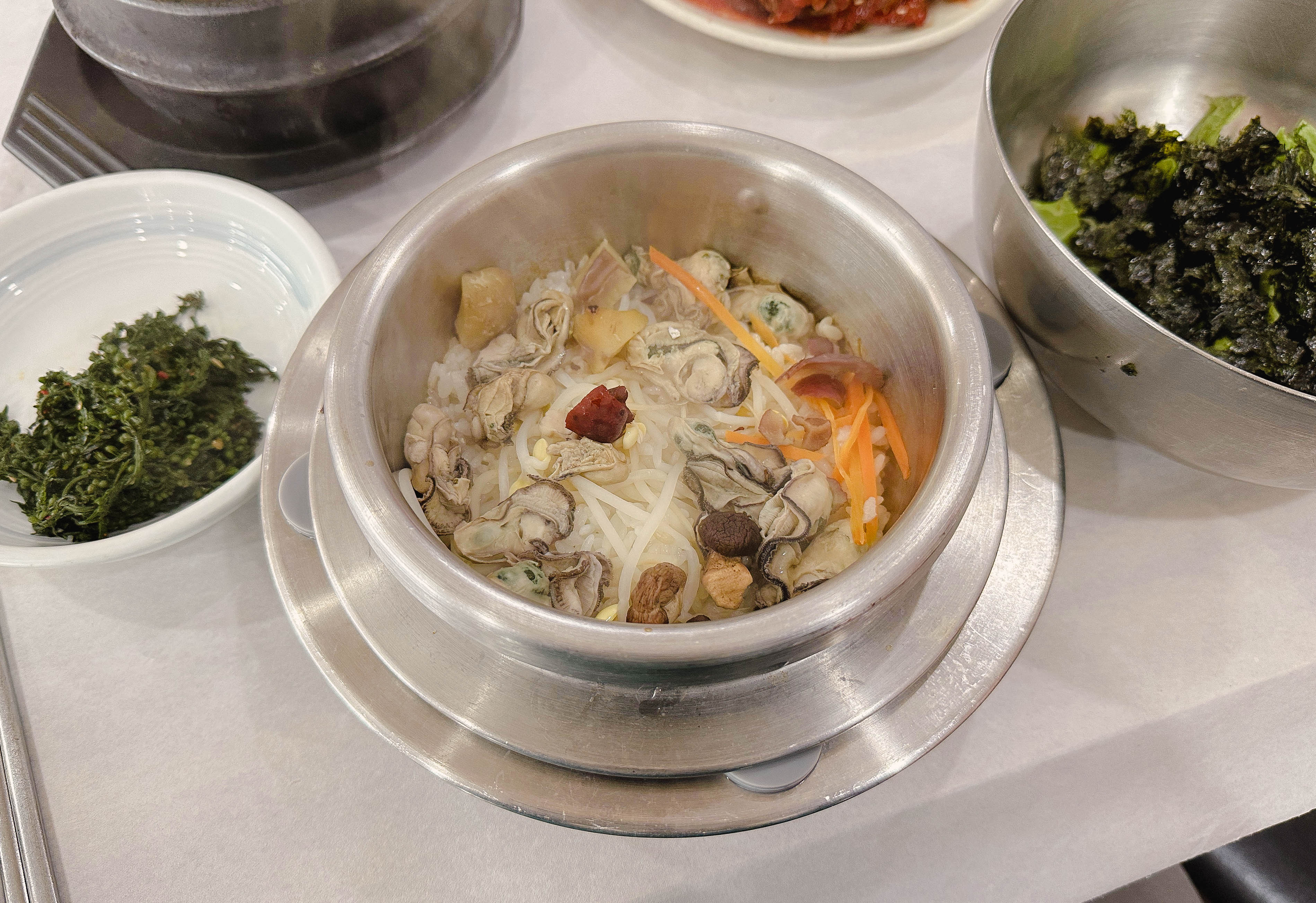 간장 게장도 같이 나왔는데, 속이 꽉 차있어 좋았습니다. 그리고 굴젓도 짭짤해서 밥반찬으로 좋았고요. 곧이어 솥밥 형태의 굴밥이 준비되었습니다. 밥이 갓 지어서 나오기 때문에 반찬부터 먹고 있었는데, 이제 밥이랑 본격적으로 먹어야겠죠?