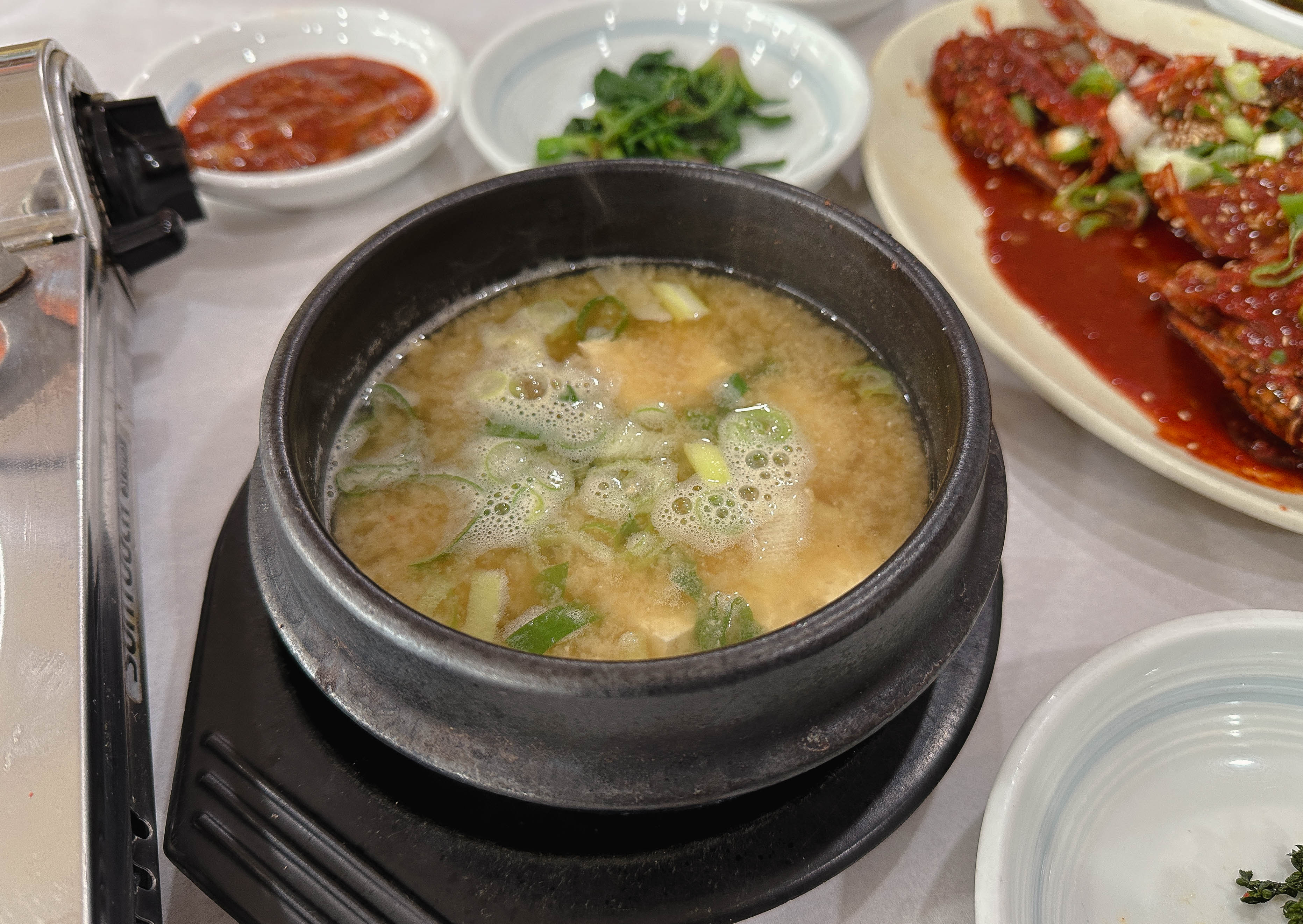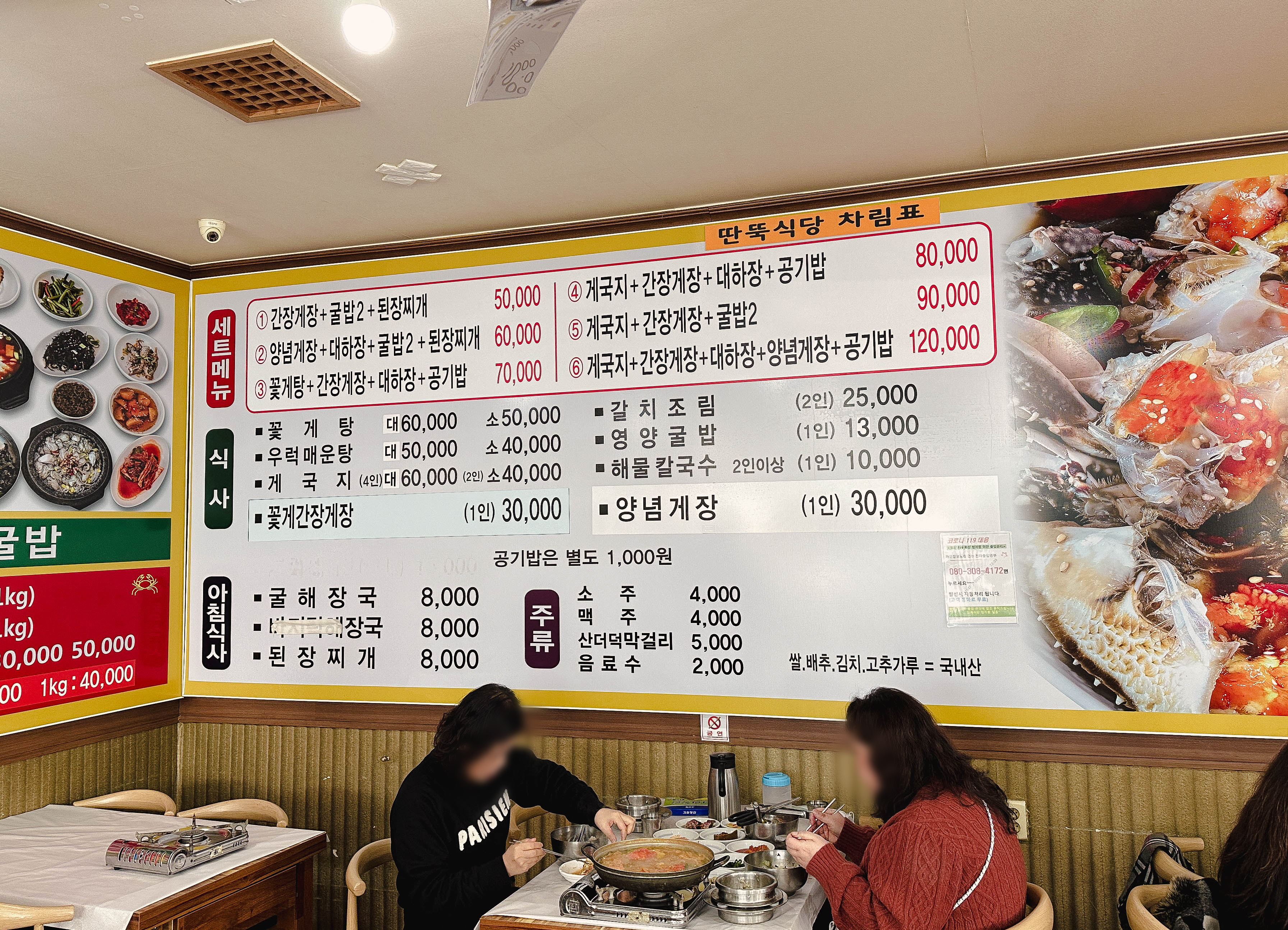 딴뚝식당 실내 모습입니다. 가족단위로 식사하는 모습을 볼 수 있었고, 제가 방문한 시간은 점심시간을 지나 방문하여서 그런지 손님들이 마침 식사를 마치고 일어나시는 분들이 많더라고요. 메뉴는 세트메뉴와 꽃게탕, 우럭매운탕, 게국지, 꽃게간장게장, 갈치조림, 영양굴밥, 해물칼국수, 양념게장, 굴해장국, 된장찌개 등이 있었습니다. 저희는 양념게장, 대하장, 굴밥, 된장찌개가 나오는 세트 ②를 주문했습니다.