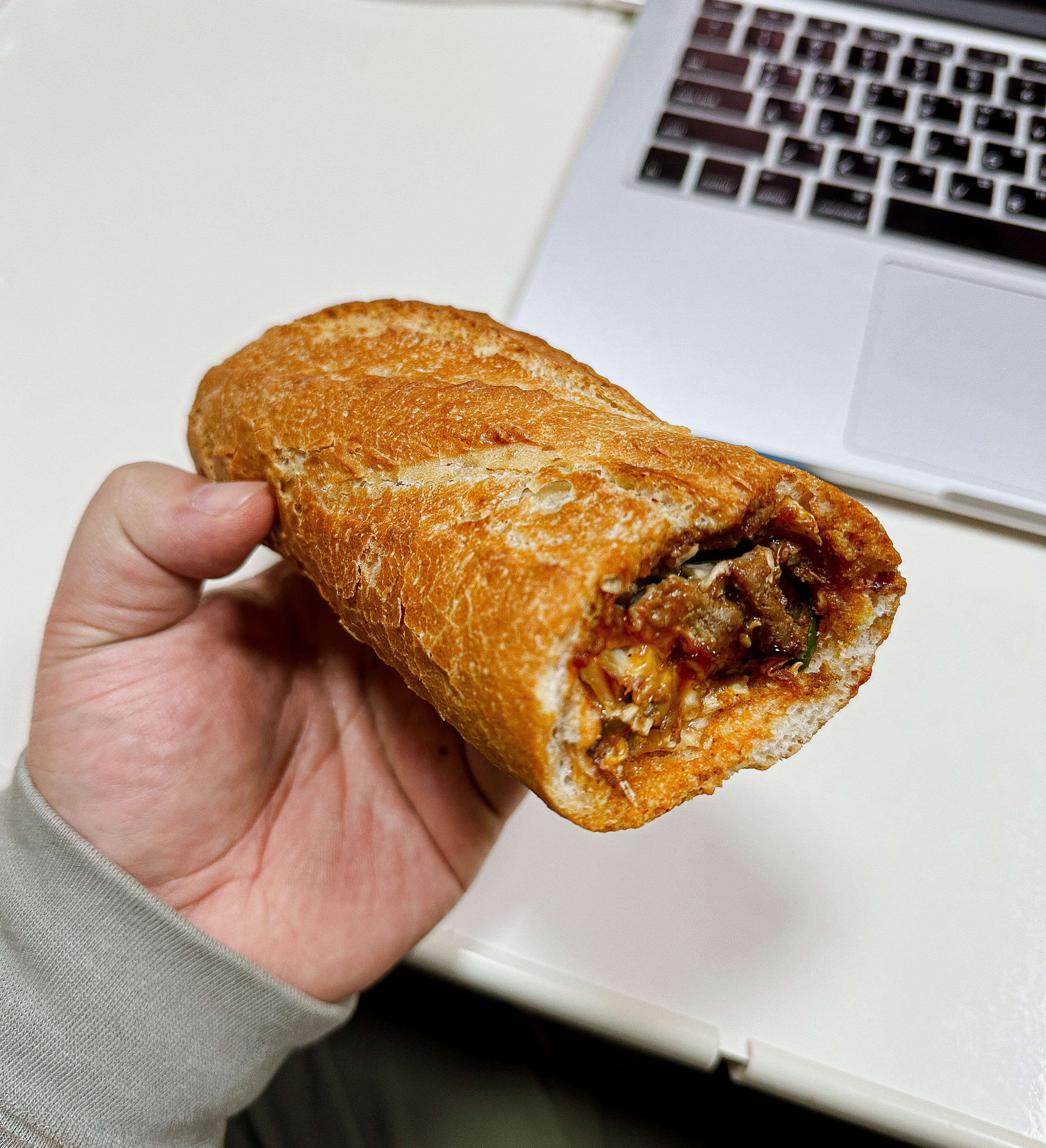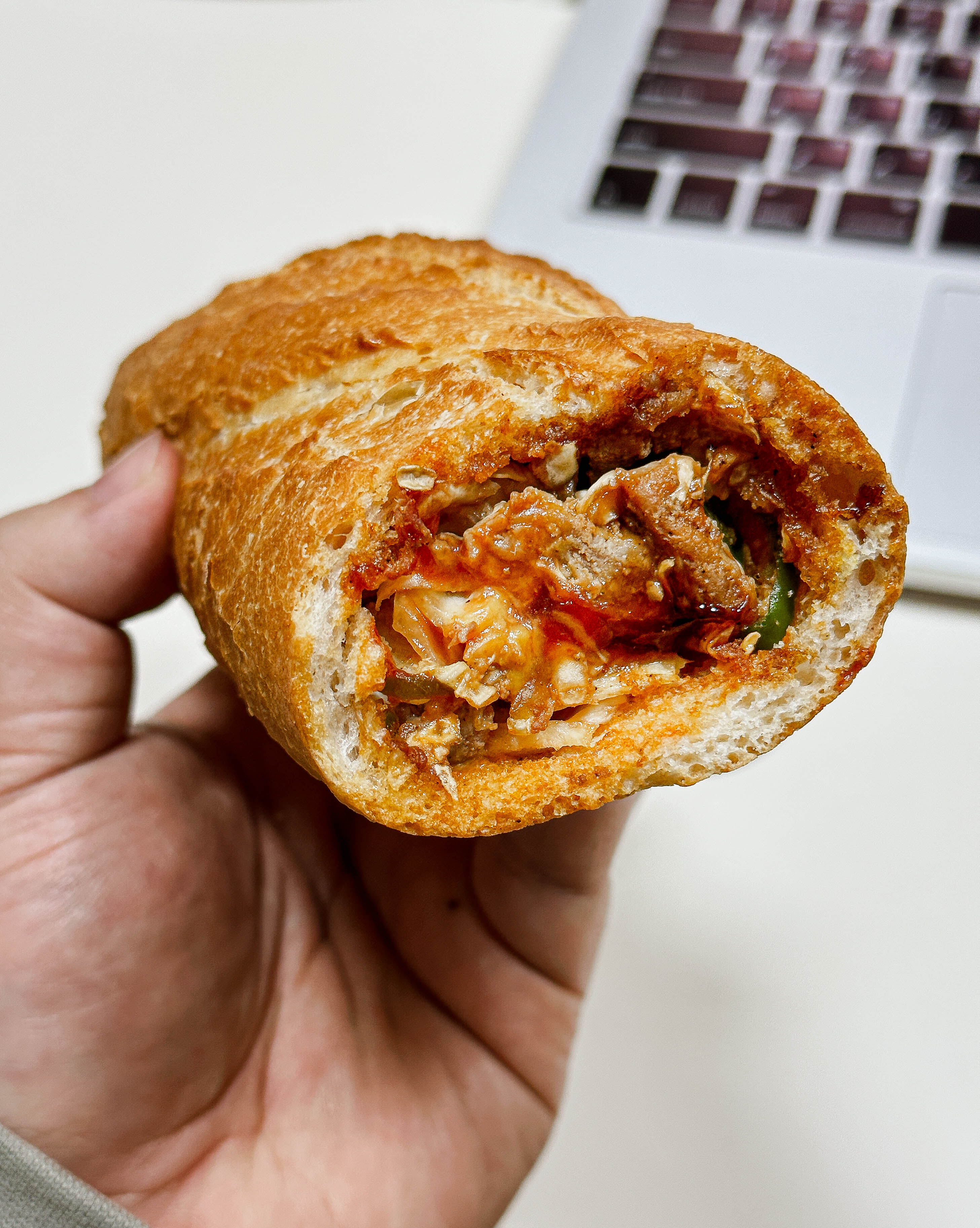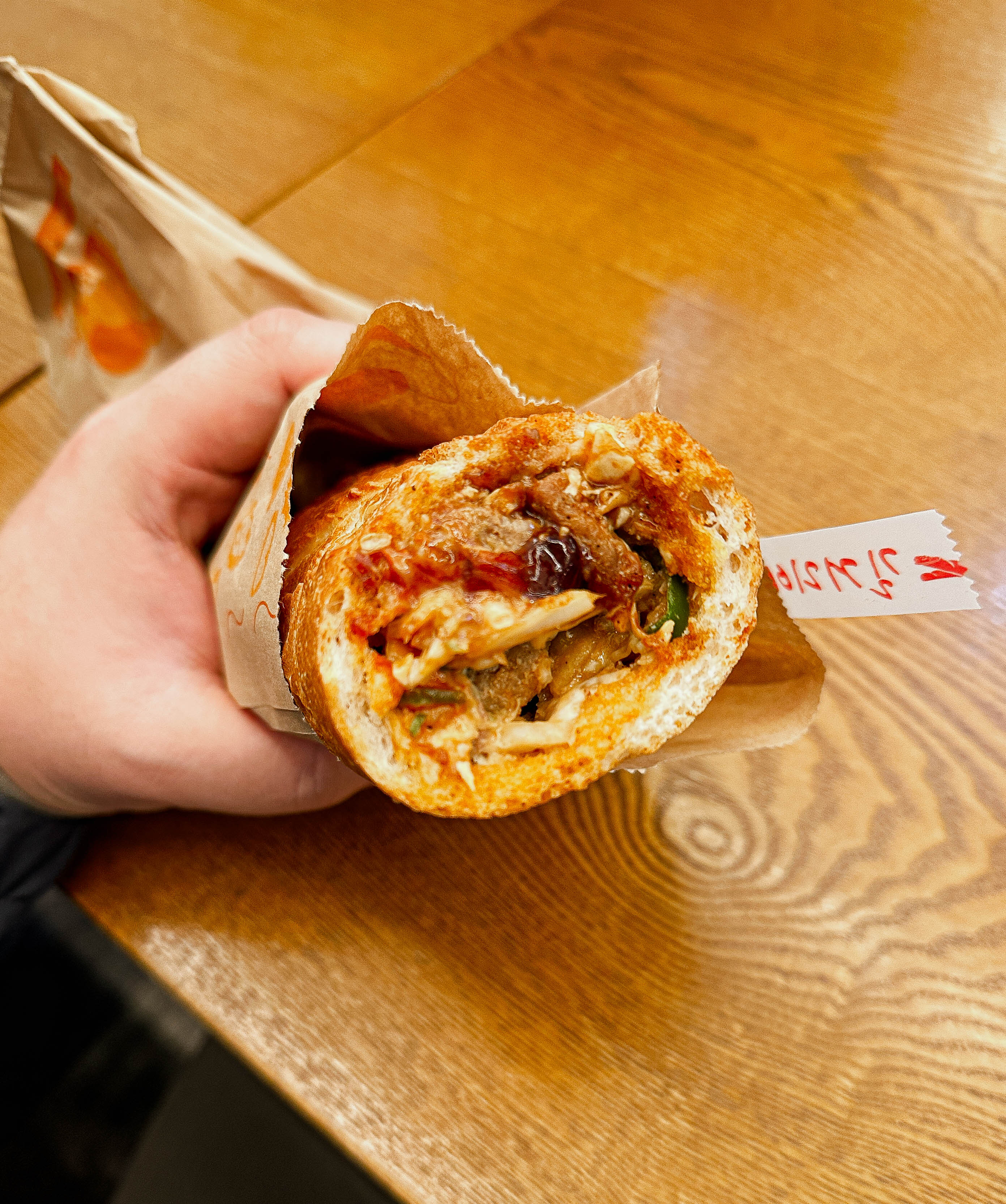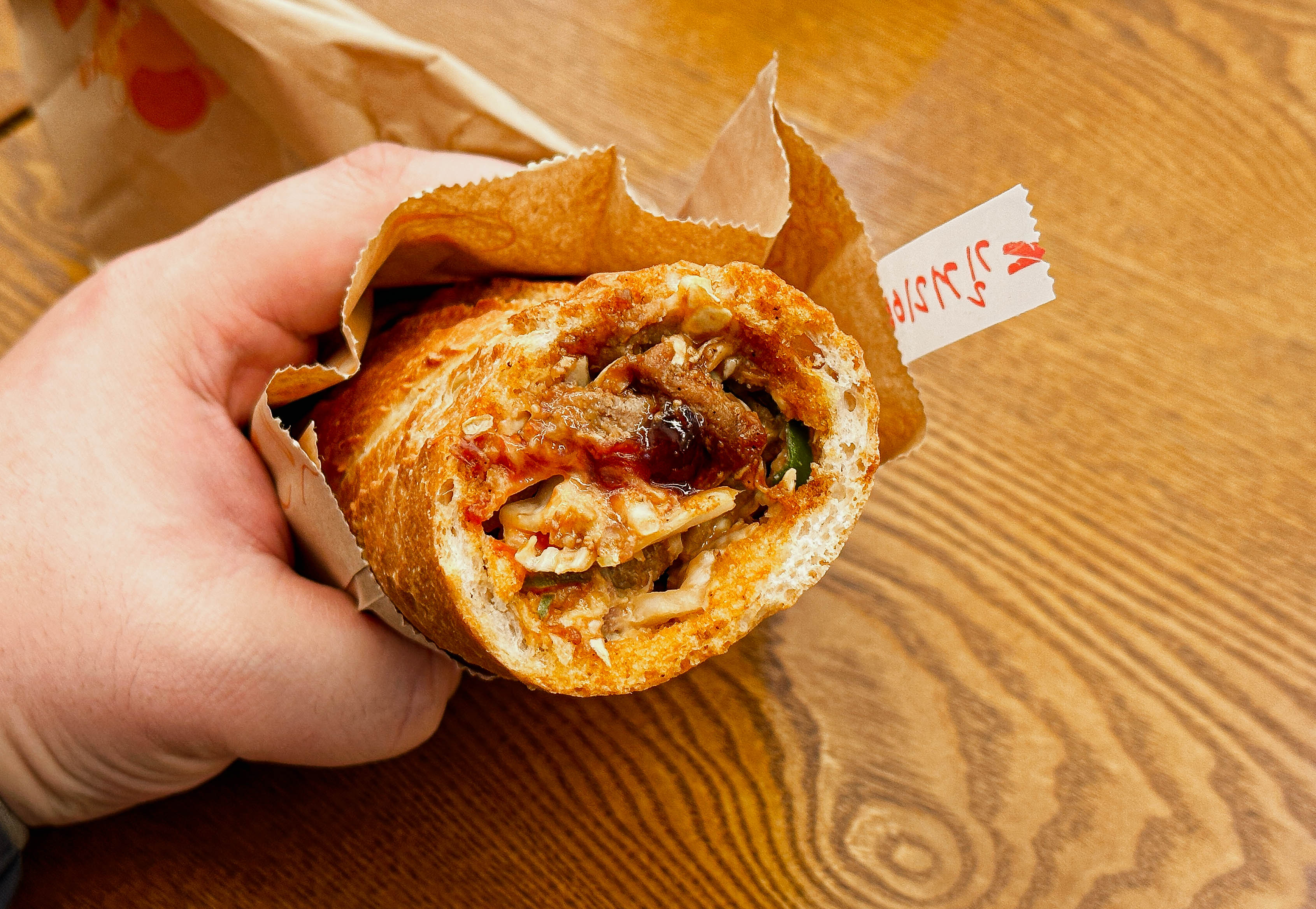바게트버거는 이름처럼 바게트에 햄버거 처럼 속을 채워넣은 형태로 제공되고 있었습니다. 길거리야 바게트버거는 고기랑 양배추 등 재료들이 통째로 들어가지 않고,잘게 썰어서 바게트 사이에 끼워넣어 만들었더라고요. 그도 그럴것이 아무래도 바게트 속이 좁고 깊다보니 재료를 넣는게 까다롭기 때문이었죠.