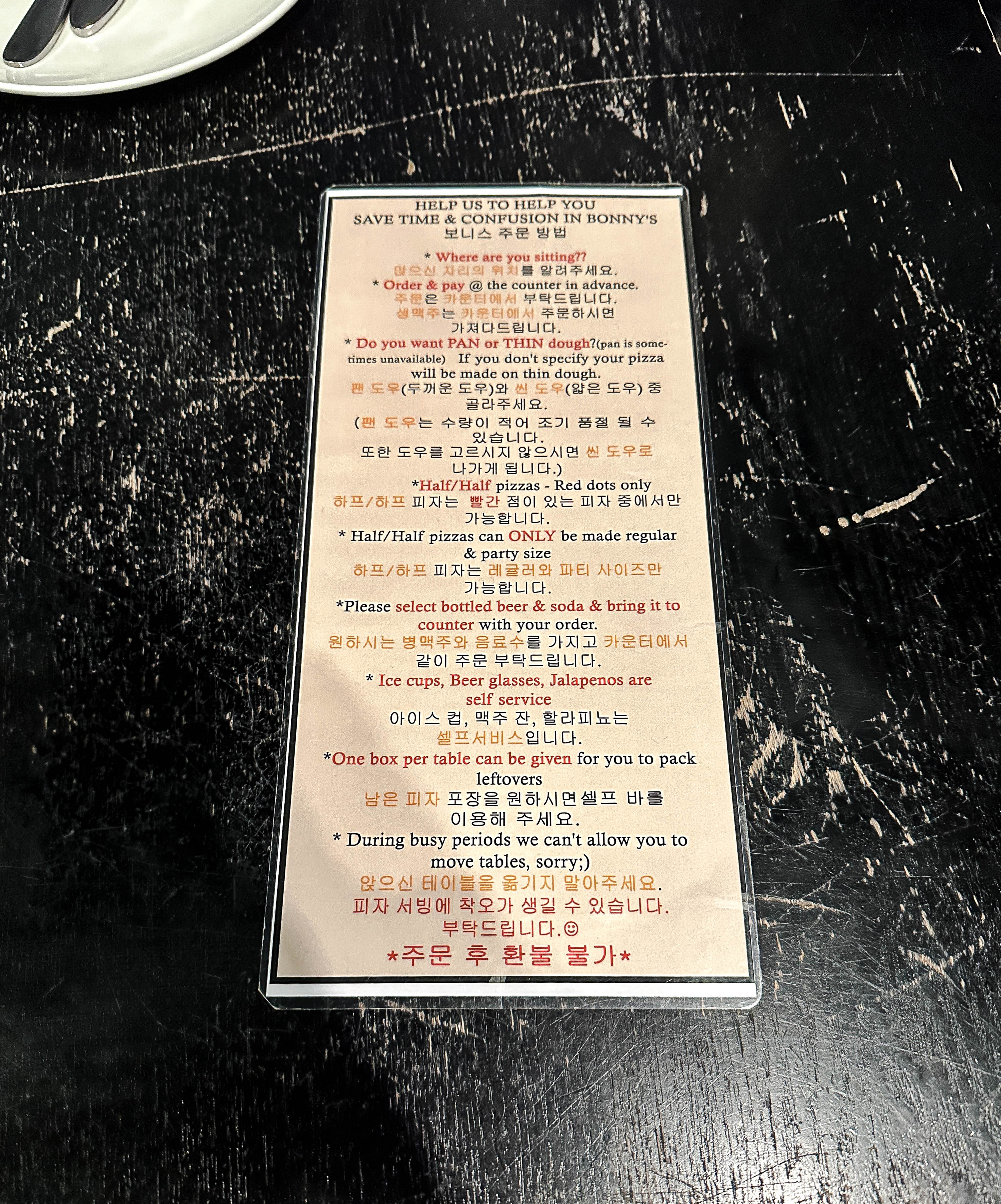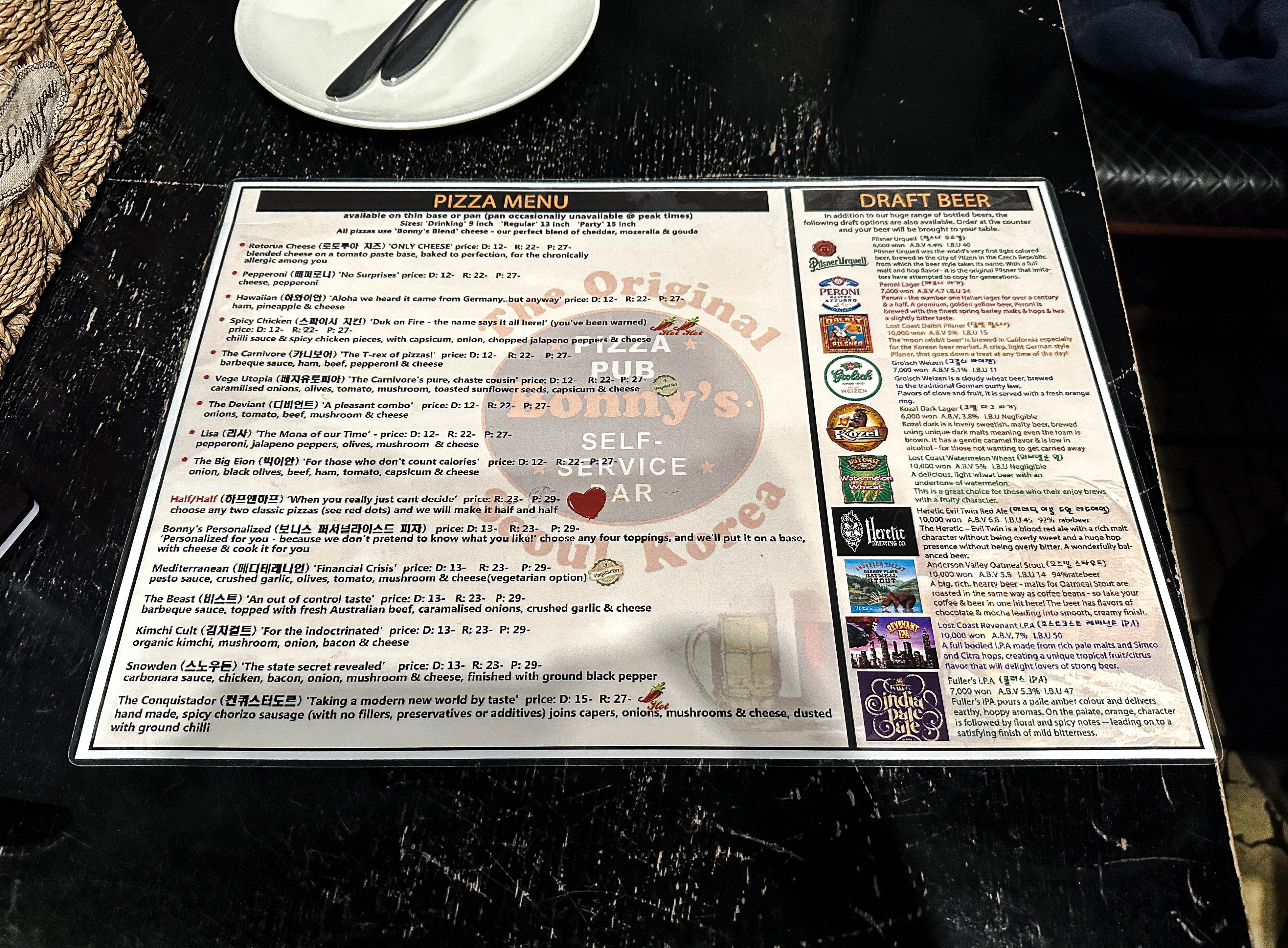 해방촌 보니스피자펍은 서울 용산구 용산동2가 44-19, 1층 에 위치한 가게입니다. 가게엔 외국인 손님들이 많이 있었고, 펍(Pub) 이라는 이름을 보면 알 수 있듯이 주로 맥주와 함께 피자를 먹고 있었습니다.