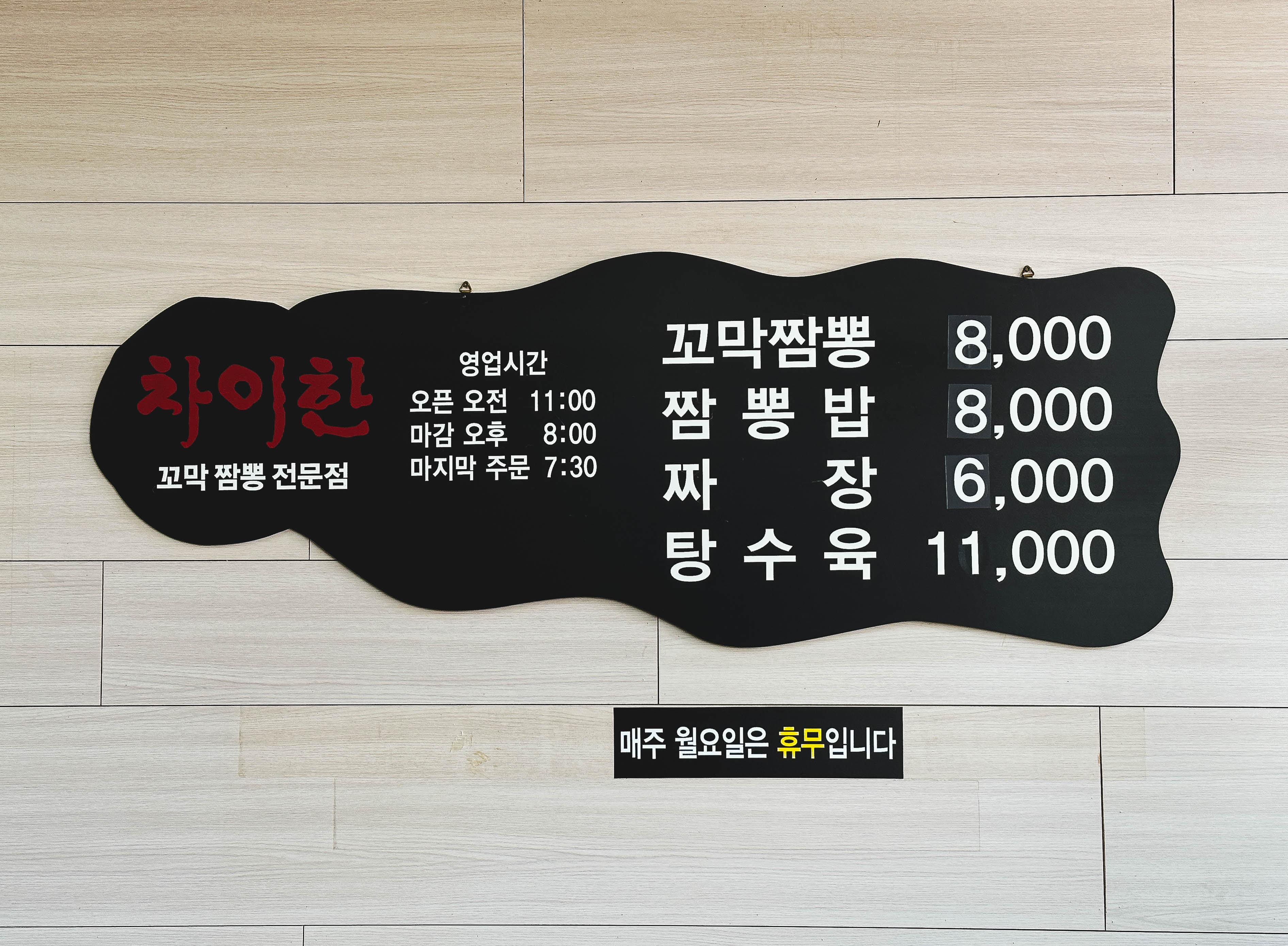 차이한의 메뉴는 꼬막짬뽕, 짬뽕밥, 짜장, 탕수육이 있었습니다. 메뉴의 가격은 6,000원~ 8,000원 사이로 일반적인 중식당과 비슷한 수준이었습니다. 저희는 꼬막짬뽕, 짜장, 탕수육을 주문했습니다.