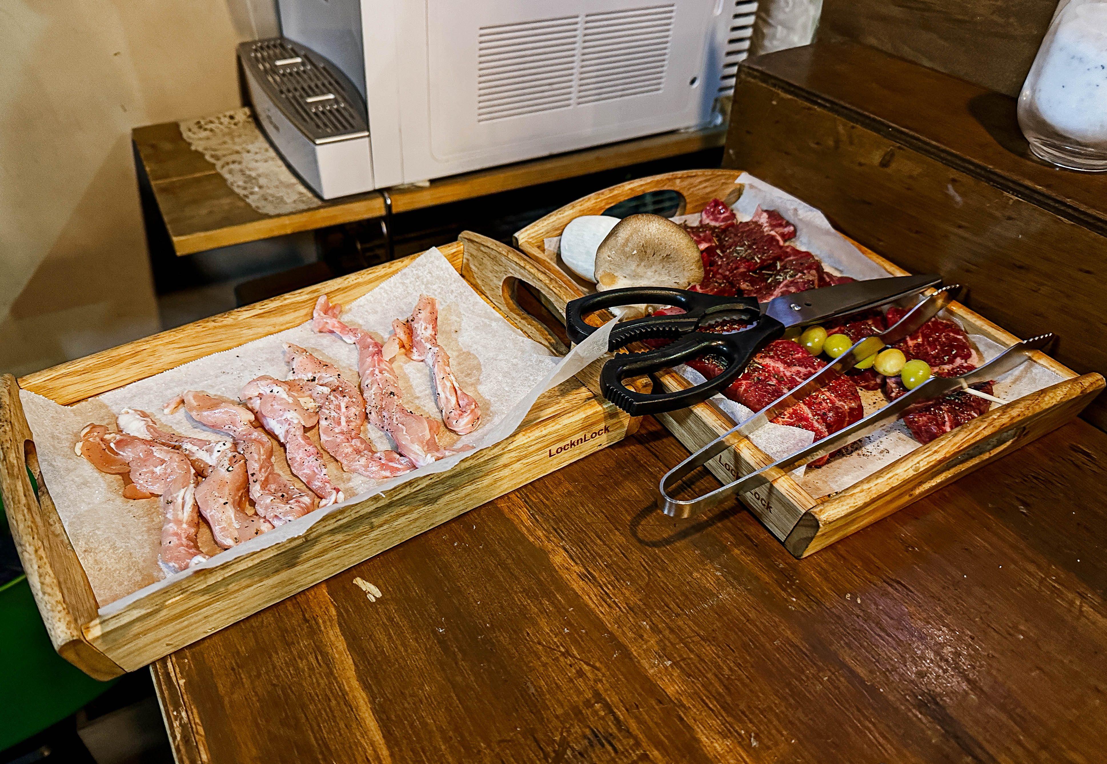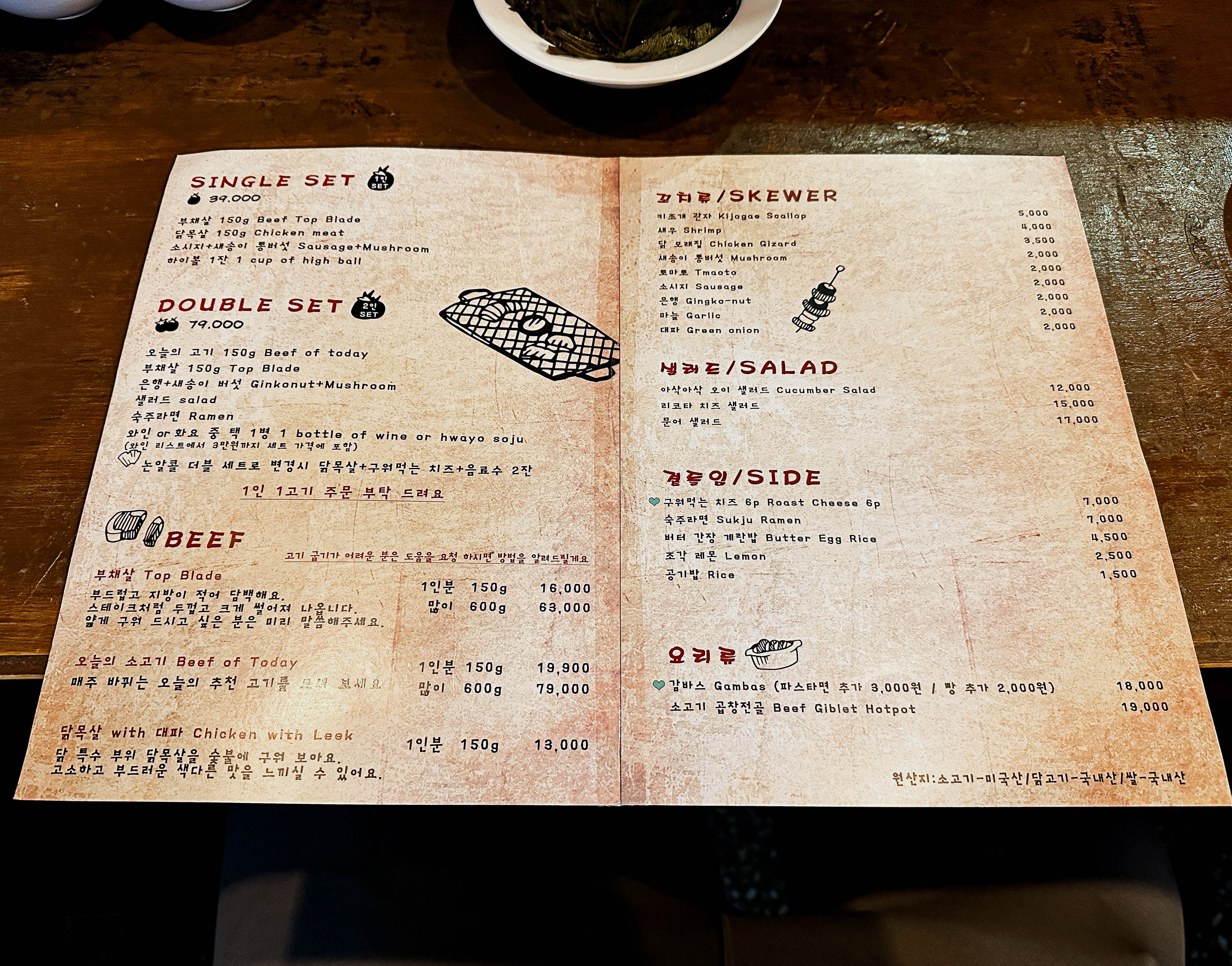 저희는 오늘의고기, 부채살, 은행+새송이버섯, 샐러드, 숙주라면, 음료가 포함된 더블세트(Double set)를 주문했습니다.