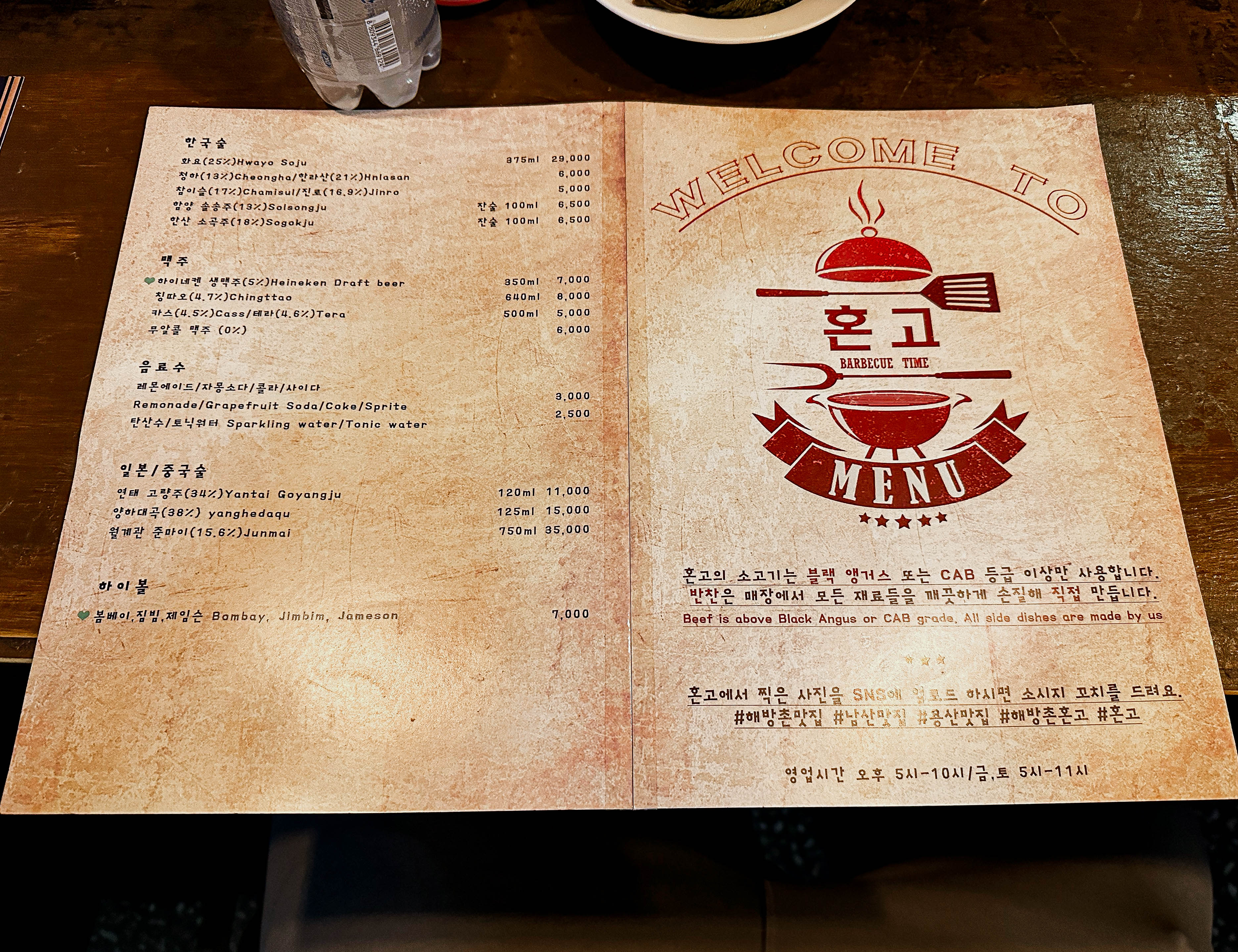 해방촌 혼고의 메뉴는 세트메뉴, 부채살, 오늘의소고기, 닭목살, 키조개관자, 새우, 닭모래집, 새송이통버섯, 토마토, 소시지, 은행, 마늘, 대파, 아삭아삭오이샐러드, 리코타치즈샐러드, 문어샐러드, 구워먹는치즈, 숙주라면, 버터간장계란밥, 조각레몬, 감바스, 소고기곱창전골 등이 있었습니다.