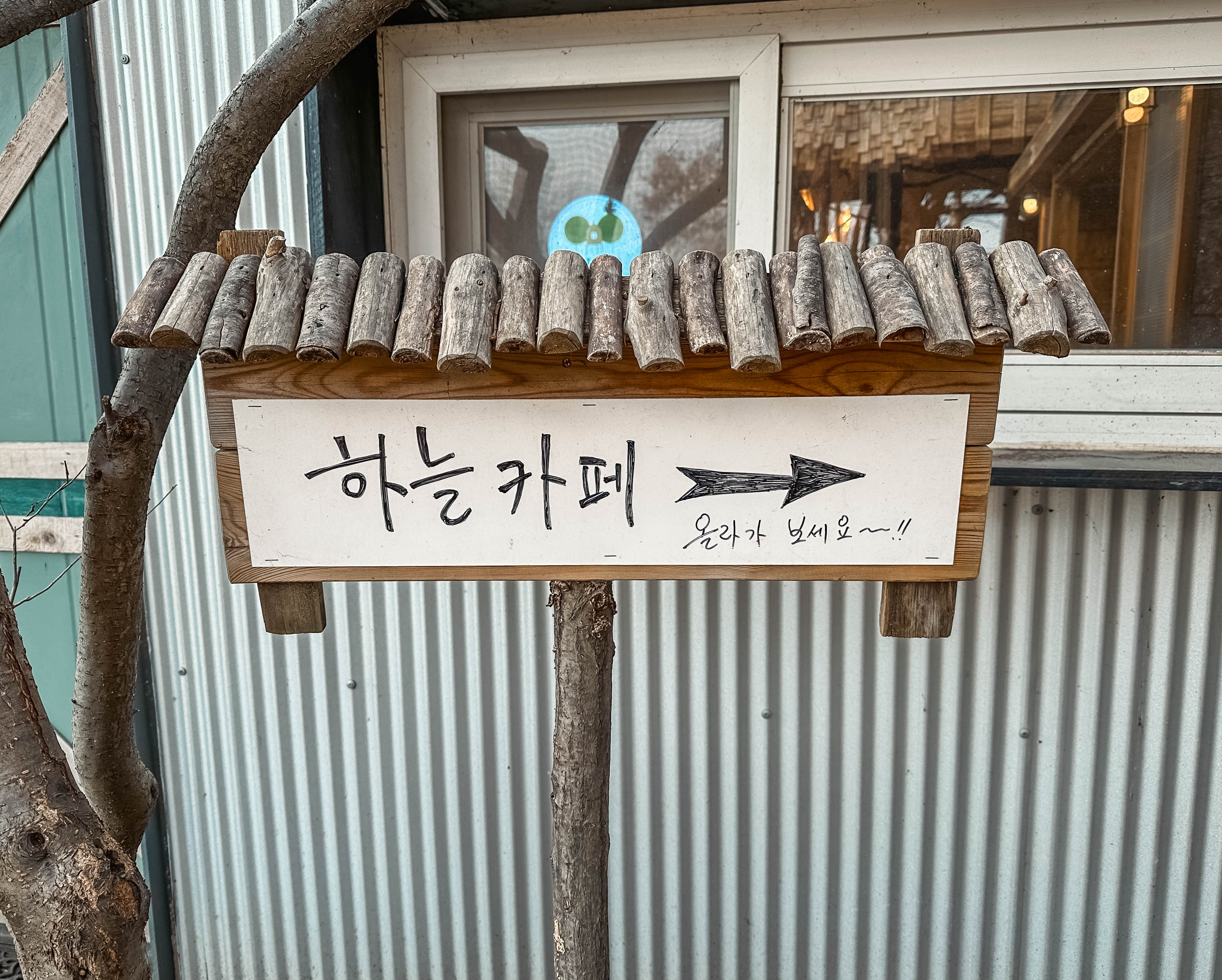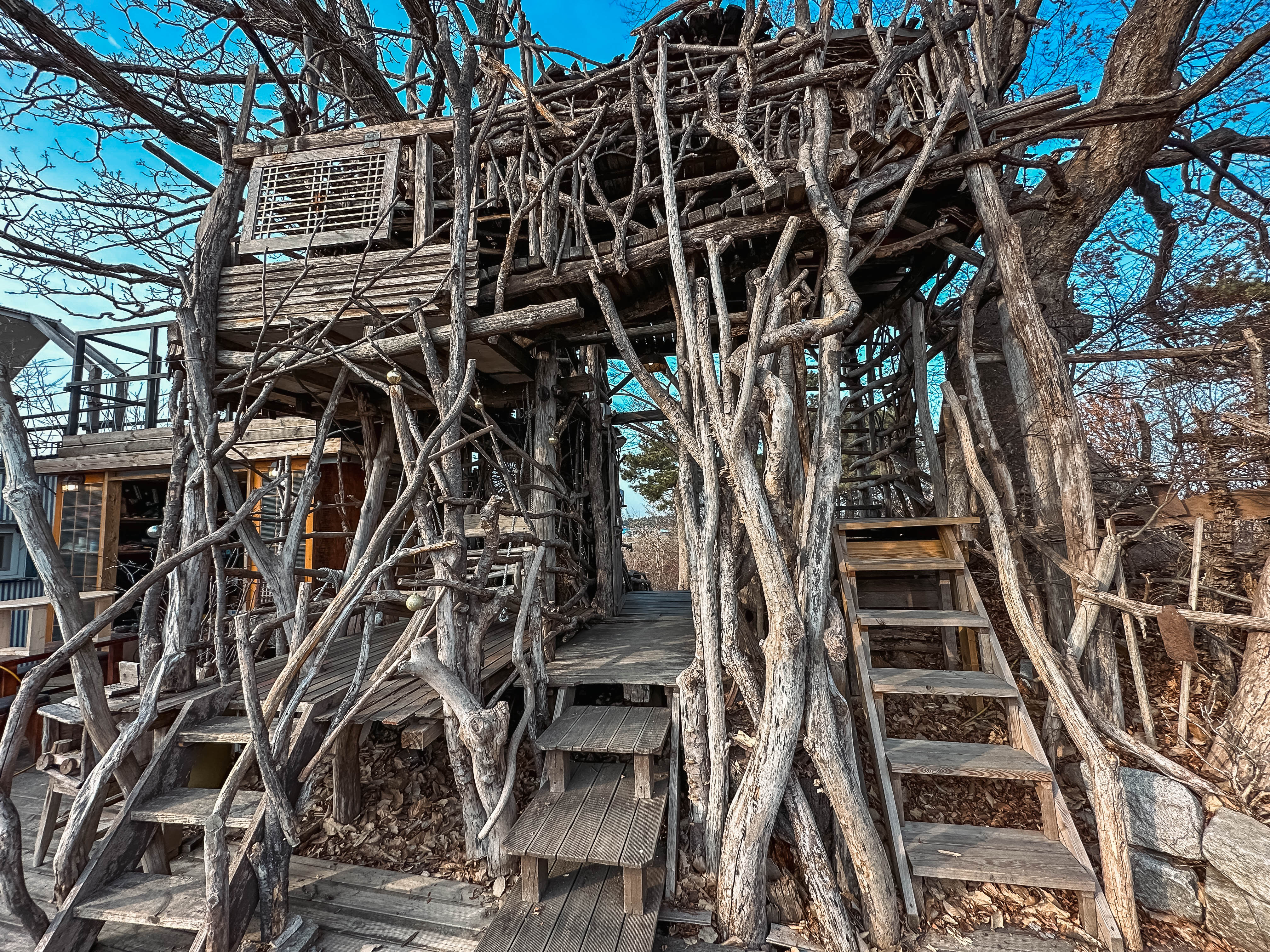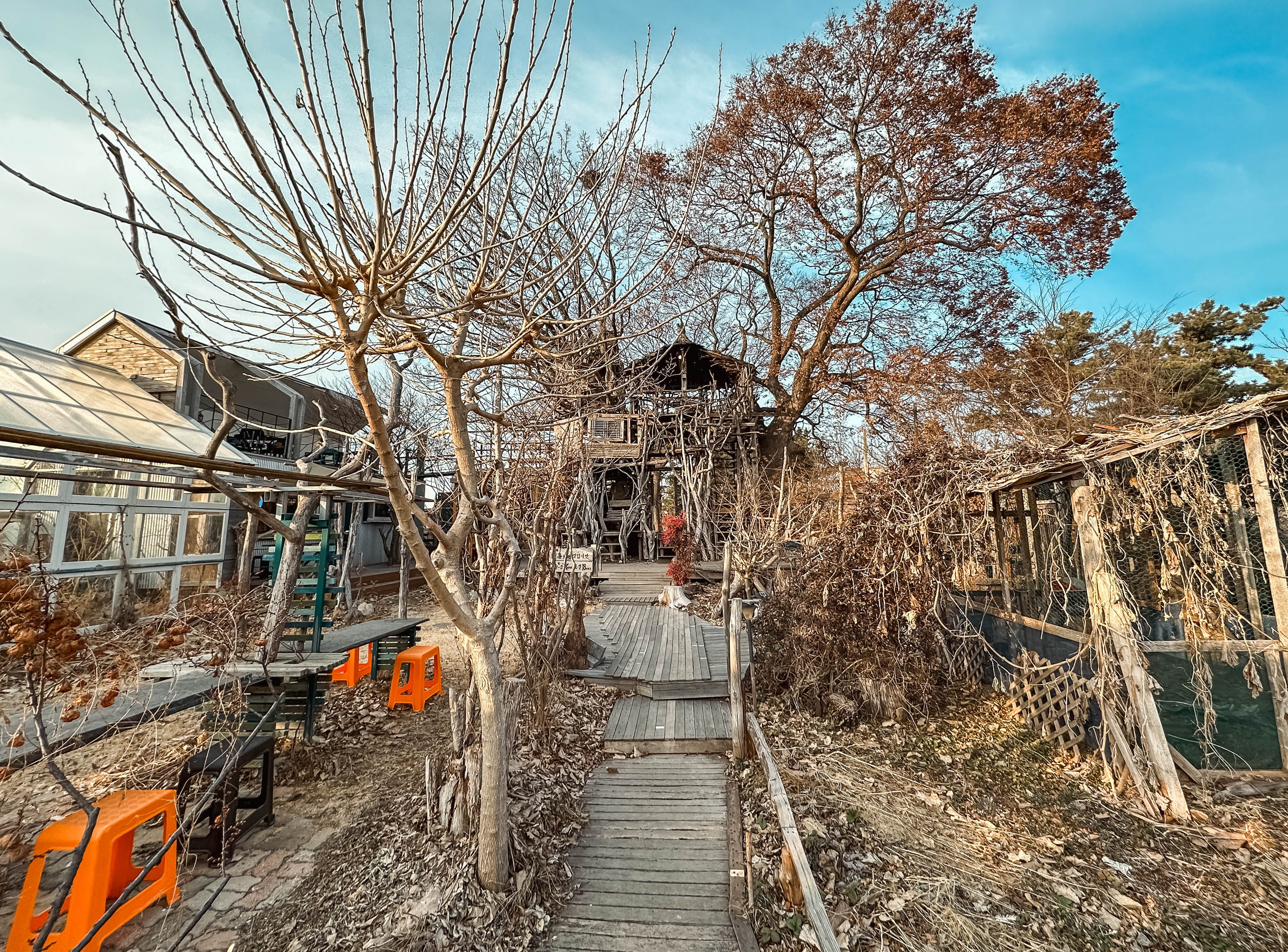 외부에는 하늘카페라고 트리하우스 모습을 볼 수 있었습니다. 트리하우스 1층에는 그네가 있어서 쉴 수 있는 공간이 있었고, 2층으로 올라가면 조금 더 넓은 나무데크 공간이 나옵니다. 테이블도 있고 의자도 있어서 분위기가 정말 좋았습니다. 봄・여름같이 날씨 좋을 때는 나뭇잎도 푸르게 올라와서 더 멋질 것 같더라고요.