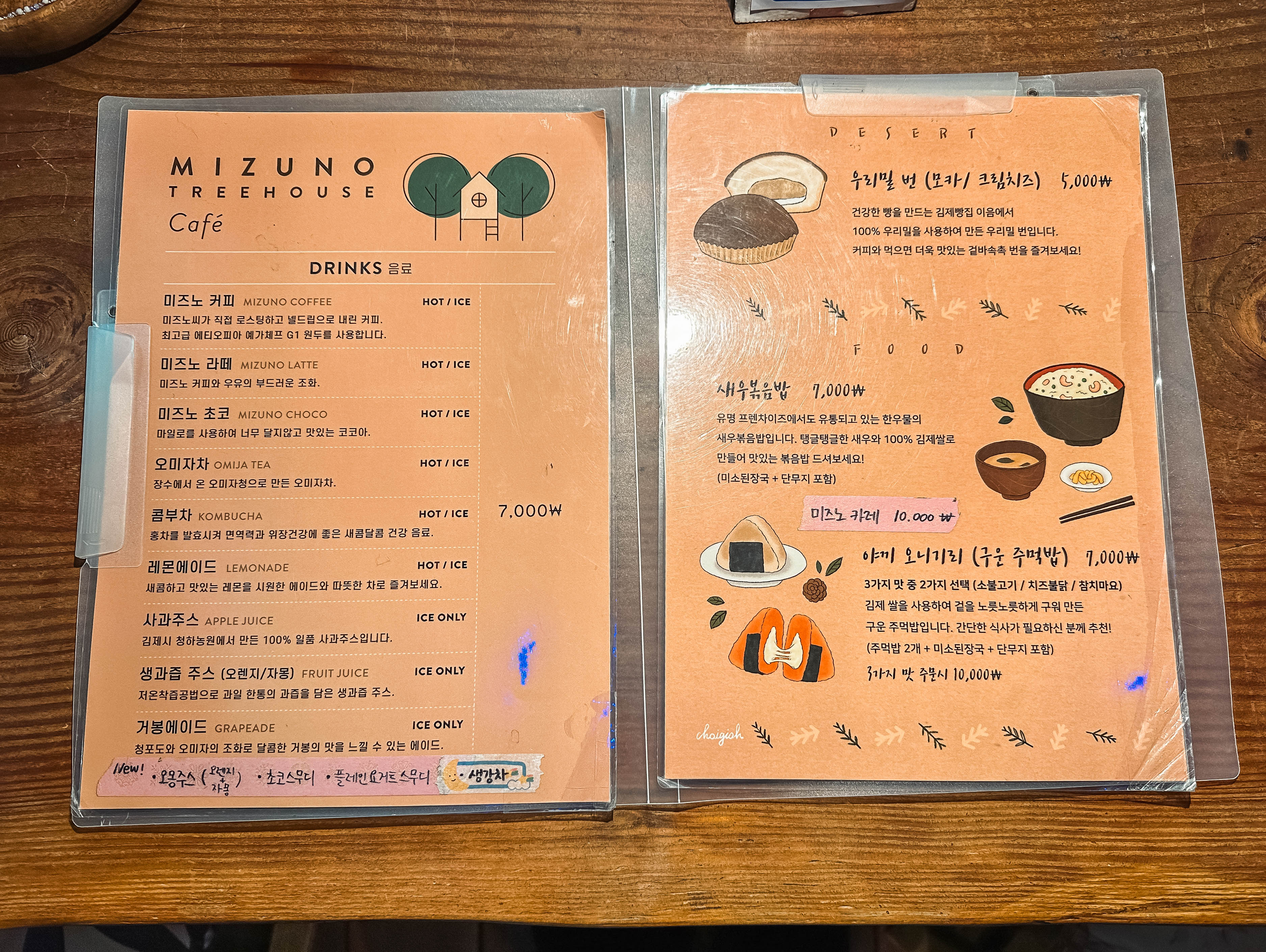 미즈노씨네 트리하우스 카페의 메뉴는 미즈노커피, 미즈노라떼, 미즈노초코, 오미자차, 콤부차, 레몬에이드, 사과주스, 생과즙주스, 거봉에이드, 오몽주스, 초코스무디, 플레인요거트스무디, 생강차, 우리밀번, 새우볶음밥, 미즈노카레, 야끼오니기리 등이 있었습니다. 음료 가격은 일괄 7,000원이었습니다.
