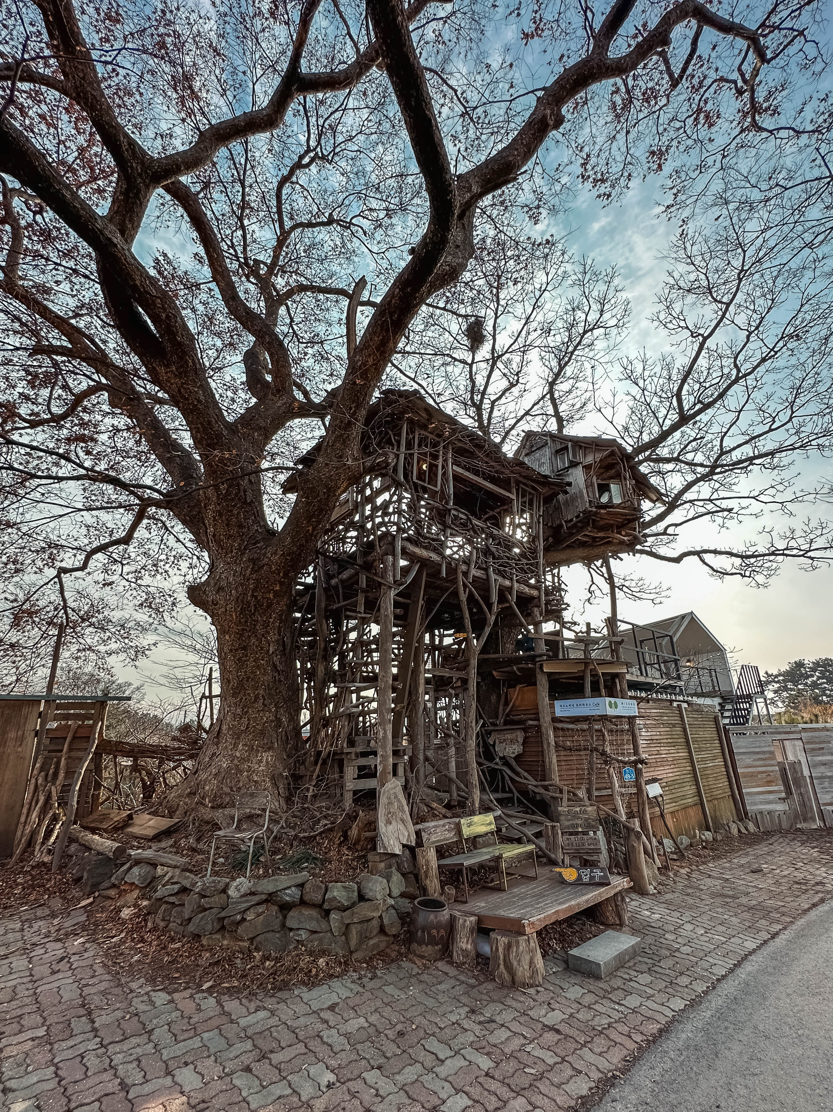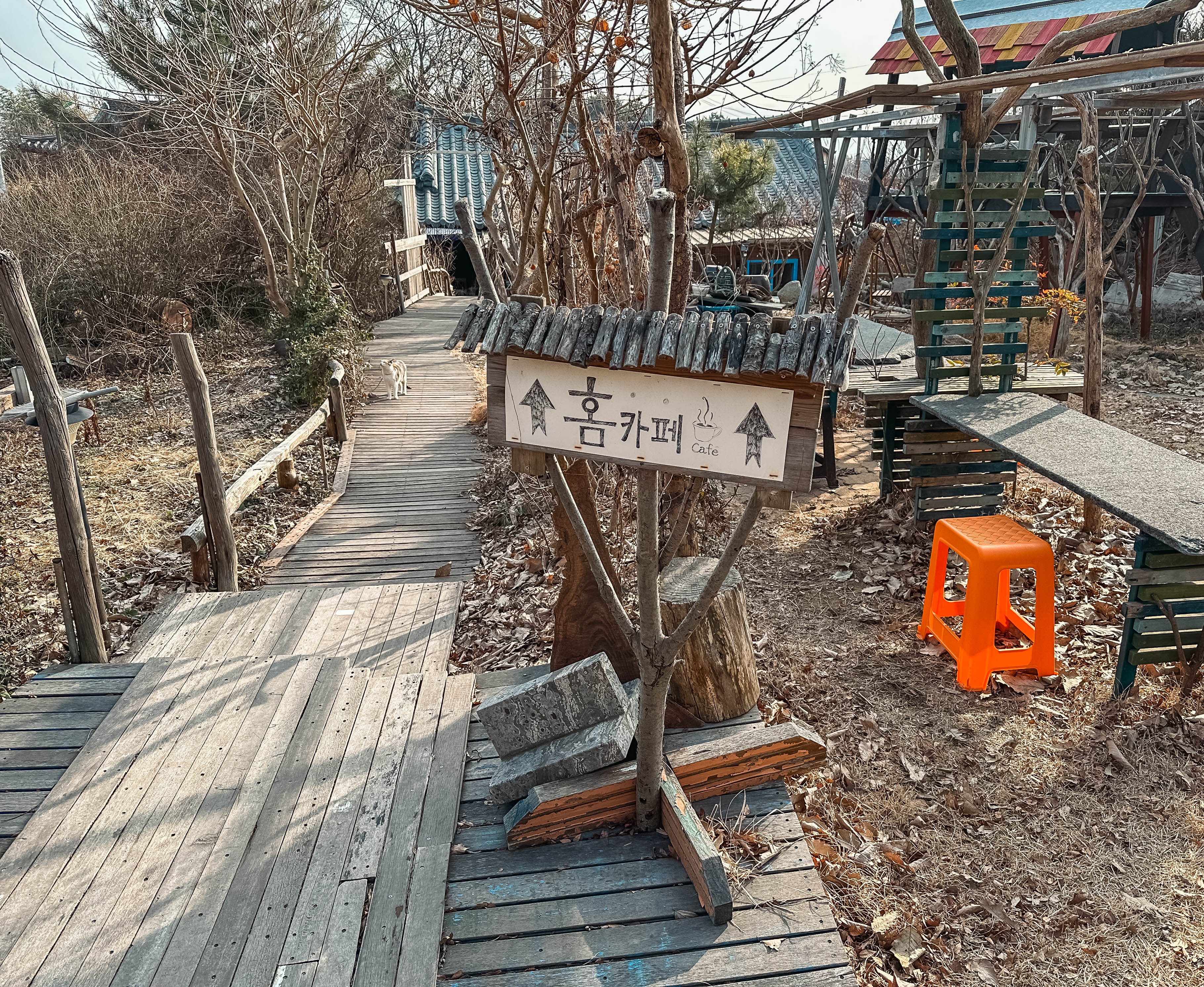 외부에는 하늘카페라고 트리하우스 모습을 볼 수 있었습니다. 트리하우스 1층에는 그네가 있어서 쉴 수 있는 공간이 있었고, 2층으로 올라가면 조금 더 넓은 나무데크 공간이 나옵니다. 테이블도 있고 의자도 있어서 분위기가 정말 좋았습니다. 봄・여름같이 날씨 좋을 때는 나뭇잎도 푸르게 올라와서 더 멋질 것 같더라고요.