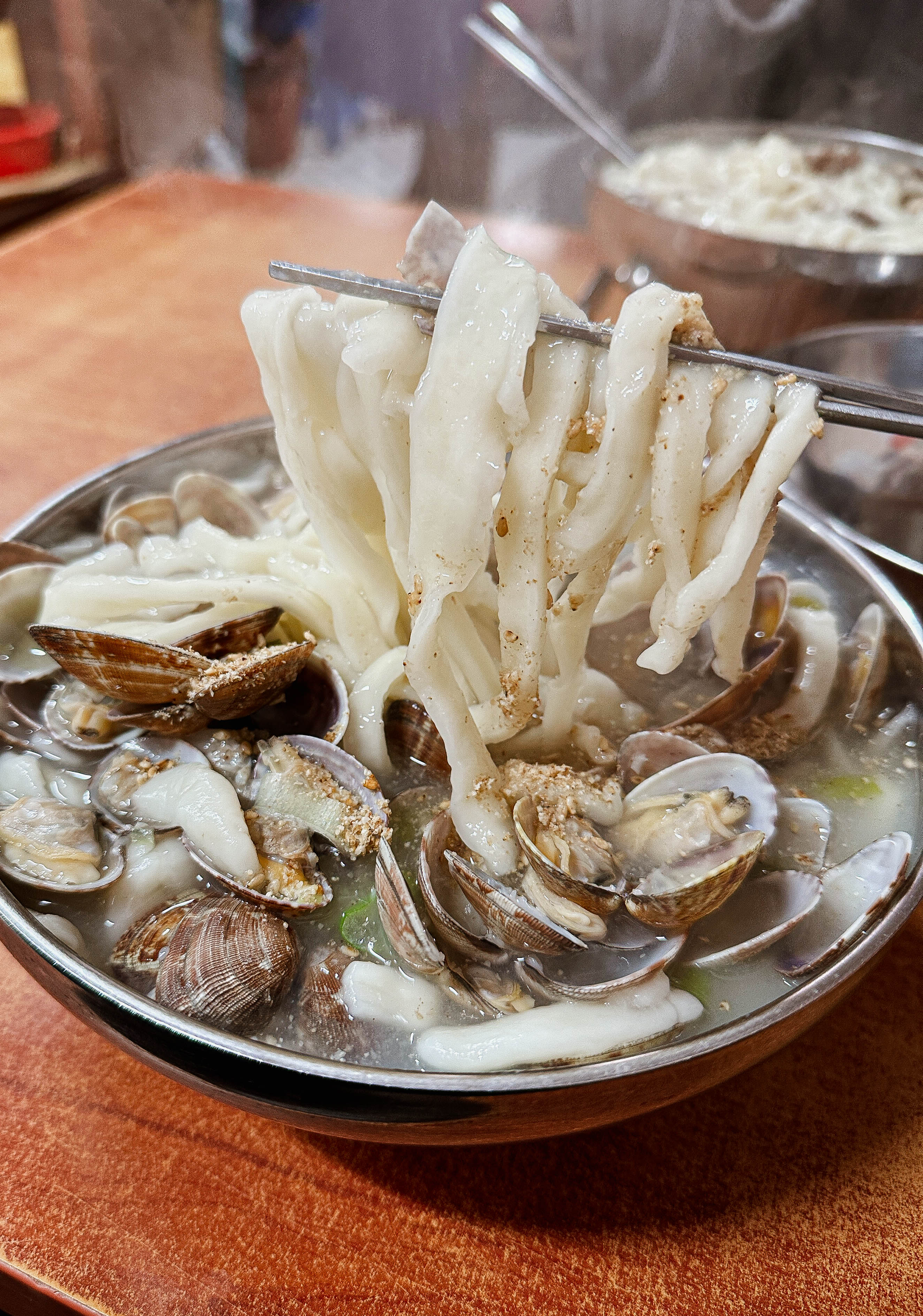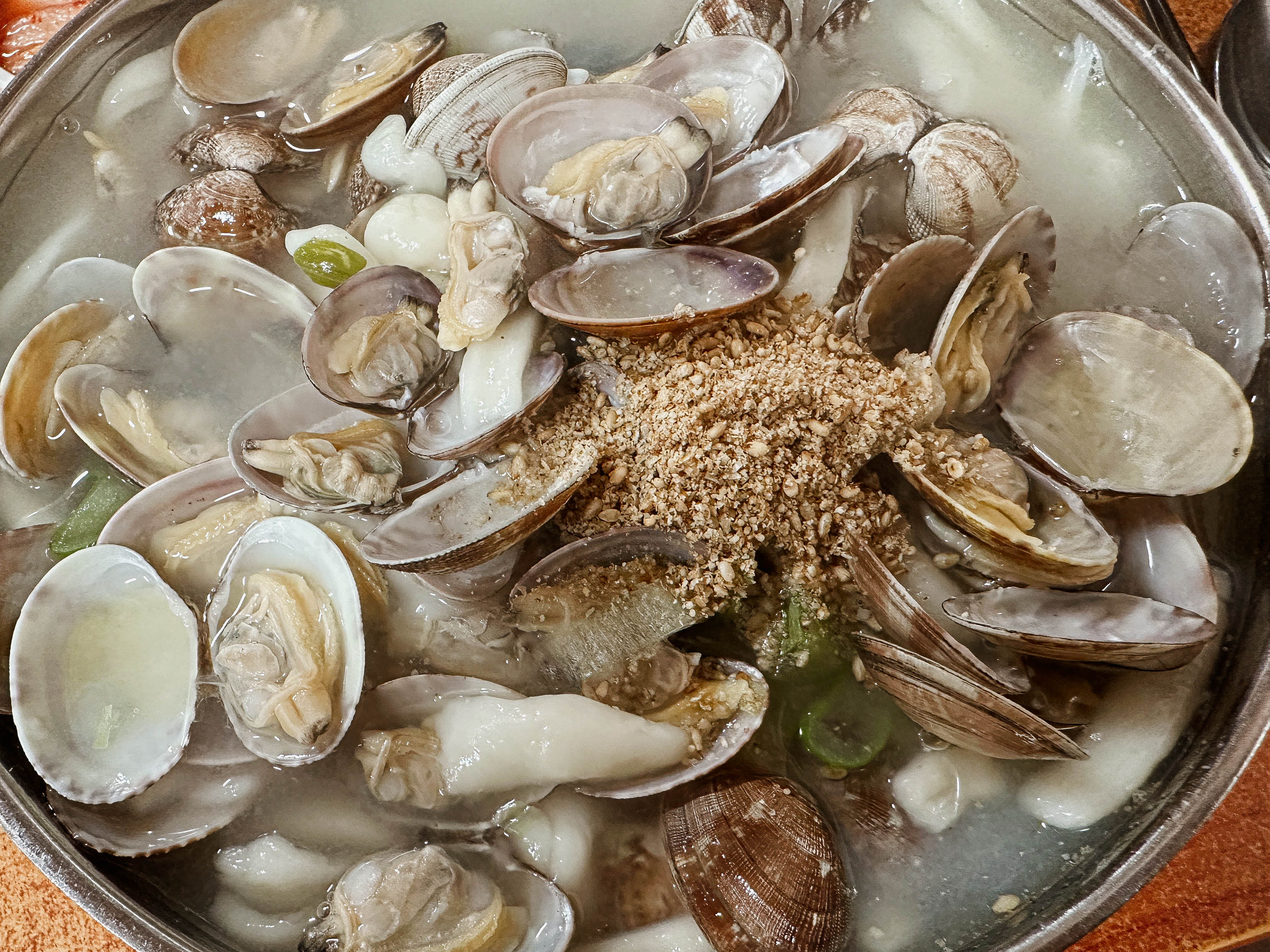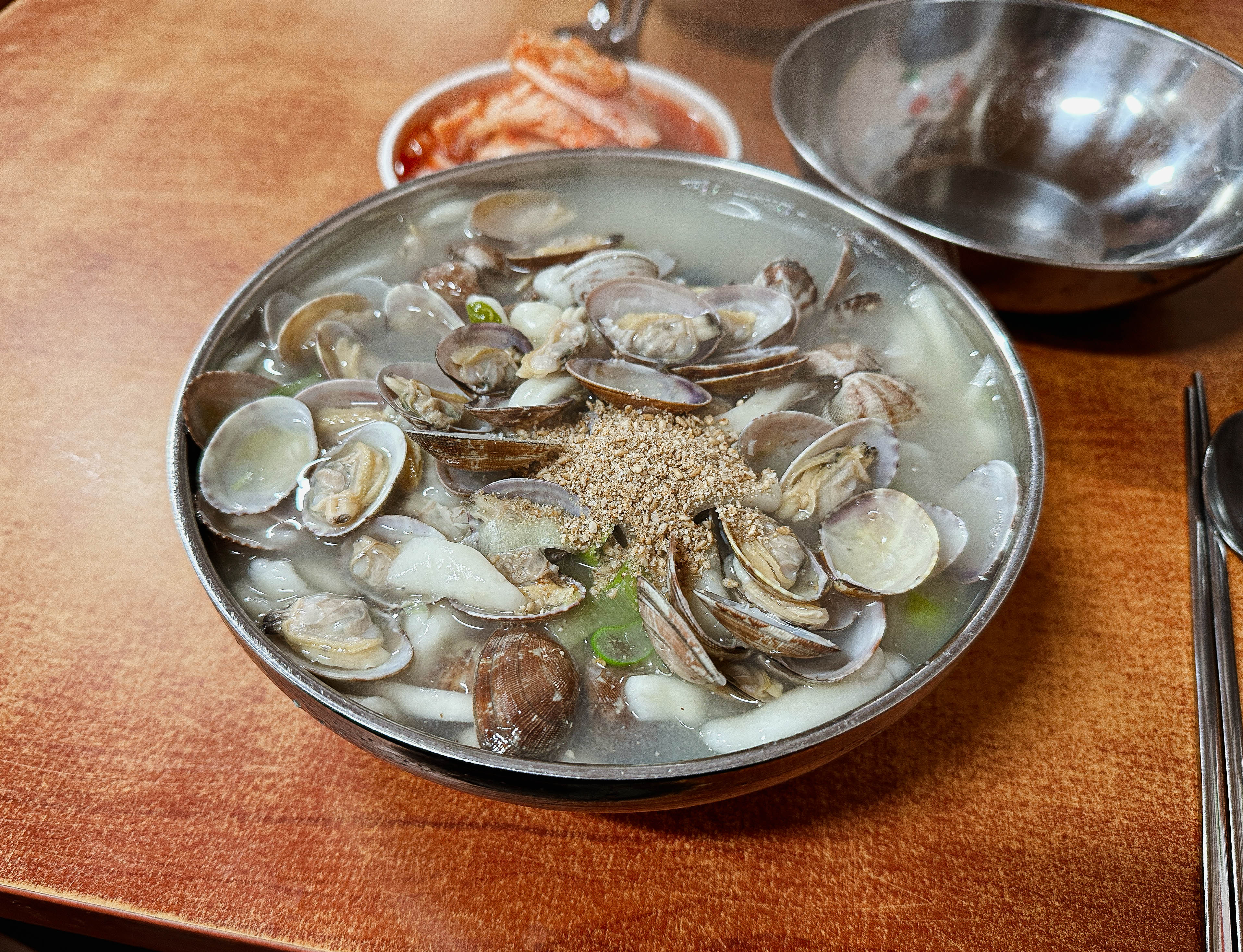 칼국수에 바지락도 많이 들어있고, 고소한 맛 그리고 직접 반죽한 투박한 면은 괜찮았습니다. 그런데 국물의 맛과 해감이 덜 된 바지락은 조금 실망스러운 부분이었습니다. 시장 안에 있는 가게여서 그런지 오로지 현금으로만 받는 점도 아쉬운 부분이었고요. 평점이 좋길래 방문했는데, 저는 개인적으로 태안에서 굳이 식사해야 한다면 다른 메뉴를 찾아갈 것 같습니다.