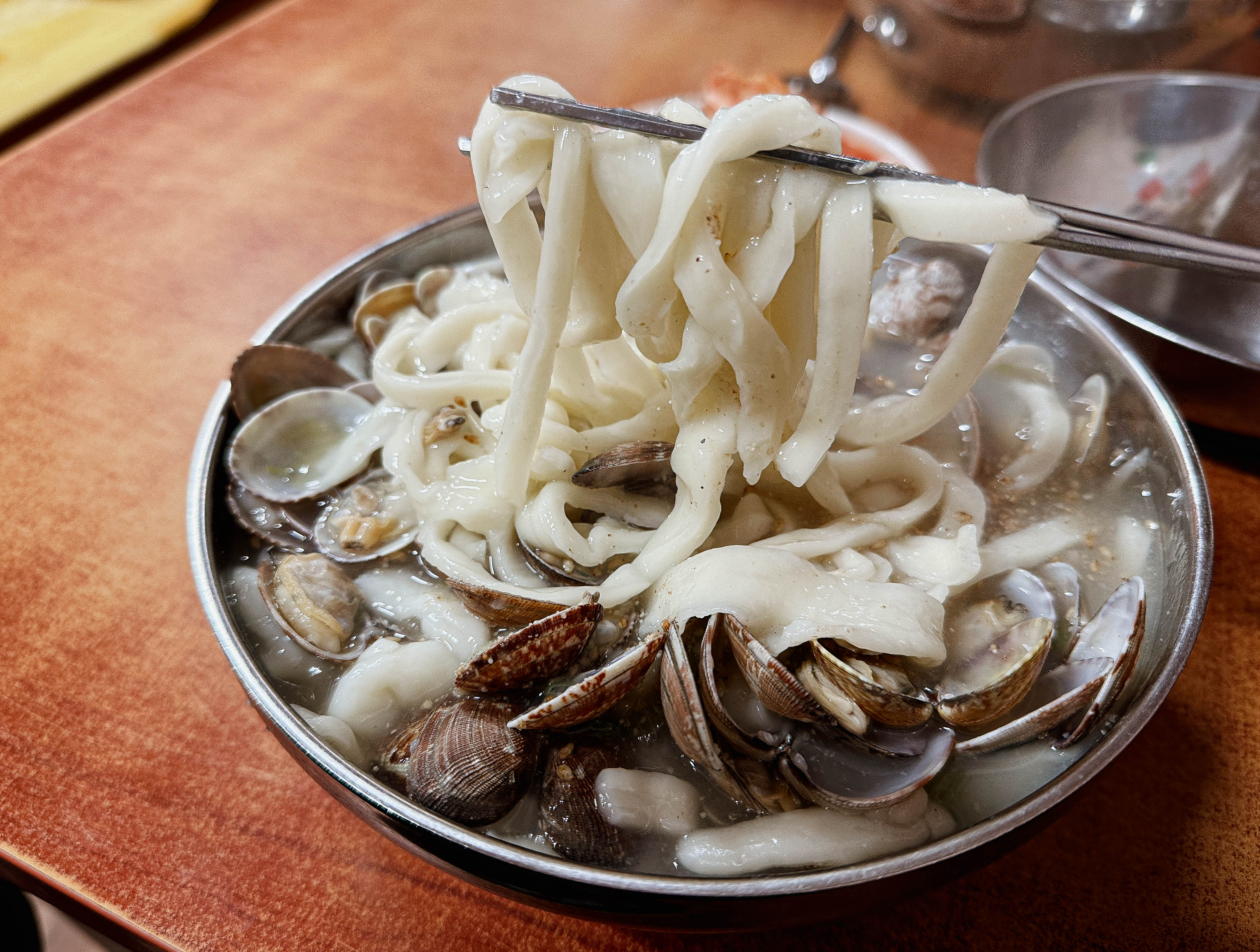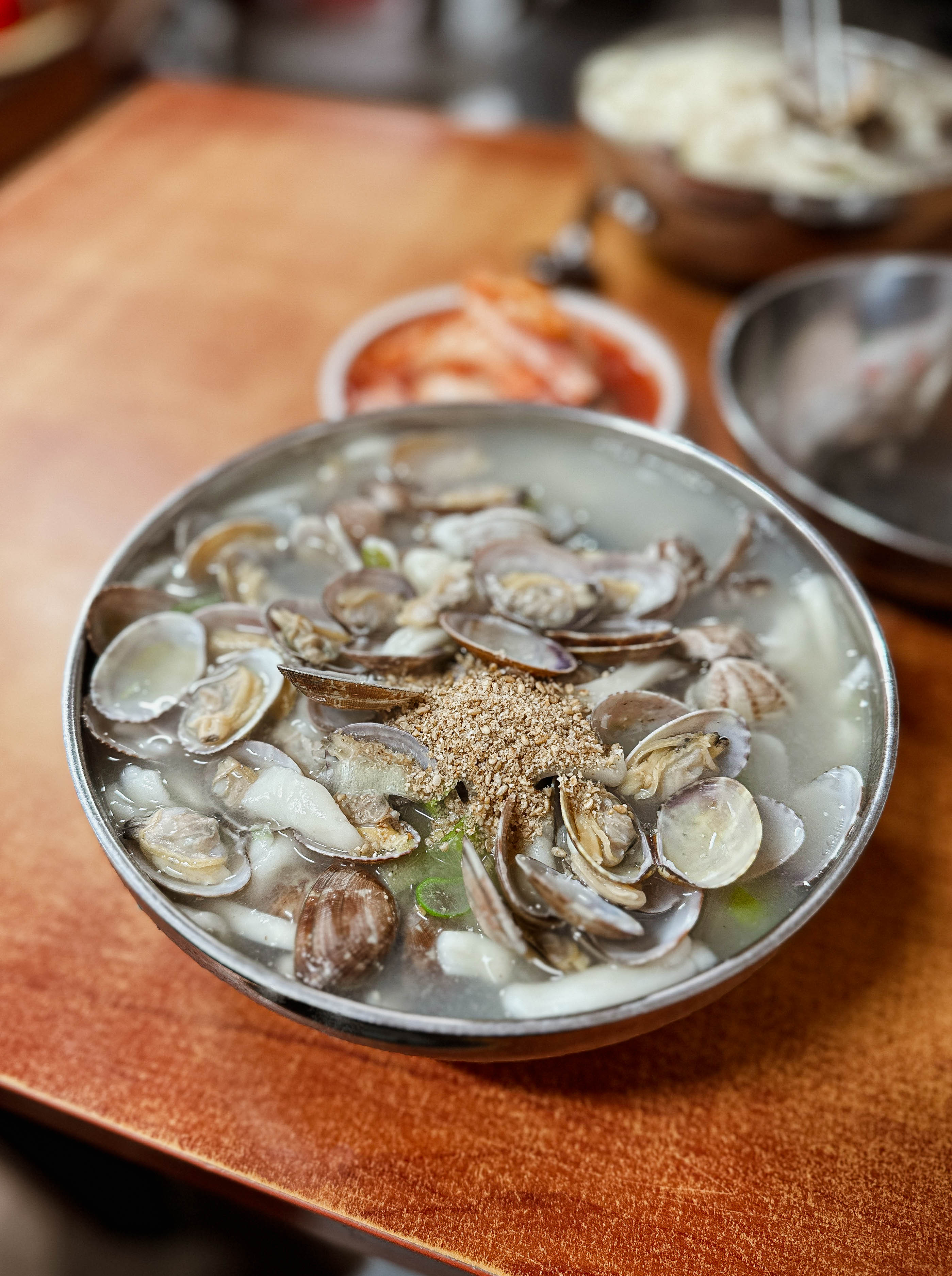 칼국수에 바지락도 많이 들어있고, 고소한 맛 그리고 직접 반죽한 투박한 면은 괜찮았습니다. 그런데 국물의 맛과 해감이 덜 된 바지락은 조금 실망스러운 부분이었습니다. 시장 안에 있는 가게여서 그런지 오로지 현금으로만 받는 점도 아쉬운 부분이었고요. 평점이 좋길래 방문했는데, 저는 개인적으로 태안에서 굳이 식사해야 한다면 다른 메뉴를 찾아갈 것 같습니다.