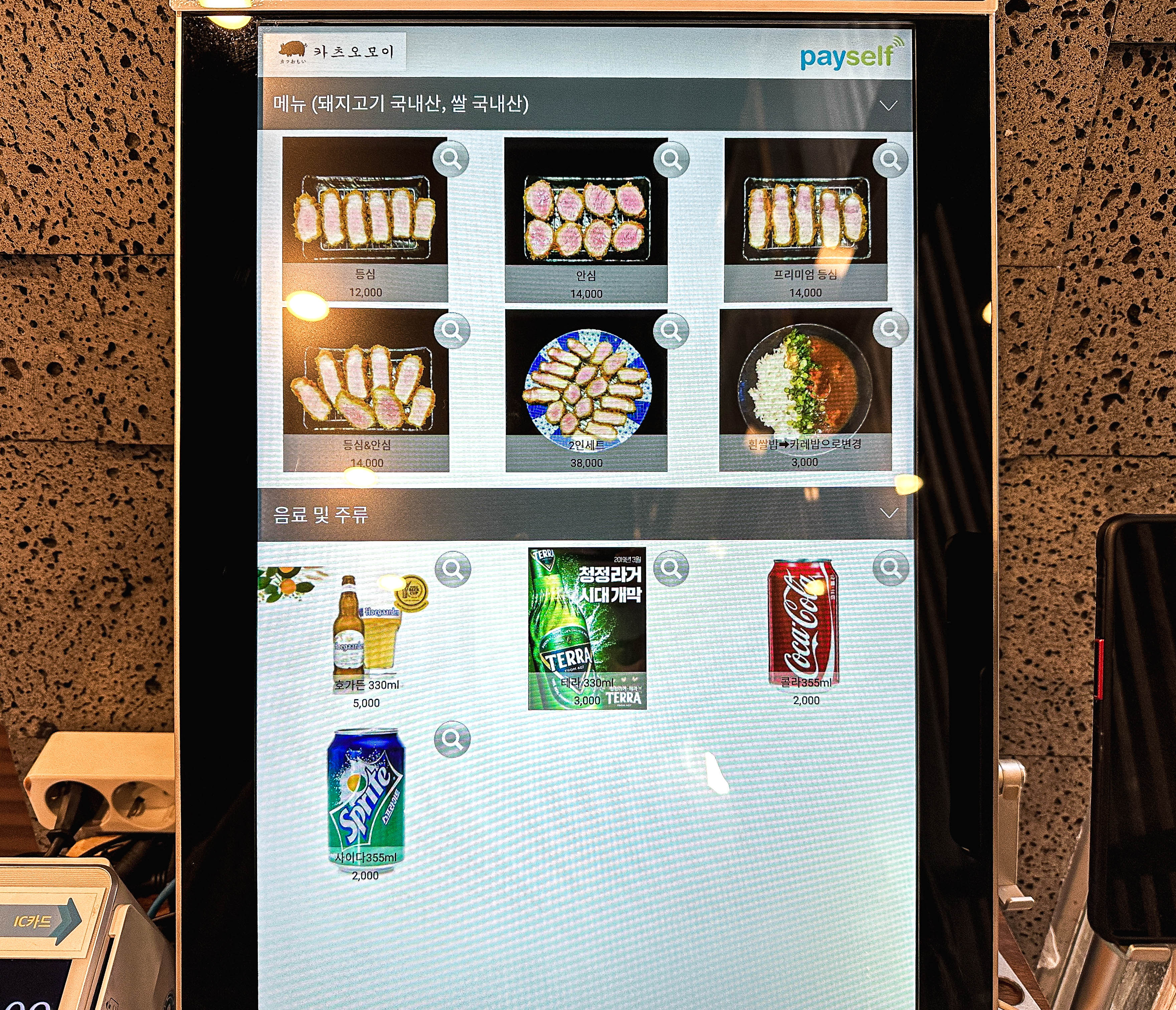 인천 구월동 카츠오모이의 메뉴는 등심, 안심, 등심+안심, 프리미엄등심, 2인세트가 있었습니다. 메뉴는 키오스크를 통해 주문했는데, 저희는 안심, 등심+안심 그리고 흰쌀밥을 카레밥으로 변경했습니다. 가격은 일반적인 일식 돈카츠 가게와 비슷한 수준이었는데, 이 날은 지인이 사줘서 따로 영수증은 챙기지 않았습니다.