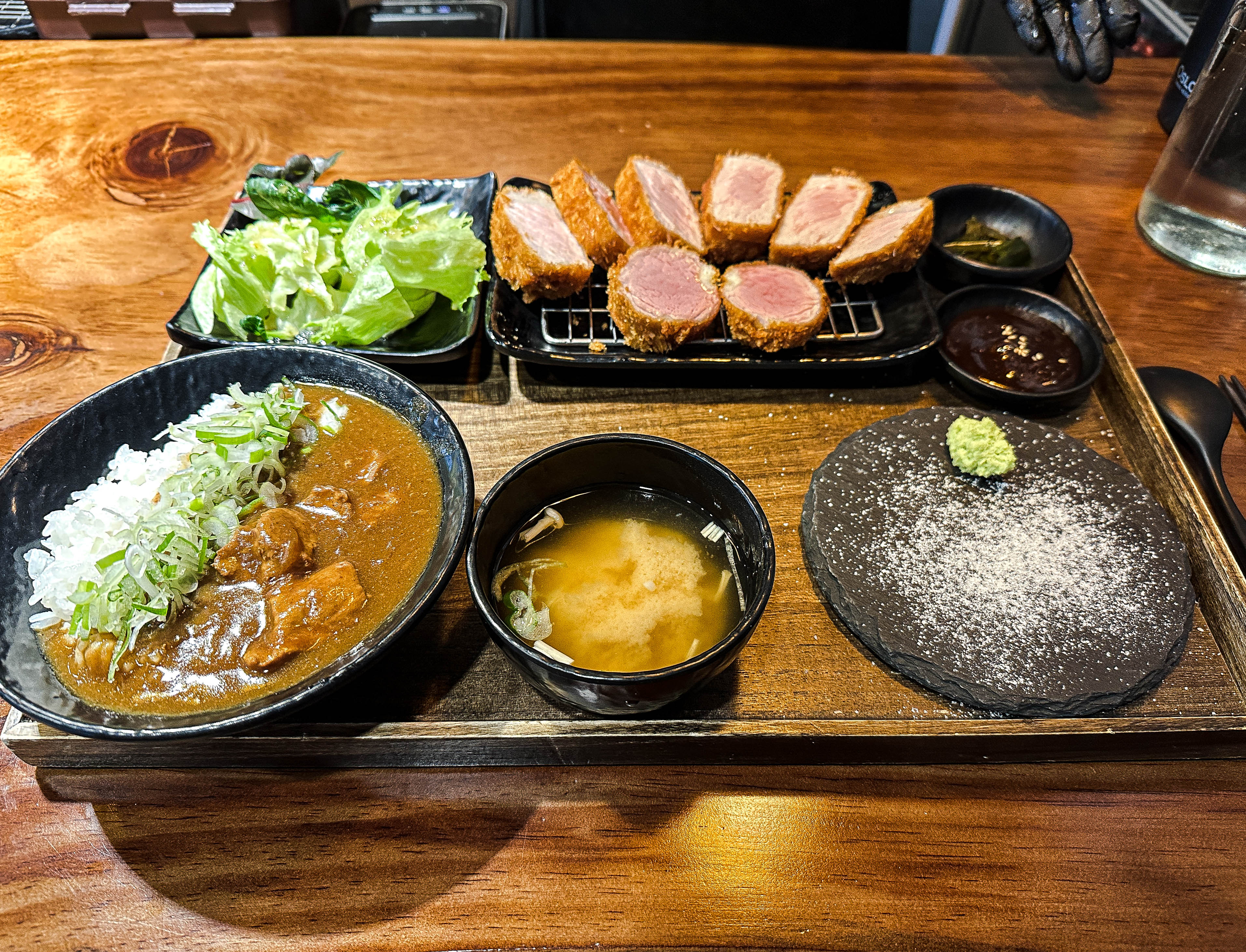 곧이어 주문한 메뉴가 나왔습니다. 제가 카츠오모이에서 주문한 메뉴는 등심+안심카츠였고, 카레밥으로 변경한 메뉴였습니다. 제가 한 식사의 금액은 17,000원이었습니다. 구성은 샐러드, 돈까스, 명이나물, 장국, 카레밥, 소스류가 나왔습니다.