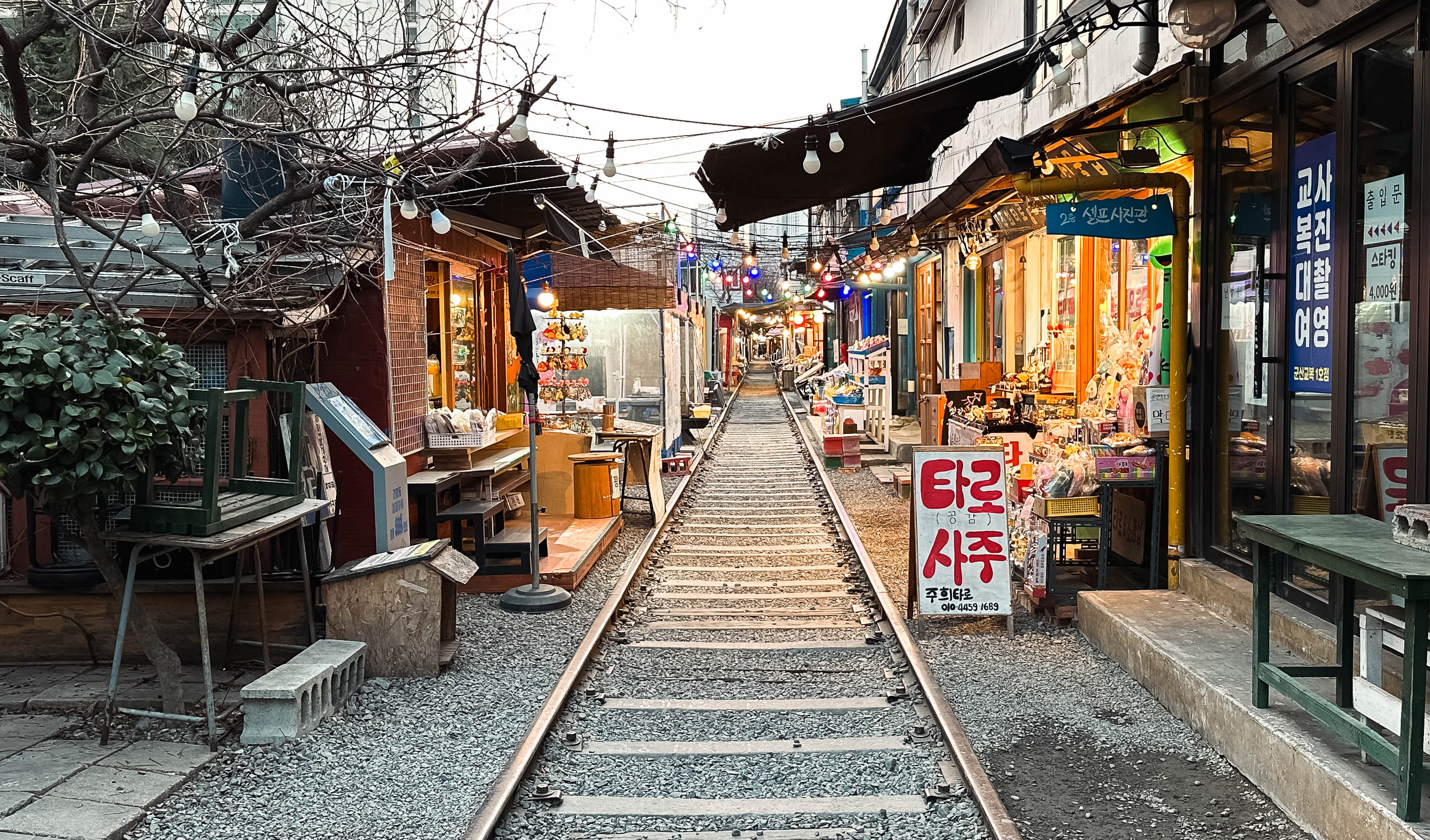 이곳은 애니메이션 '소중한 날의 꿈', 영화 '남자가 사랑할 때' 등의 배경지로 사용된 장소이기도 합니다. 조그만 기찻길 양 옆으로 아기자기한 소품을 파는 곳과 사진 촬영용 교복을 대여해 주는 상점들이 위치해 있었습니다.