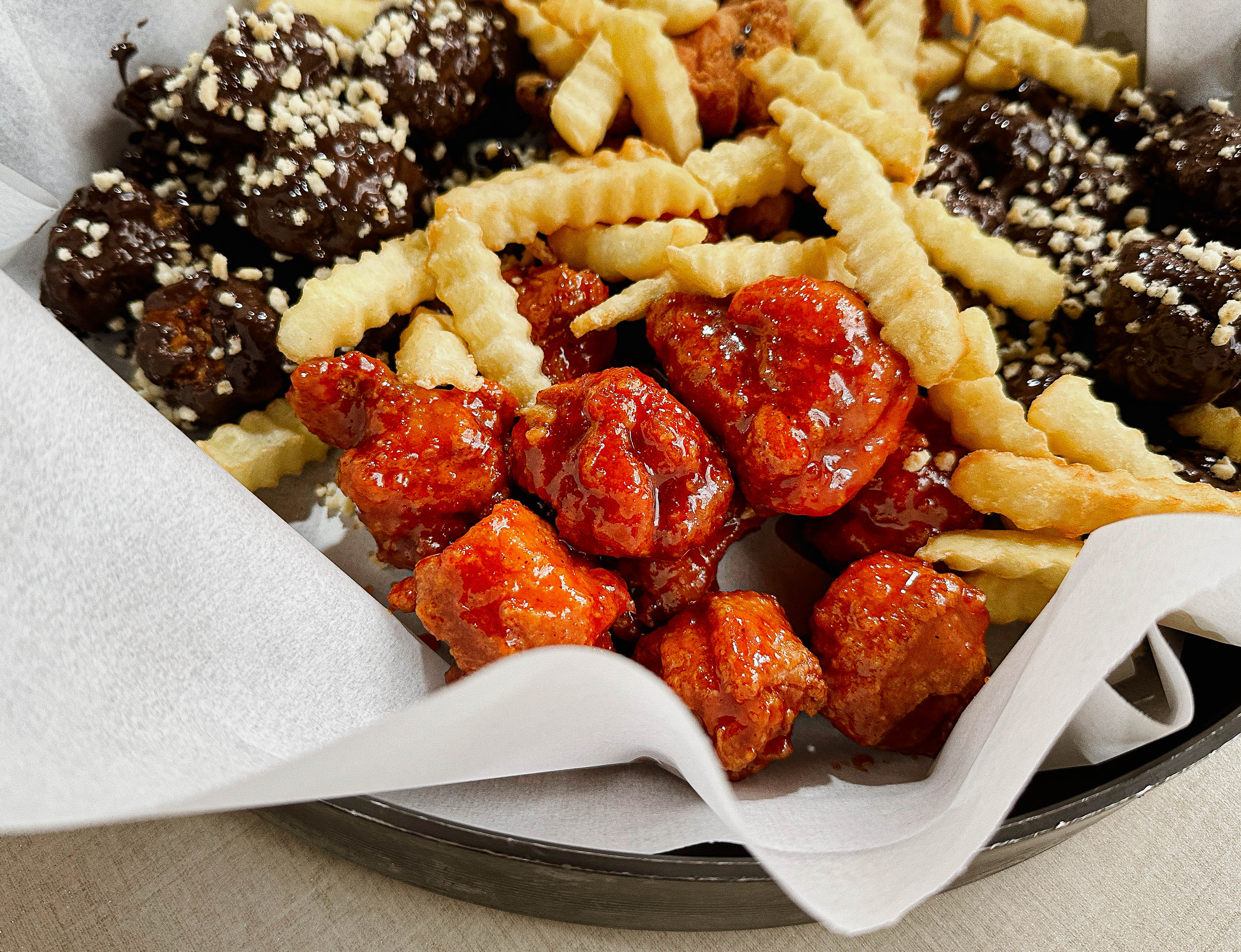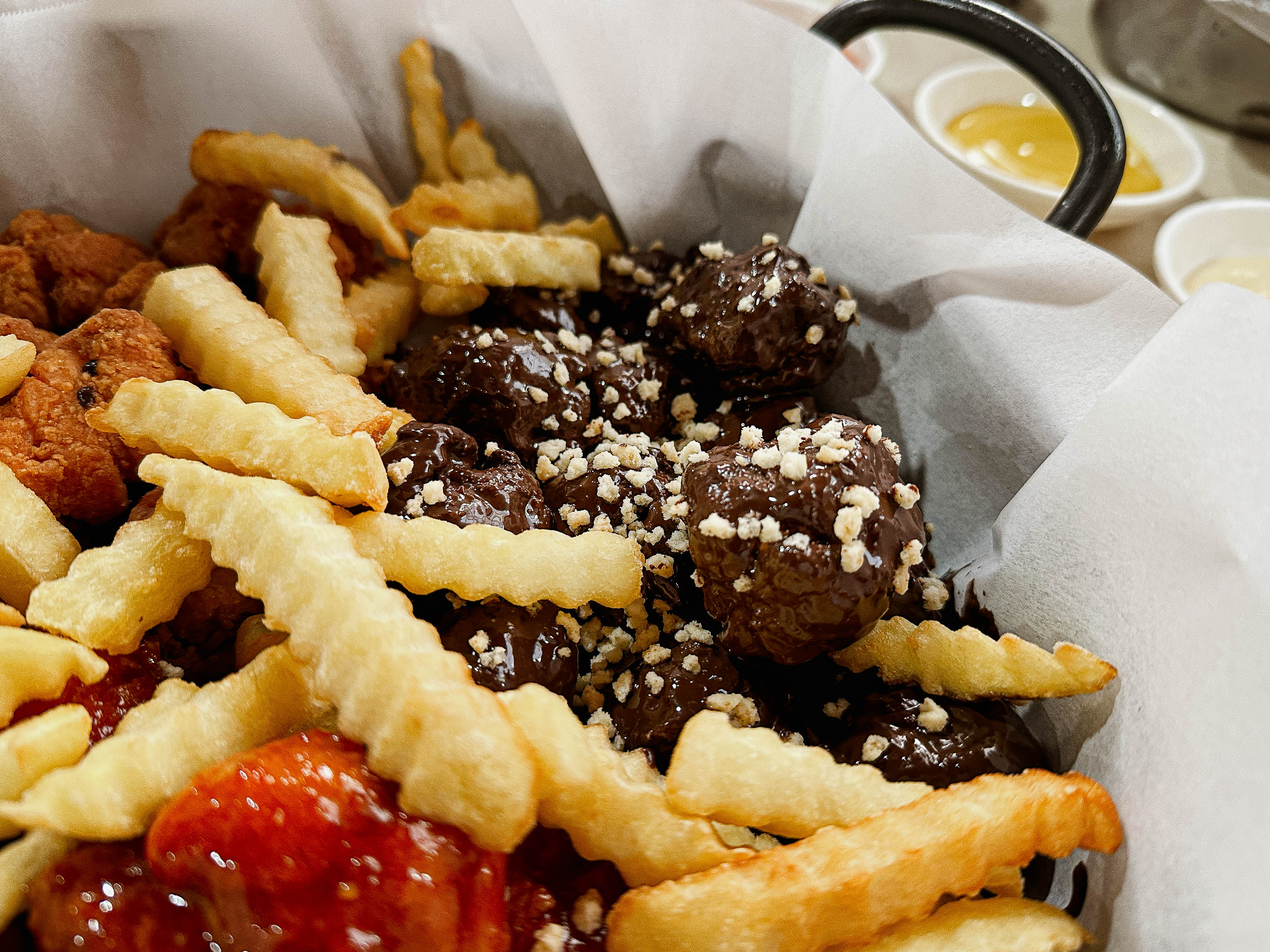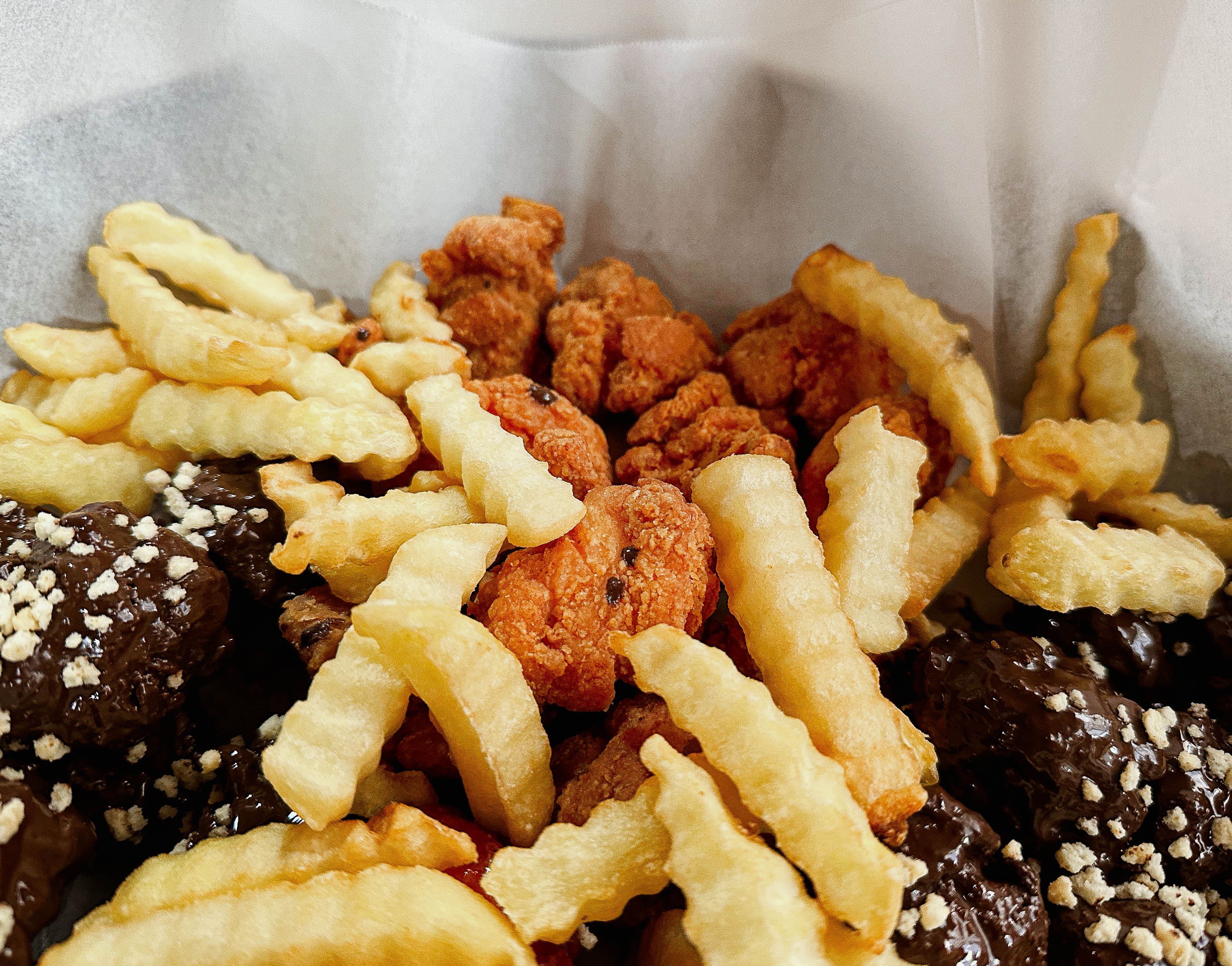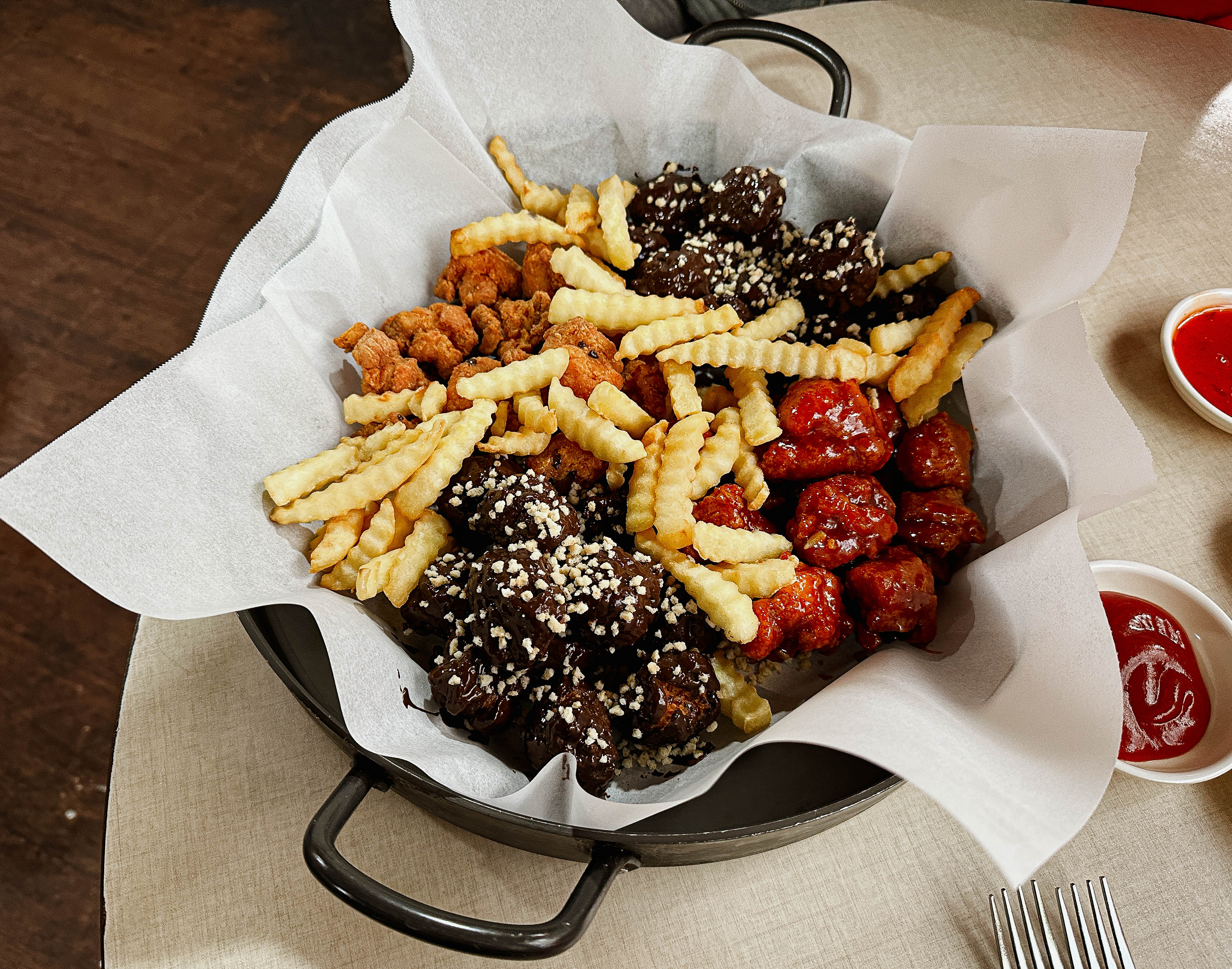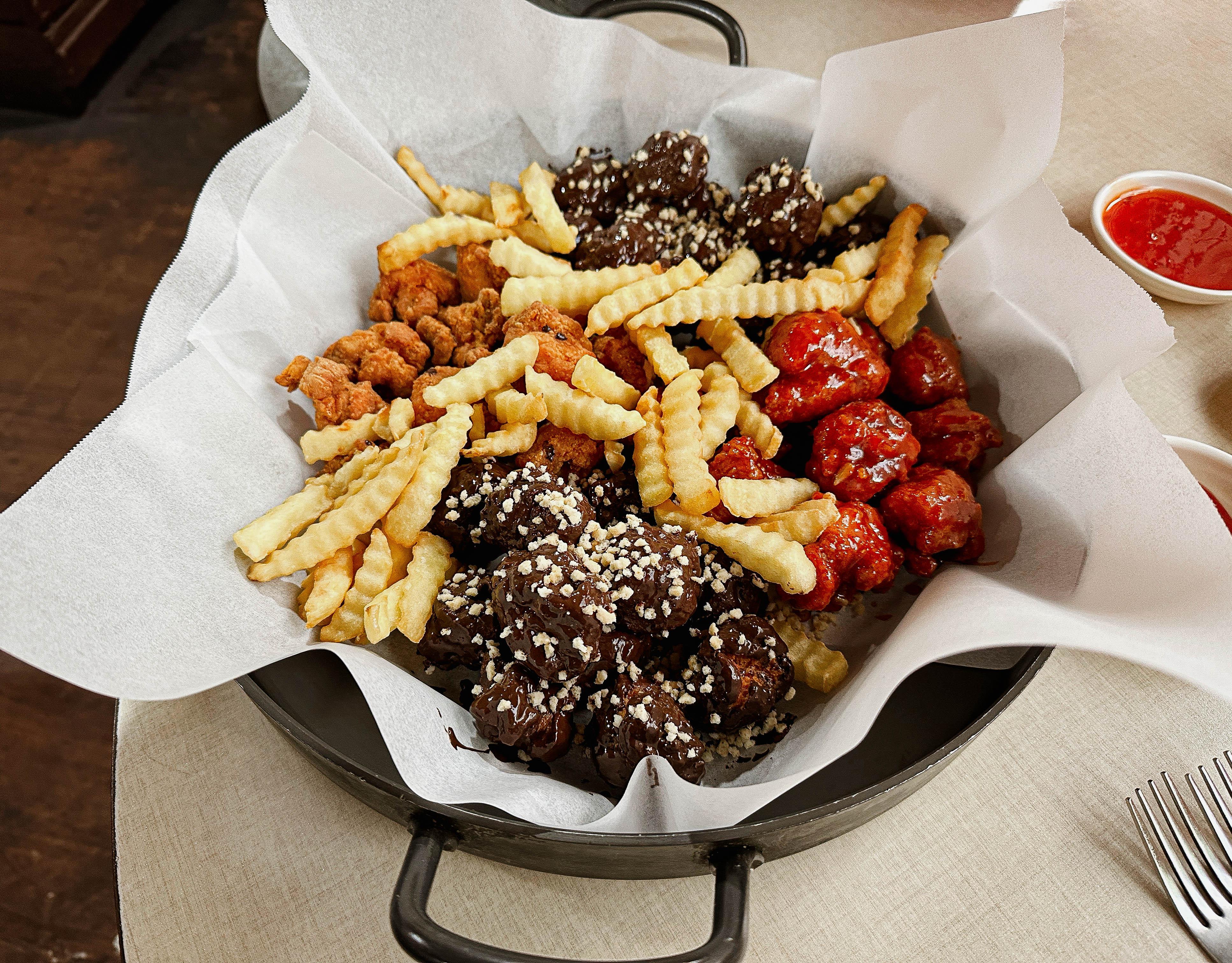 초코치킨은 원래 초콜릿치킨, 양념치킨, 후라이드치킨, 어니언치킨으로 구성되어 있는데, 어니언치킨을 제가 좋아하지는 않아서 후라이드와 양념치킨 그리고 초콜릿치킨으로만 구성해 달라고 부탁드렸습니다. 직접 사장님께서 초콜릿을 녹여서 만든 초콜릿 강정 같은 치킨은 아직까지도 적응이 되지 않는 특이한 맛이었습니다.