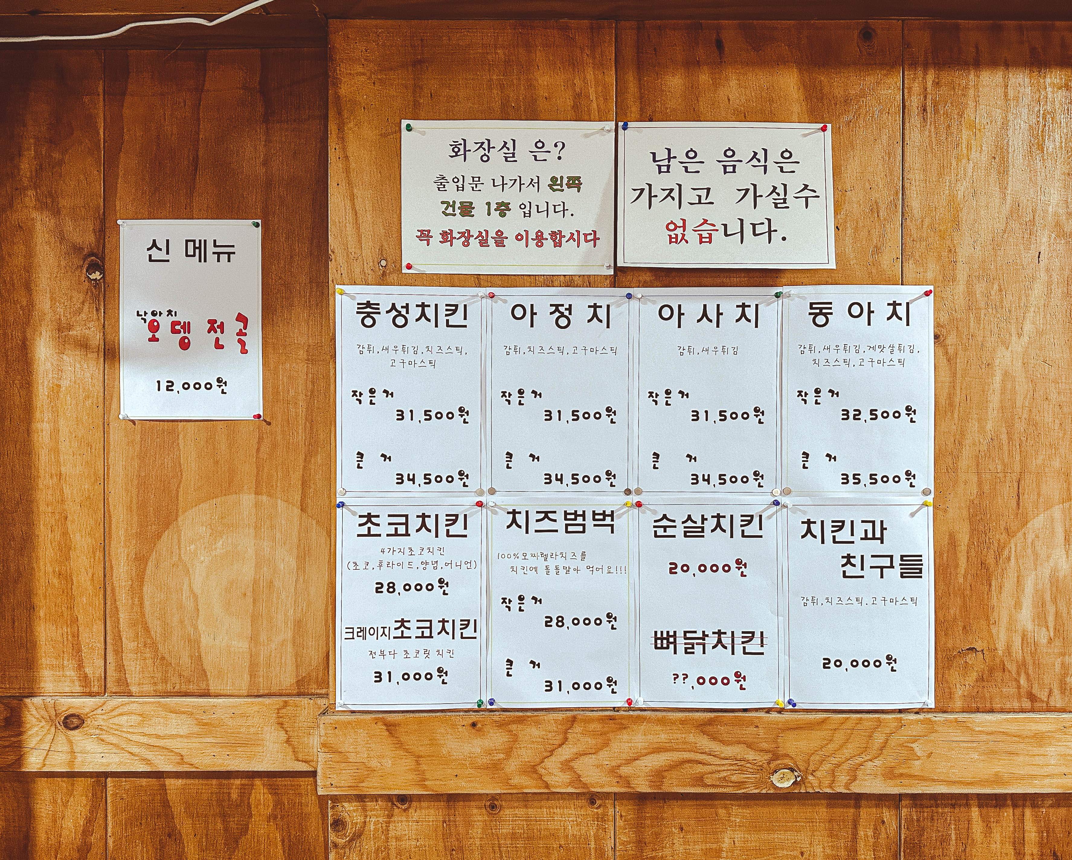 봉천동 동네아저씨치킨은 충성치킨, 아정치, 아사치, 동아치, 초코치킨, 크레이지초코치킨, 치즈범벅, 순살치킨, 치킨과친구들, 오뎅전골 등이 있었습니다. 사실 초콜릿치킨으로도 유명하지만, 서울대 학생들이 많이 찾는 가게인만큼 가성비 넘치는 치킨집으로도 유명한 가게였습니다. 저희는 초코치킨(초콜릿, 프라이드, 양념, 어니언)을 주문했습니다.