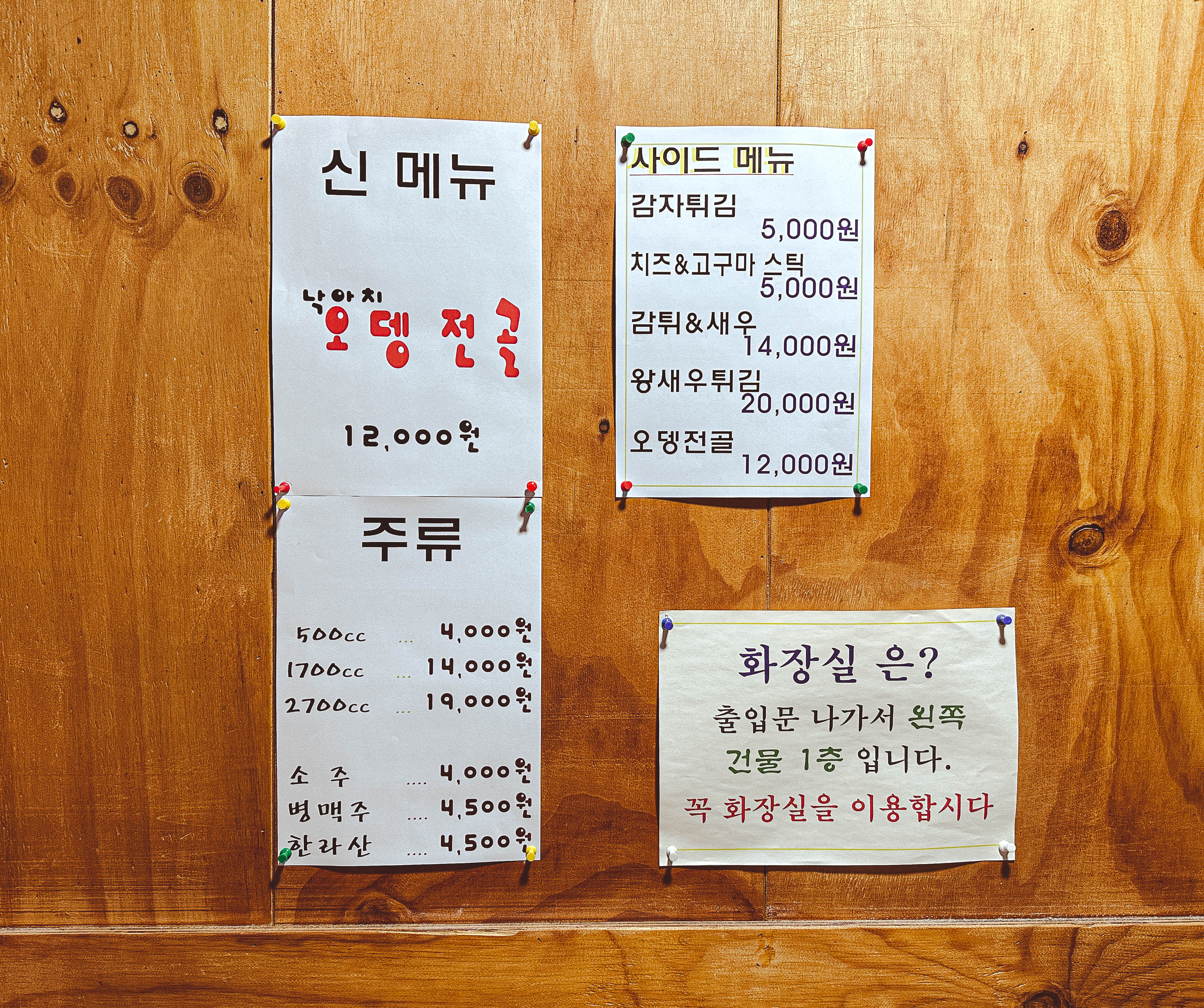 봉천동 동네아저씨치킨은 충성치킨, 아정치, 아사치, 동아치, 초코치킨, 크레이지초코치킨, 치즈범벅, 순살치킨, 치킨과친구들, 오뎅전골 등이 있었습니다. 사실 초콜릿치킨으로도 유명하지만, 서울대 학생들이 많이 찾는 가게인만큼 가성비 넘치는 치킨집으로도 유명한 가게였습니다. 저희는 초코치킨(초콜릿, 프라이드, 양념, 어니언)을 주문했습니다.