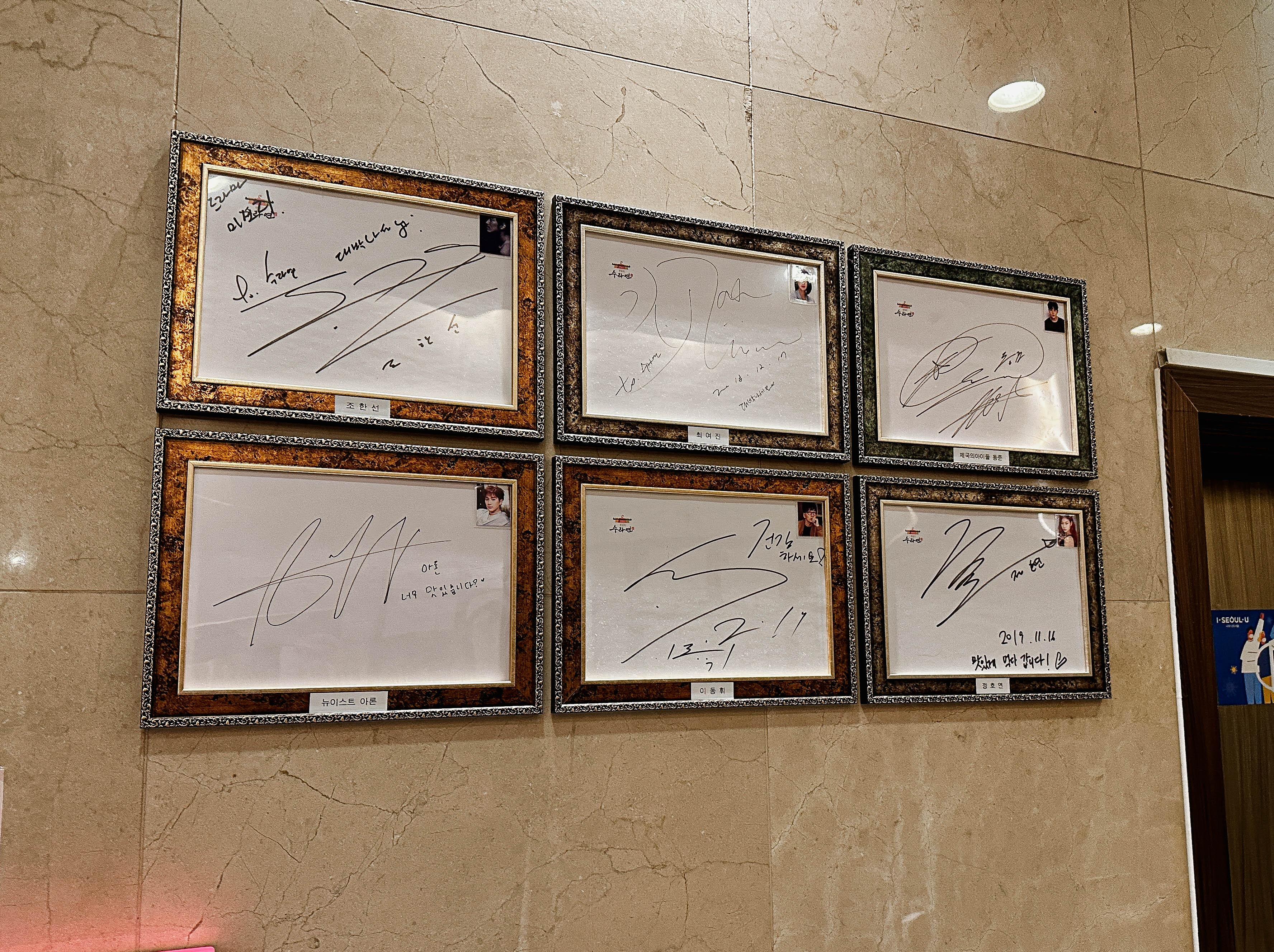 수라연은 서울 강동구 성내동 451-2, 2층에 위치해 있습니다. 저는 친구와 함께 자가용으로 이용했는데, 주차도 편리하고 가게도 꽤 크고 널찍해서 단체식사모임에도 불편하지 않아 보였습니다. 가게 곳곳에는 유명인들의 사인이 액자로 전시되어 있었습니다.
