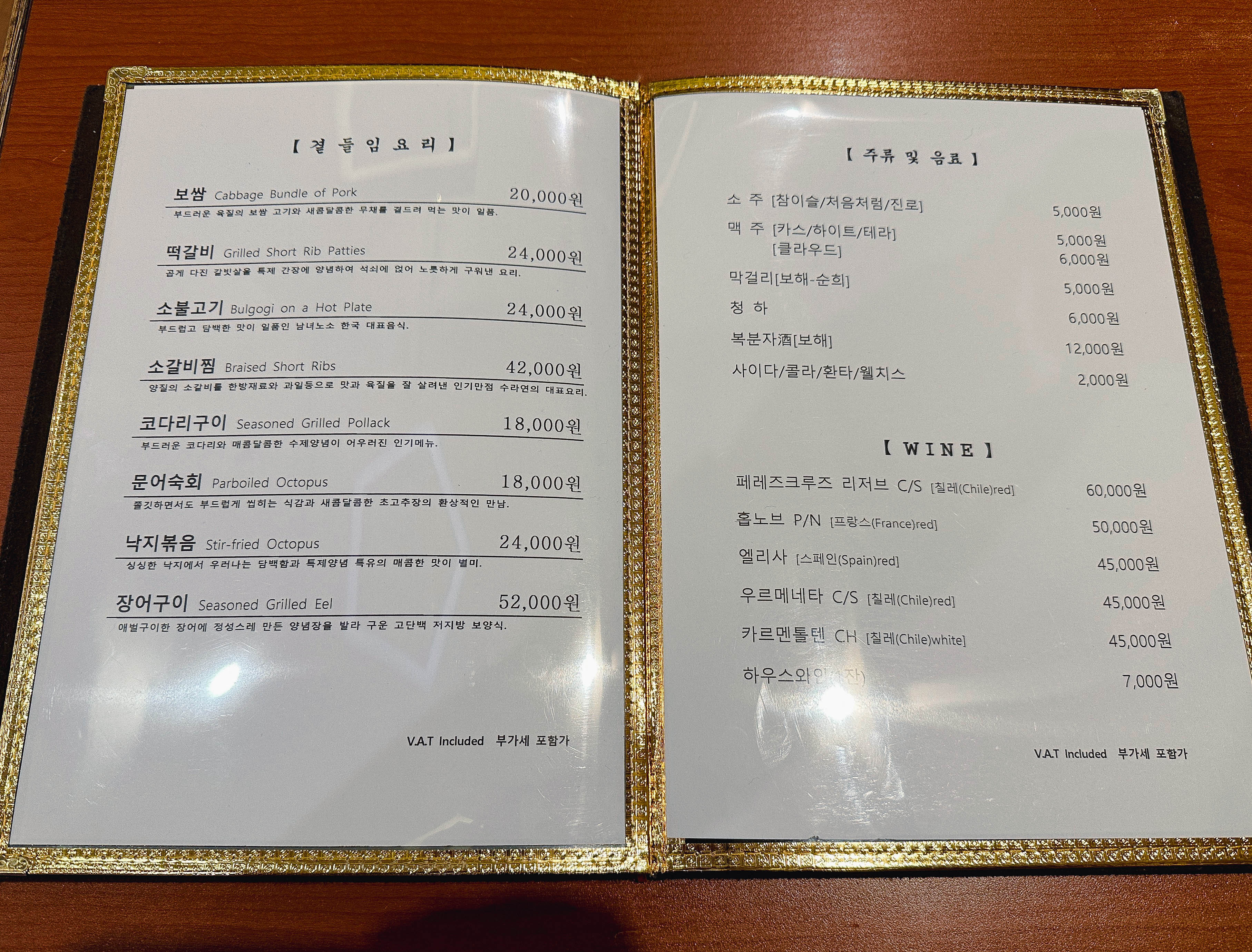 메뉴는 수차림, 떡갈비한상차림 두 가지 종류가 있었고, 곁들임으로 단품메뉴를 추가할 수도 있었습니다. 저희는 1인 21,000원 메뉴인 수(水)차림을 주문했습니다. 이 메뉴는 보쌈, 간장게장, 생선구이 등 정찬이 차려지는 메뉴라고 합니다.