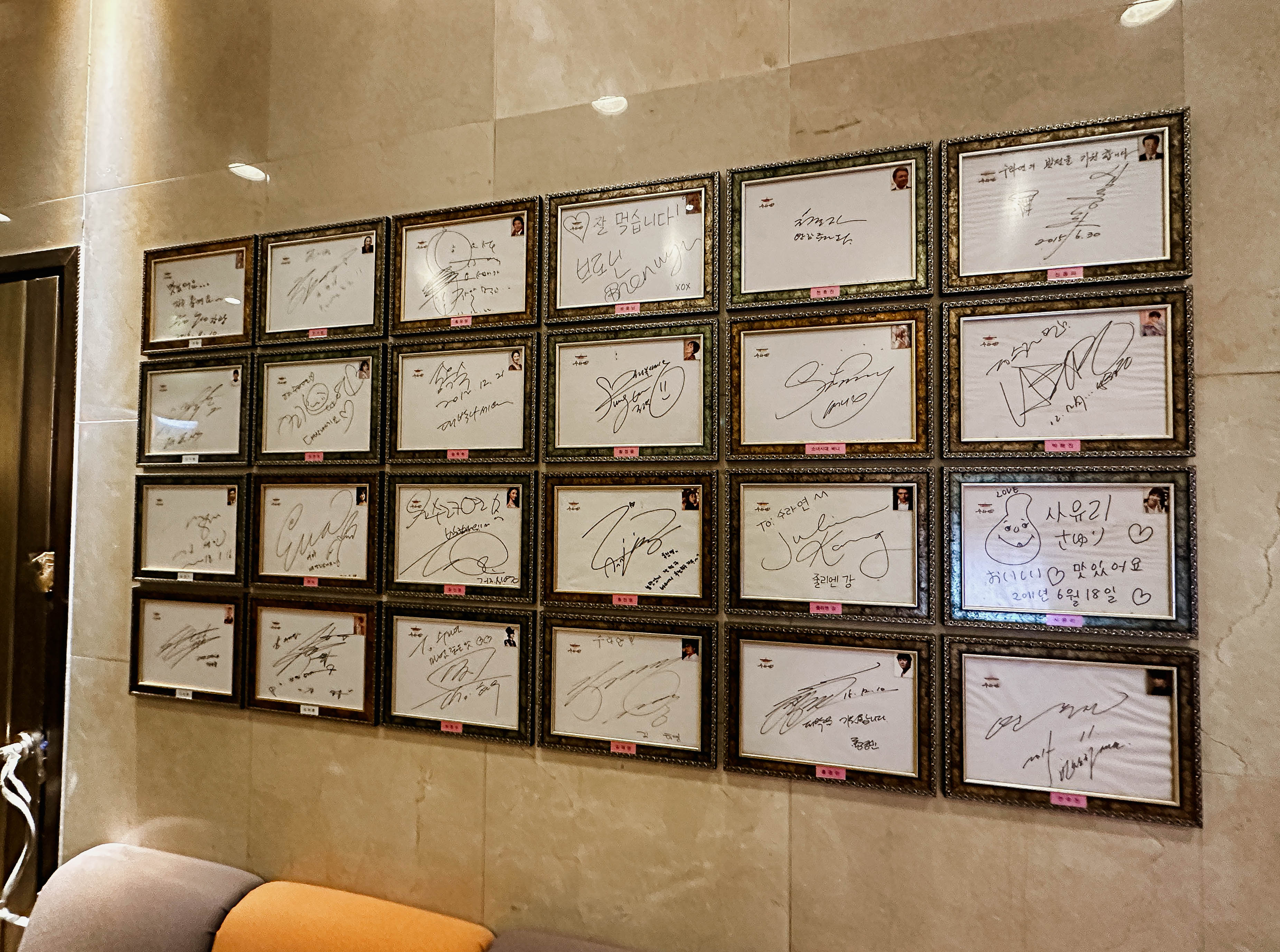 수라연은 서울 강동구 성내동 451-2, 2층에 위치해 있습니다. 저는 친구와 함께 자가용으로 이용했는데, 주차도 편리하고 가게도 꽤 크고 널찍해서 단체식사모임에도 불편하지 않아 보였습니다. 가게 곳곳에는 유명인들의 사인이 액자로 전시되어 있었습니다.