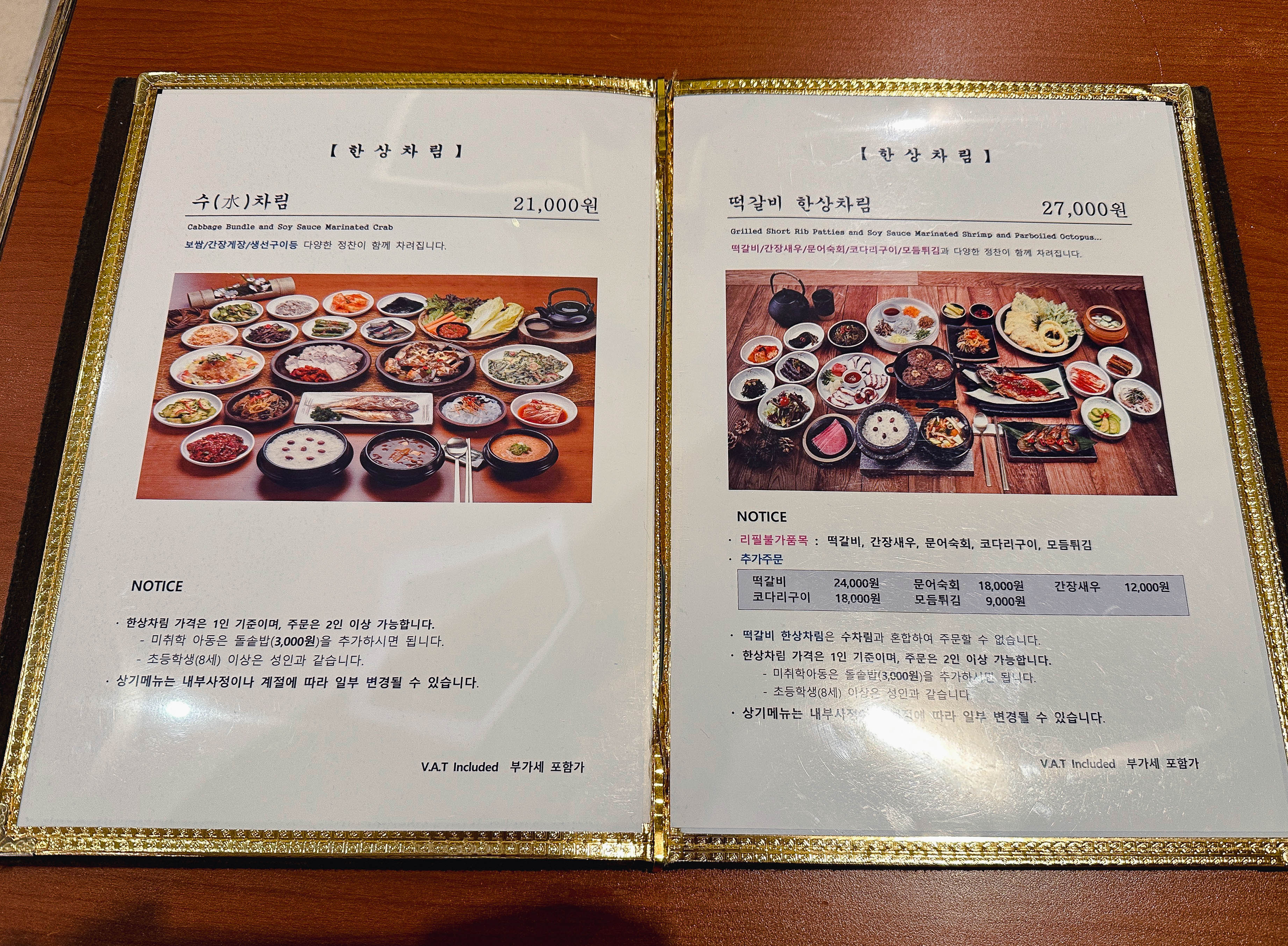 메뉴는 수차림, 떡갈비한상차림 두 가지 종류가 있었고, 곁들임으로 단품메뉴를 추가할 수도 있었습니다. 저희는 1인 21,000원 메뉴인 수(水)차림을 주문했습니다. 이 메뉴는 보쌈, 간장게장, 생선구이 등 정찬이 차려지는 메뉴라고 합니다.