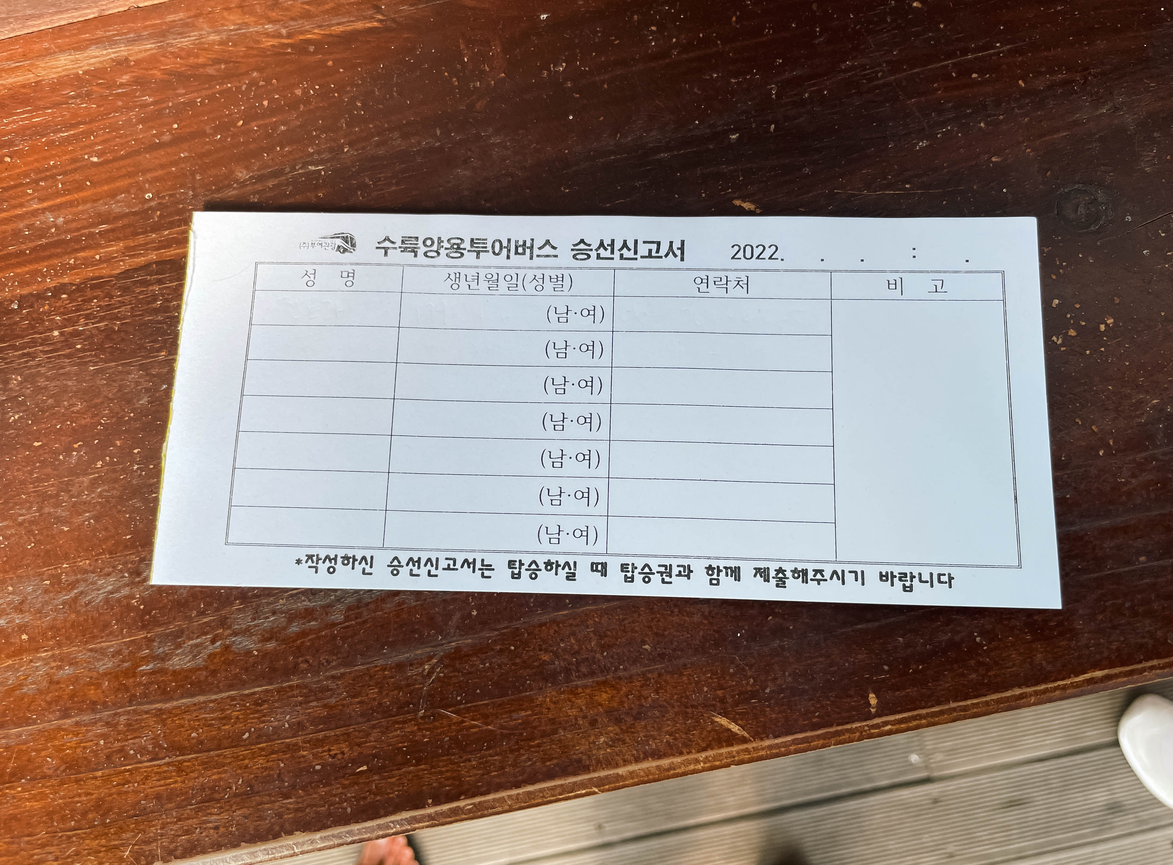 승선신고서를 작성하고 예약한 내용으로 이용권을 발권받았습니다. 백제문화관광단지 입장권은 별도로 받아야 하지만, 내용이 너무 길어지기 때문에 백제문화단지 2부(링크)로 나눠서 소개하는 것으로 하겠습니다. 승선신고서와 탑승권을 가지고 탑승장으로 갔습니다.