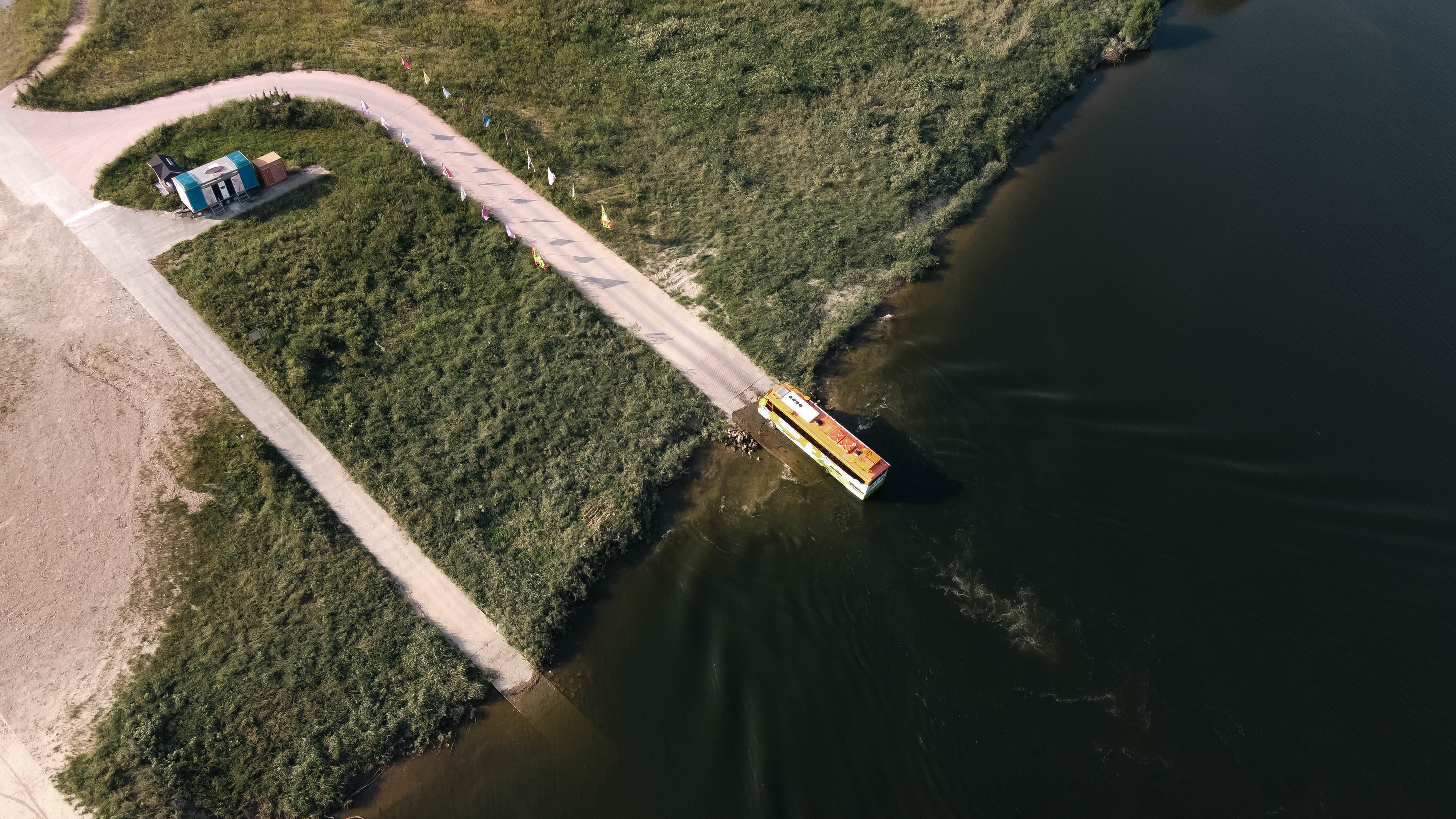 탑승장에서 기다리면 물 위를 달리는 수륙양용버스가 도착합니다. 수륙양용버스에 승선하는데 이 버스는 독특하게 버스의 옆문이 계단처럼 사용되더라고요.