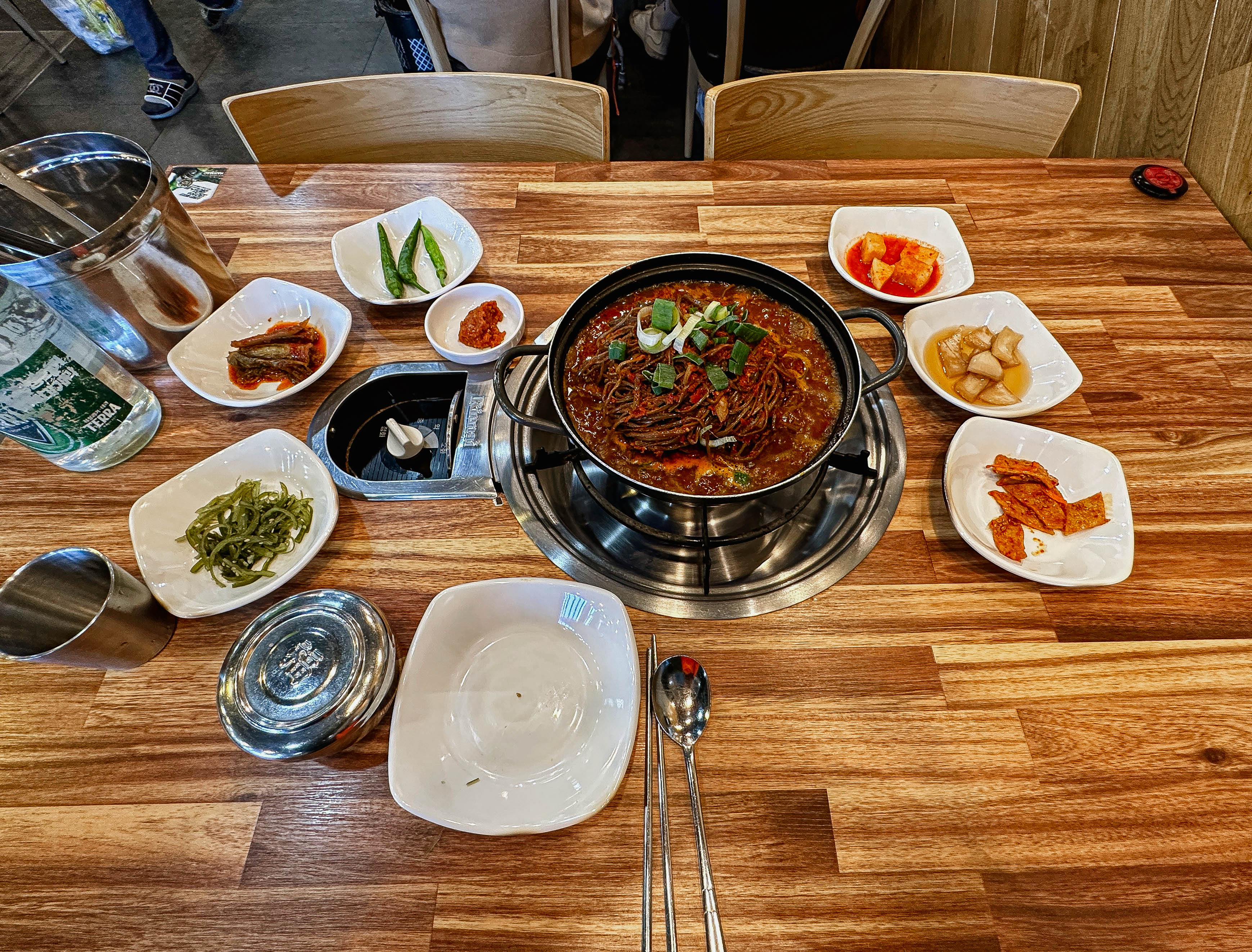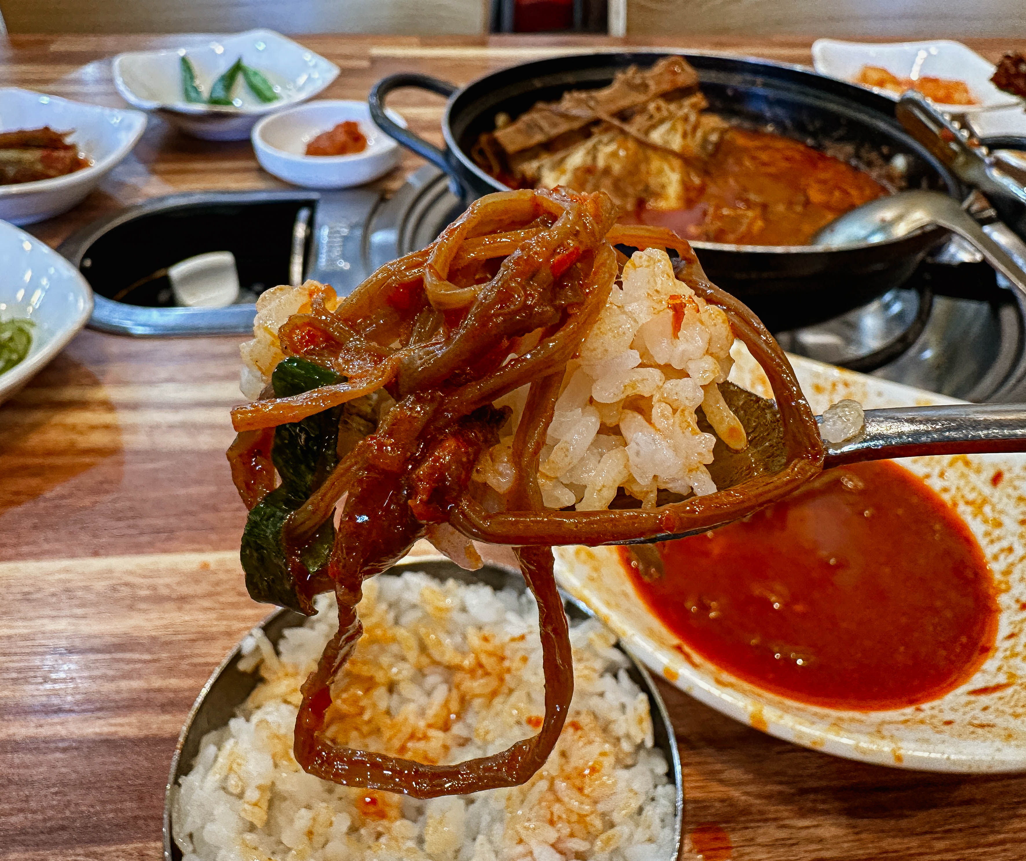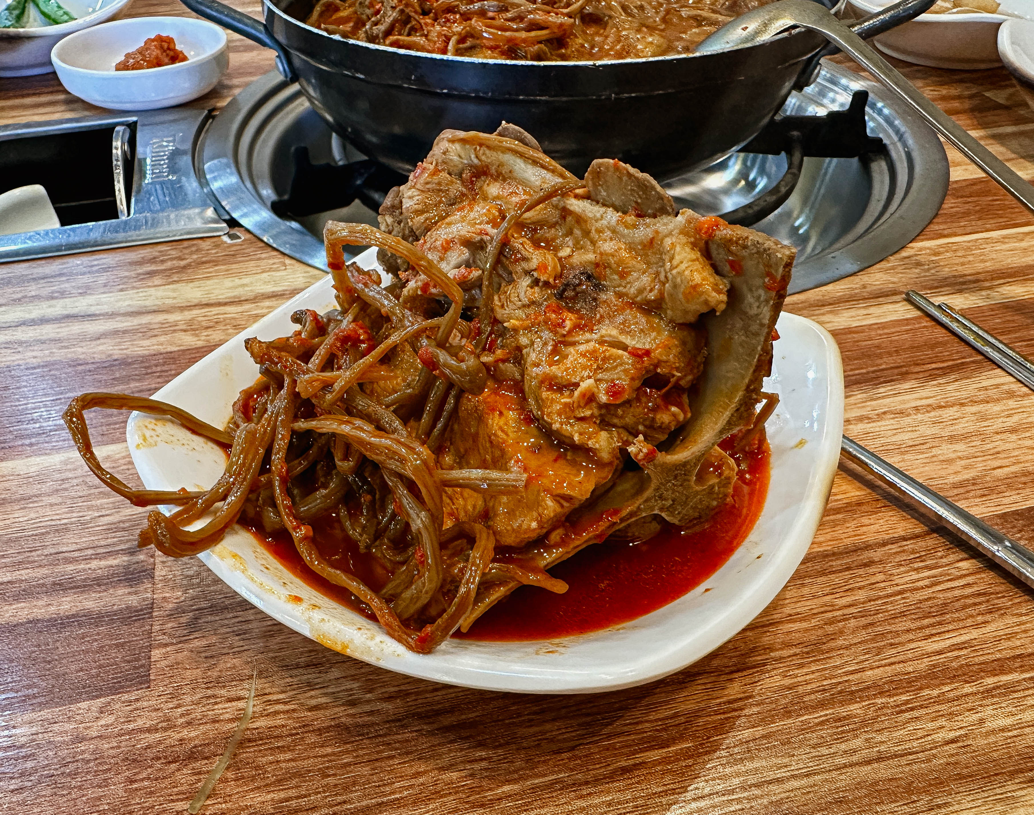 감자탕의 메뉴는 위와 같이 나왔습니다. 반찬들은 깔끔하게 잘 나오는 편이었고, 1인분을 주문했는데도 전골냄비에 주고 있었습니다. 고구마순이 꽤 많은 양이 나왔고, 국물이 진해서 마치 어머니께서 끓여주신 고구마순 찌개를 먹는듯한 느낌을 주었습니다.