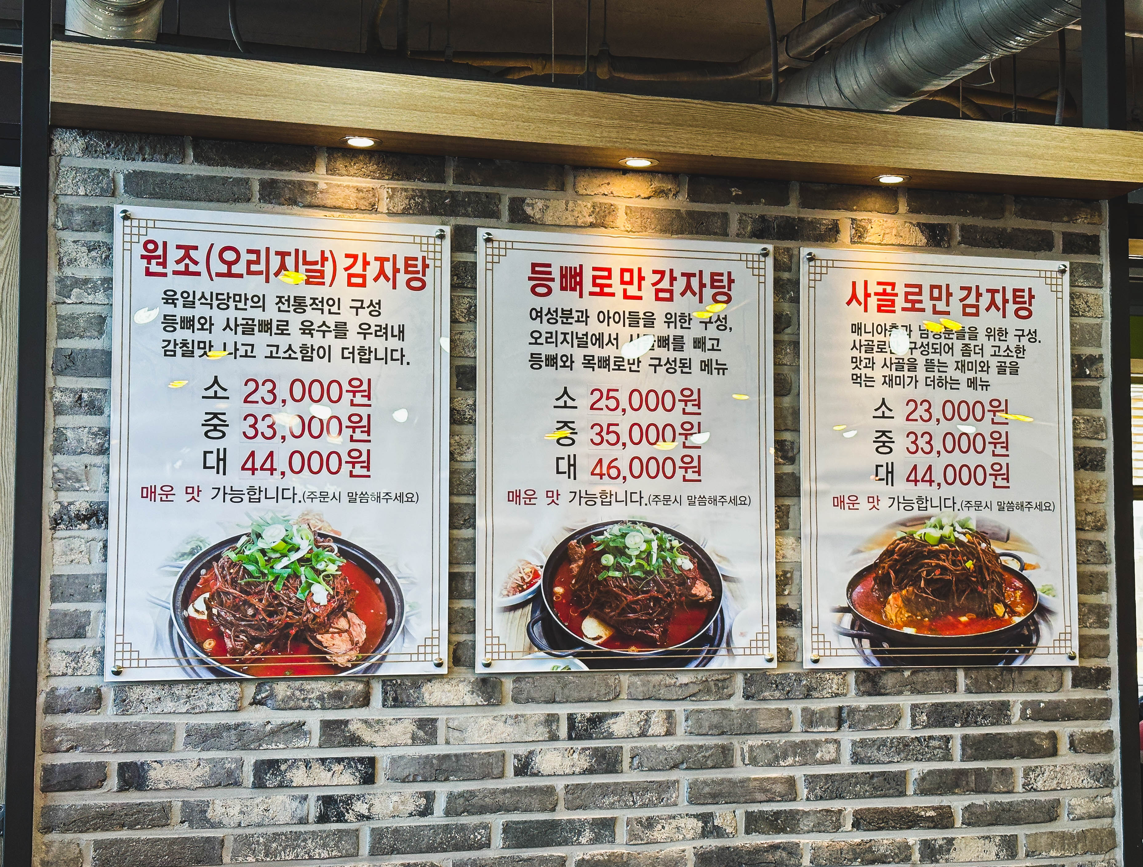 전주 육일식당의 메뉴는 원조감자탕, 등뼈로만감자탕, 사골로만감자탕, 뼈추가, 고구마순추가, 우동사리, 라면사리 등이 있었습니다. 육일식당은 쌀과 고기, 고춧가루 등을 모두 국내산을 사용하고 있다고 합니다. 제가 대부분 갔던 감자탕 가게들 중에 국내산 돼지고기를 사용하면 조금 퍽퍽한 느낌이 있던데, 이곳은 어떨지 궁금하더라고요.