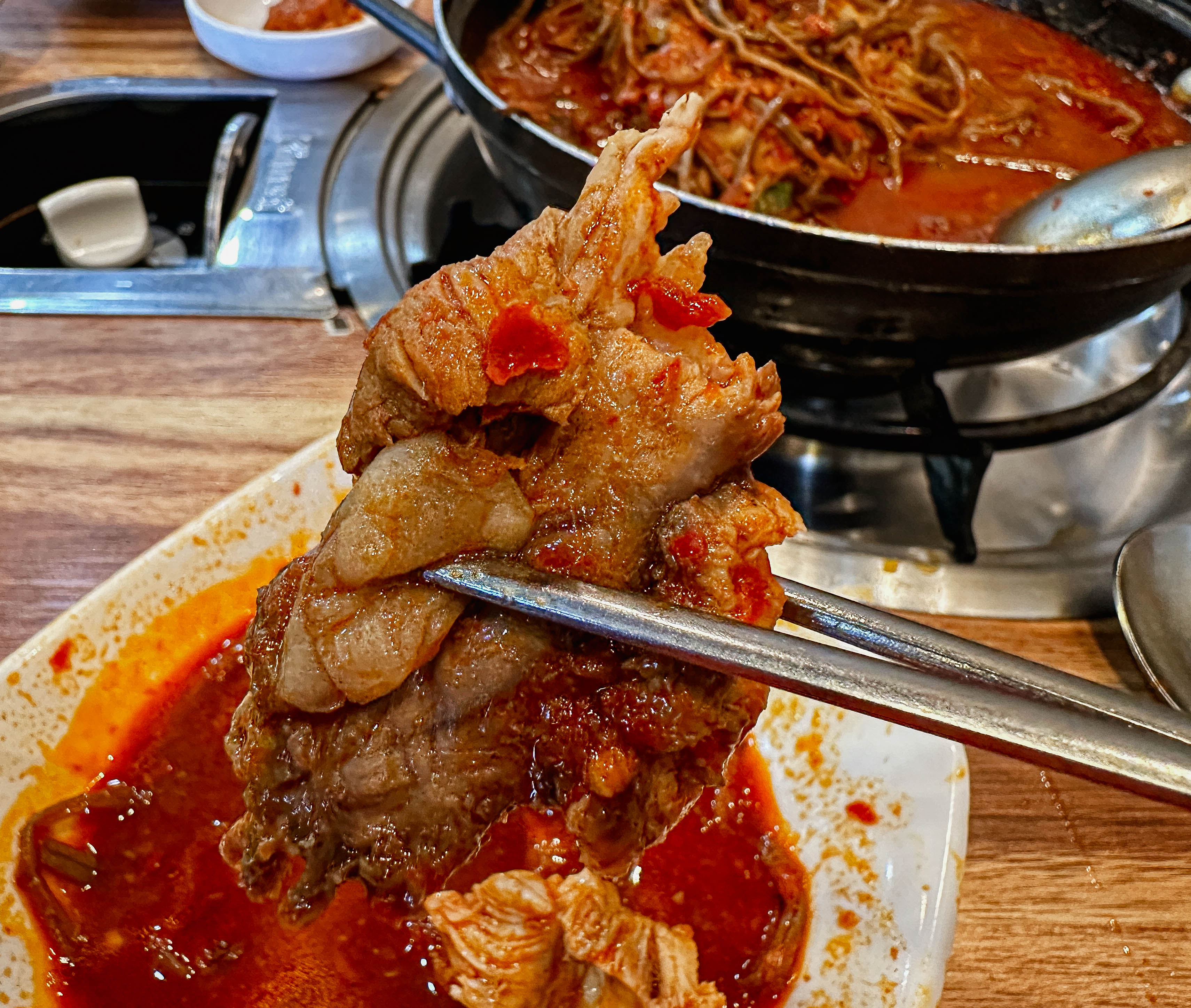 감자탕의 메뉴는 위와 같이 나왔습니다. 반찬들은 깔끔하게 잘 나오는 편이었고, 1인분을 주문했는데도 전골냄비에 주고 있었습니다. 고구마순이 꽤 많은 양이 나왔고, 국물이 진해서 마치 어머니께서 끓여주신 고구마순 찌개를 먹는듯한 느낌을 주었습니다.