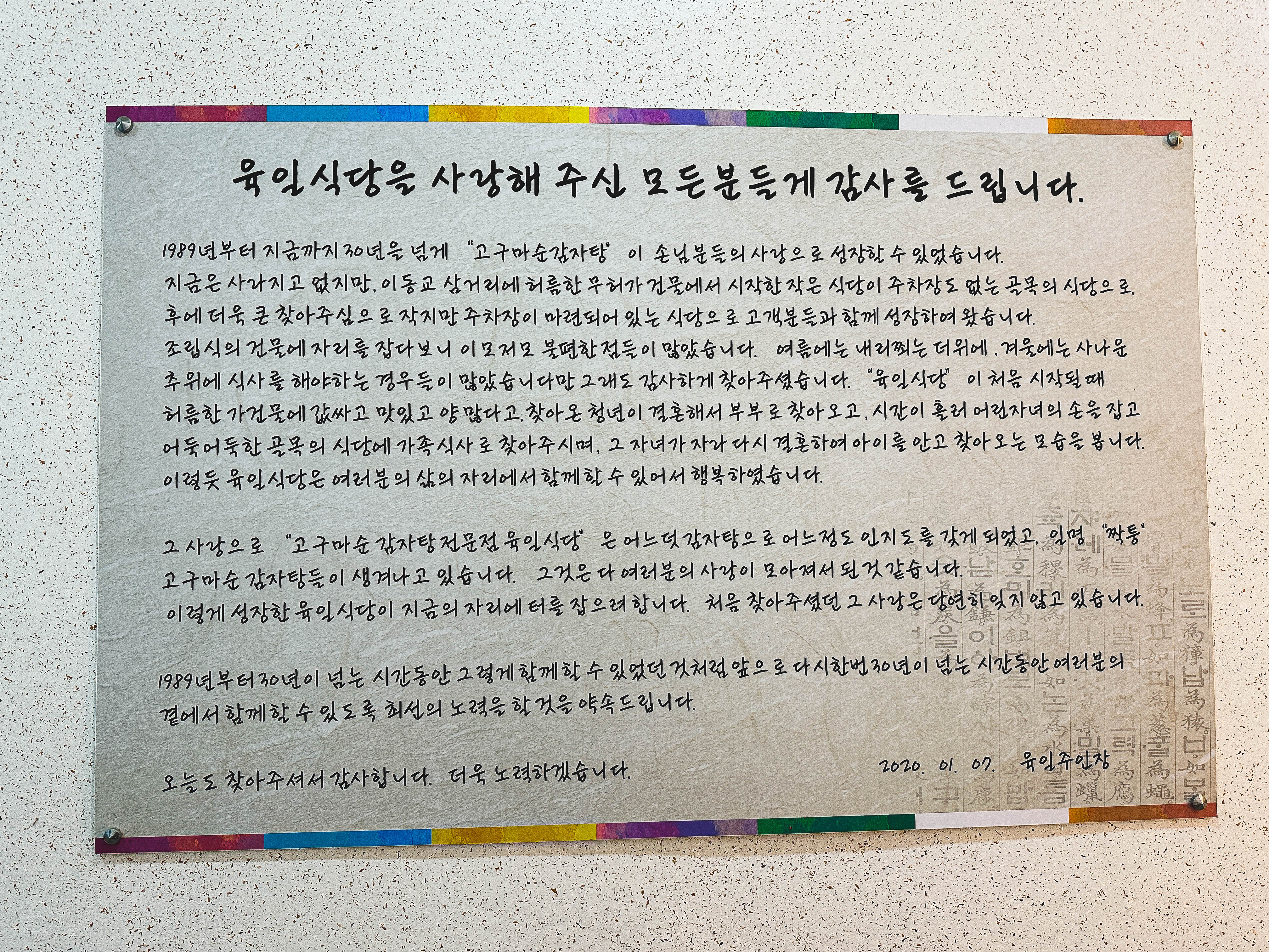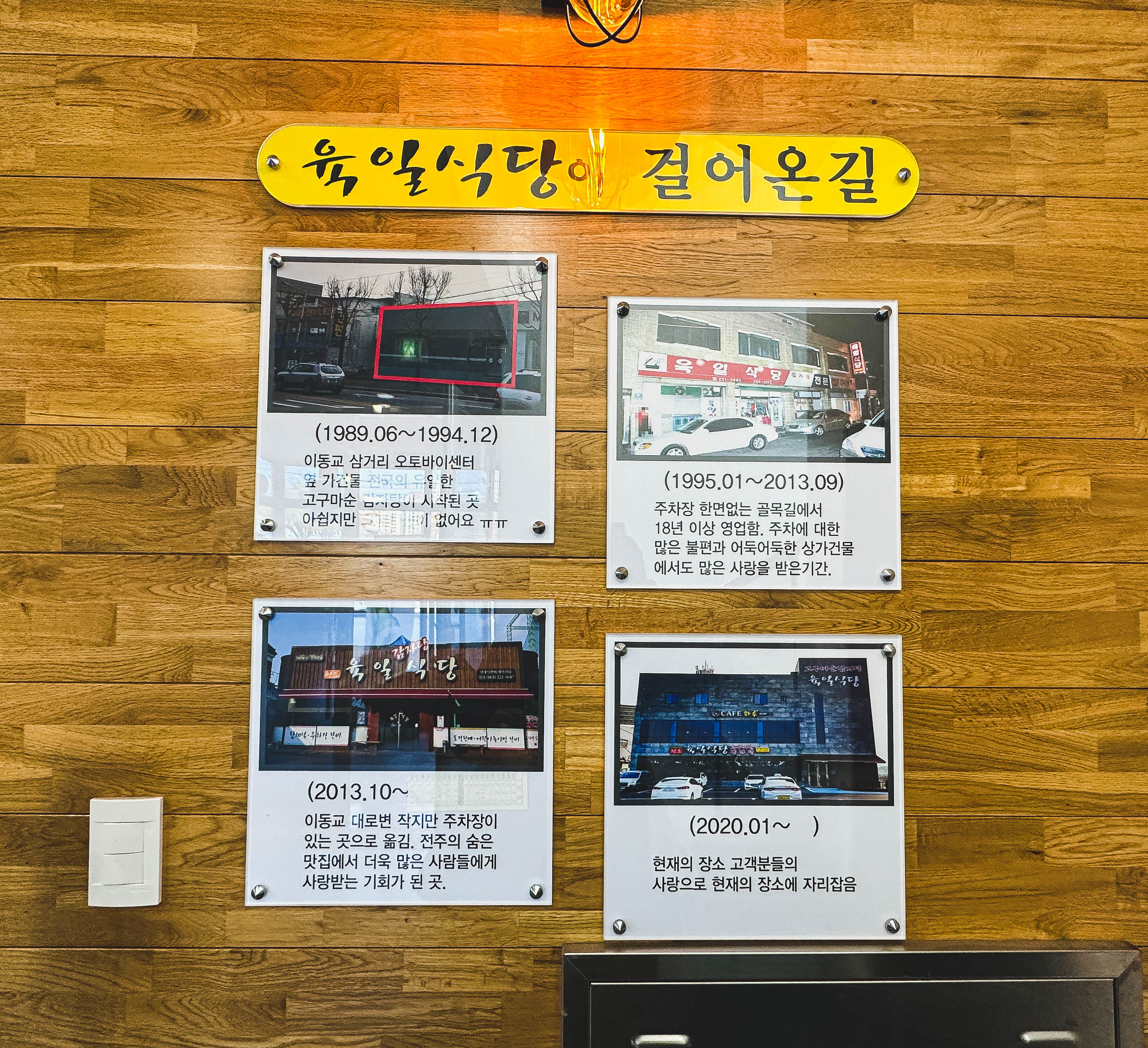 육일식당 가게의 위치는 전북 전주시 완산구 삼천동2가 275-3, 1층에 위치해 있었습니다. 주차장도 널찍하고 건물은 새로 지어 깔끔하고 좋았습니다. 가게에 적혀있는 안내문을 보면 1989.06. 처음 개업한 이후 확장하여 현재 위치에서 영업을 하고 있다고 하더라고요.