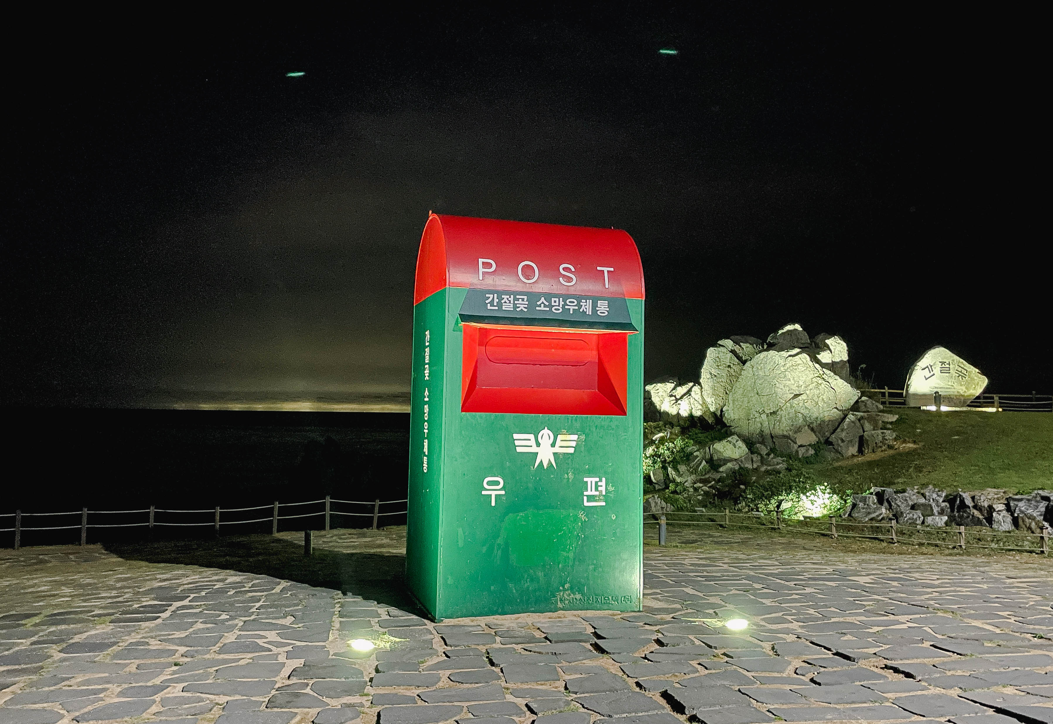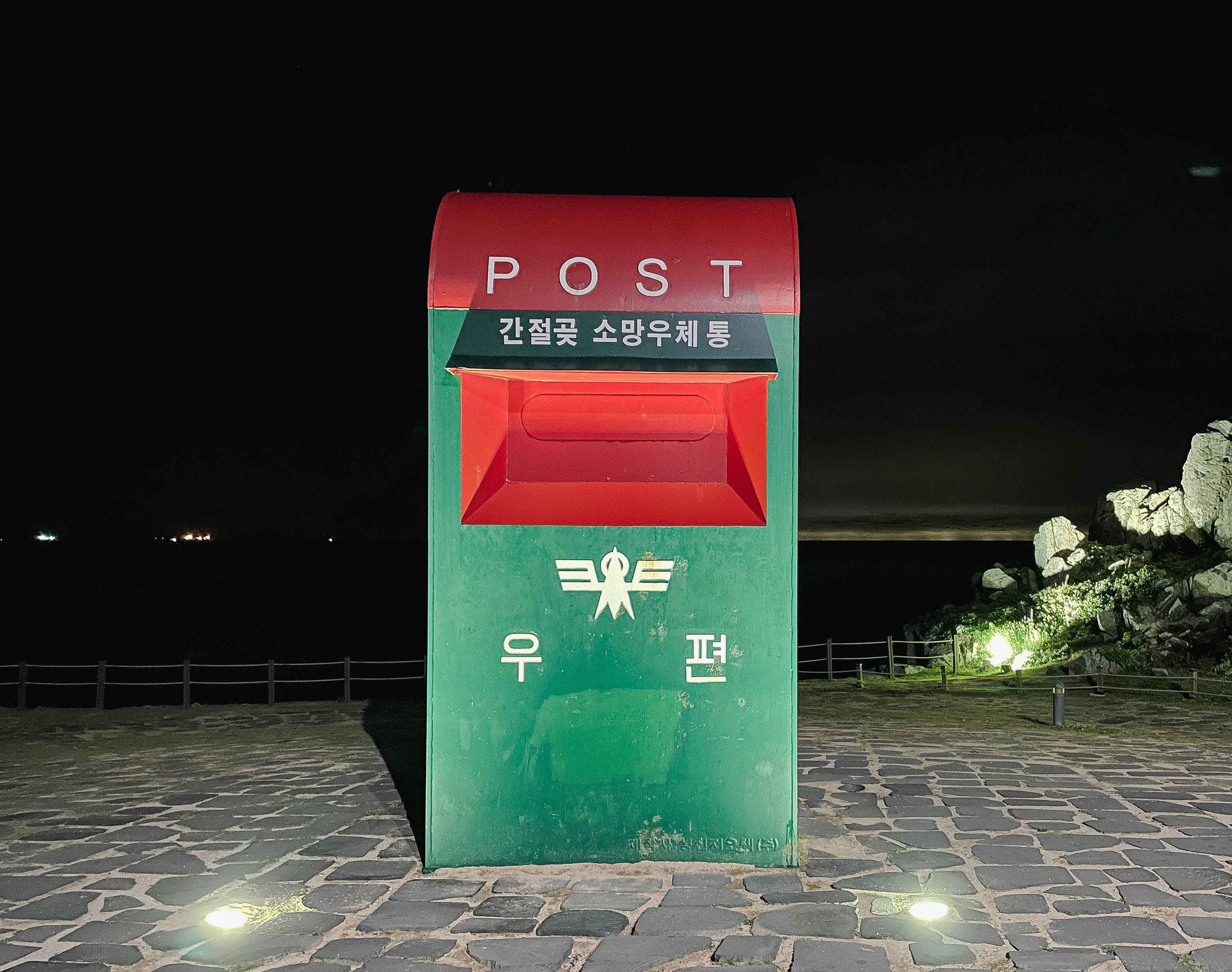 간절곶에 자정이 가까운 시간에 방문해서 사람도 없고 한적한 분위기였고, 곳곳에 동상들과 함께 포항 호미곶의 느린 우체통처럼 소망 우체통이라는 커다란 우체통이 마련되어 있었습니다.