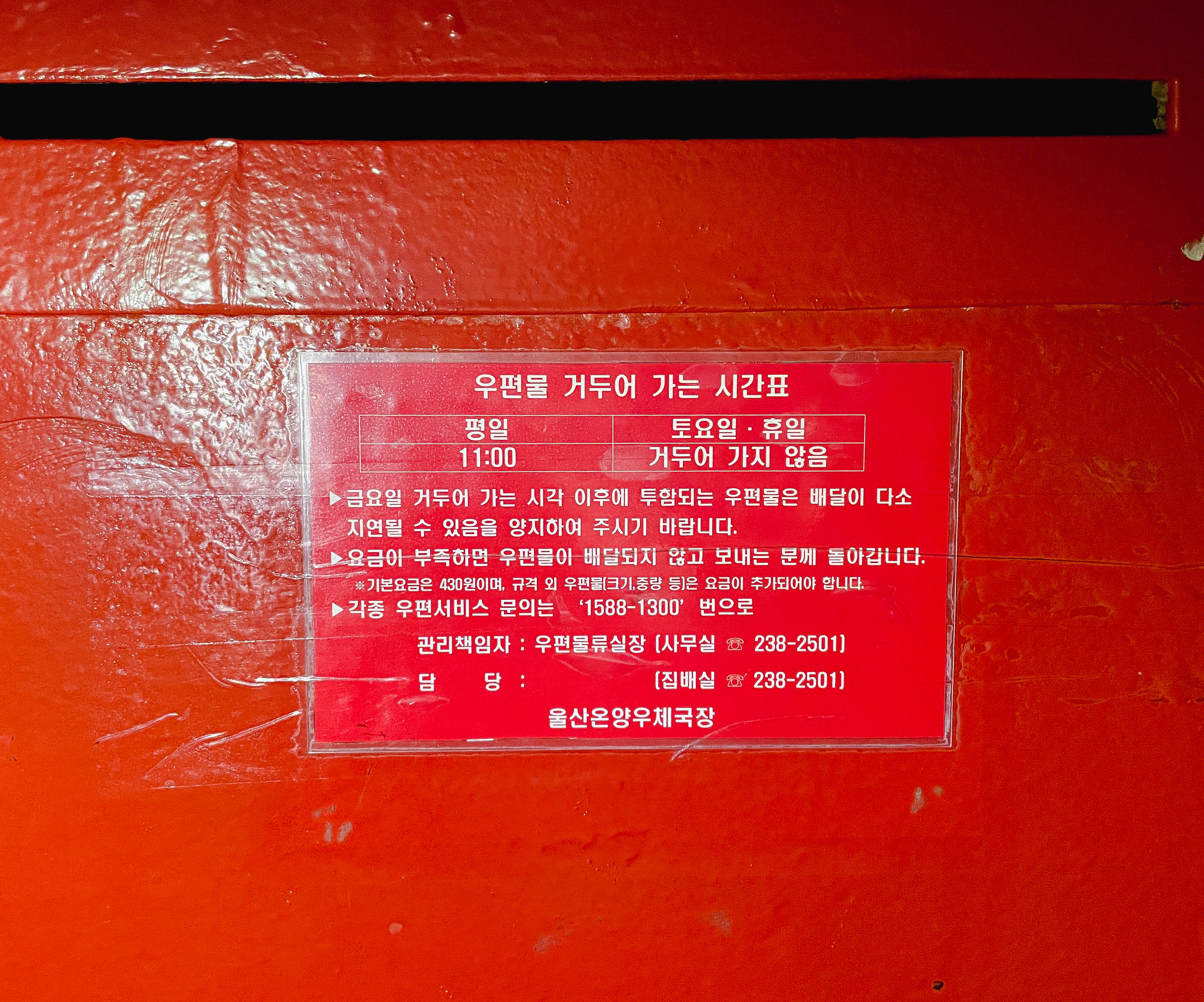 간절곶 소망우체통 안에는 사람이 들어갈 수 있는 널찍한 공간이 있었는데, 실제로 우체통 기능을 하도록 우편함이 마련되어 있었고, 우체국에서 평일 오전 11시마다 우편물을 수거해 간다고 적혀있었습니다.