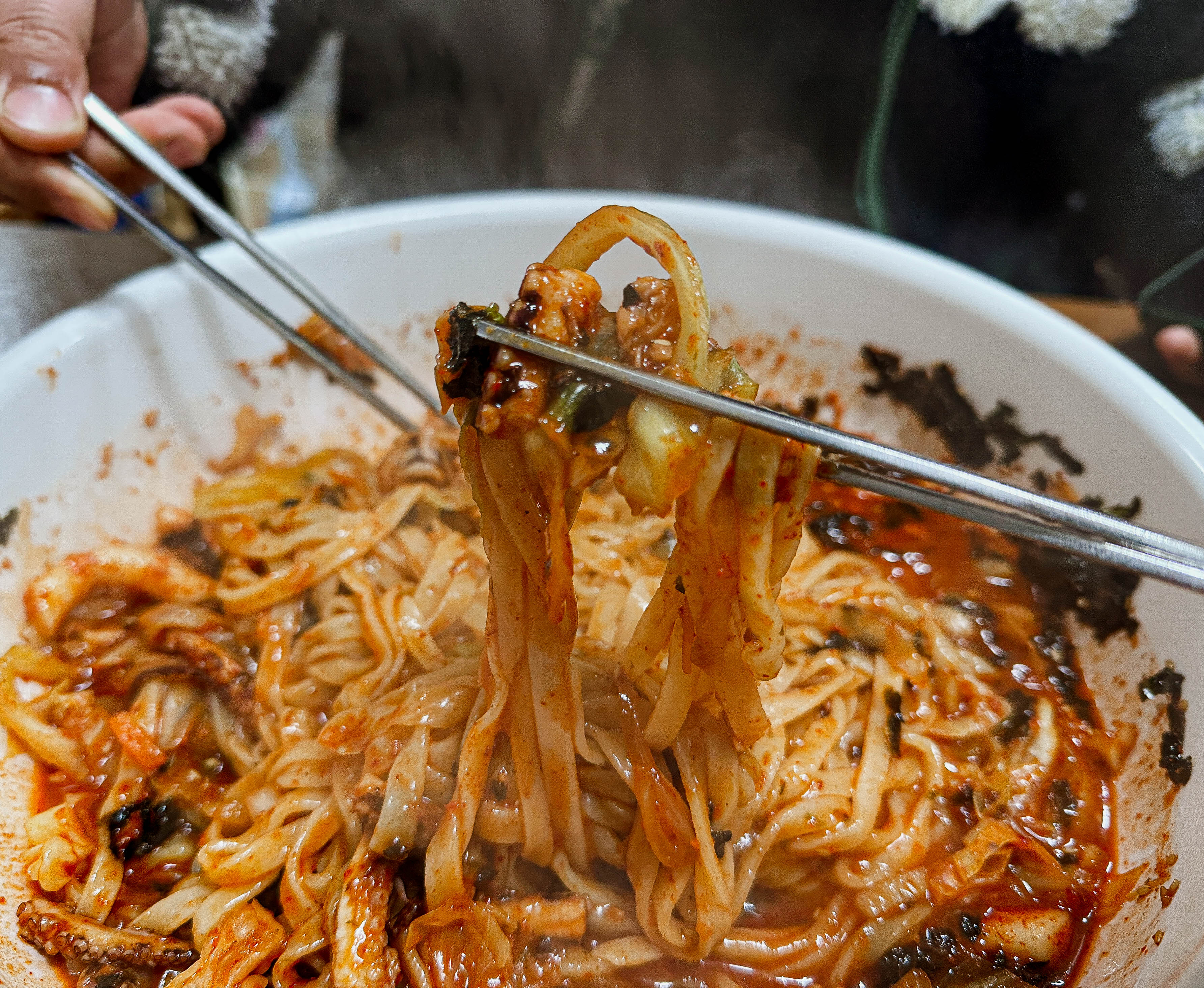 면낙지는 살짝 매콤한 형태의 낙지볶음과 칼국수의 조합이 신선했는데, 살짝 매운맛이 강한 편이었지만 얼큰하게 당기는 맛이 계속 손이 가게 만드는 것 같았습니다. 하지만 단점이 있다면 면낙지 속 낙지가 쫄깃한 식감보다는 냉동되었던 것처럼 툭툭 끊기는 식감이 있어 아쉬웠습니다.