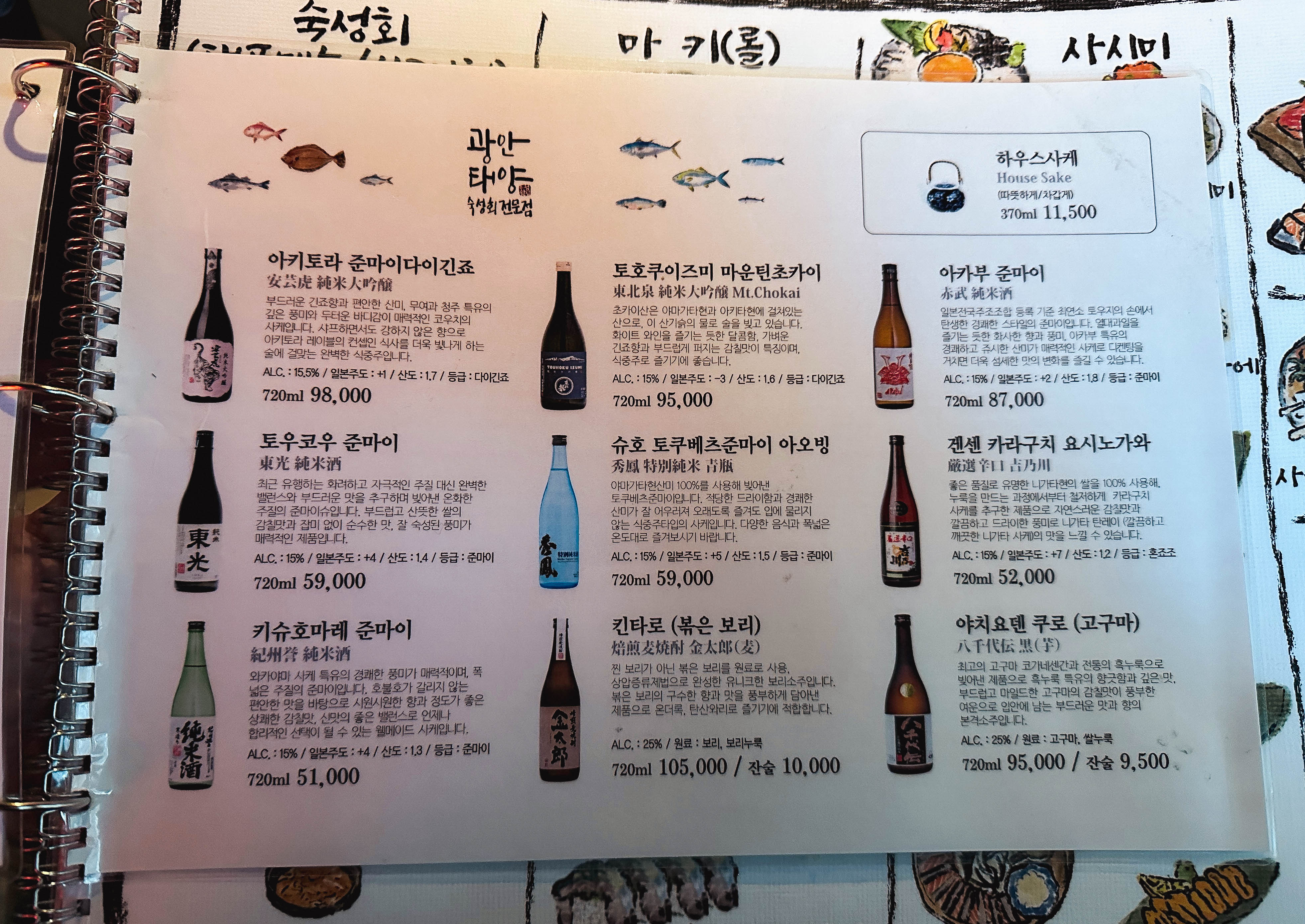 부산 광안태양의 메뉴는 위와 같습니다. 크게 분류해 제철메뉴, 숙성회, 마키(롤), 사시미, 볏짚타다키, 탕, 튀김, 숯불구이, 꼬치구이, 초밥, 사이드 메뉴가 있었습니다. 그밖에 회와 곁들일 주류를 판매하고 있었습니다. 저희는 '숙성회'와 '참치마키'를 주문했습니다.