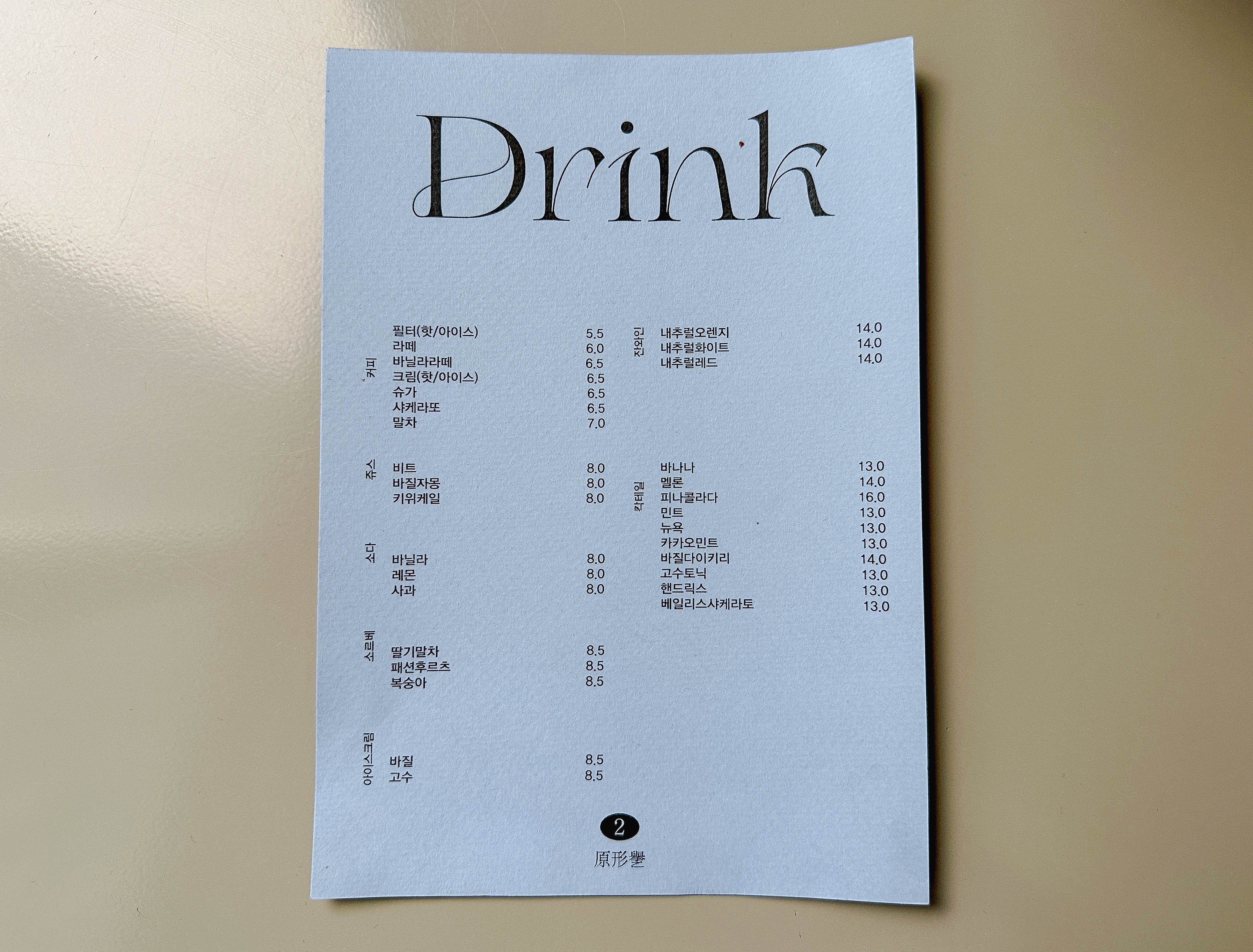 원형들의 메뉴를 함께 살펴보시죠. 커피, 주스, 소다, 소르베, 아이스크림, 잔와인, 칵테일, 퀸아망, 케이크, 세트, 크림치즈스틱 등이 있었습니다. 제가 흥미 있게 보았던 것은 케이크 종류여서 케이크를 소개해드릴 텐데, 이곳은 핑크딜, 고수크림, 봄동케이크 가 있었습니다. 그 밖에도 이 가게에 재미있는 상품들이 많이 있었습니다.